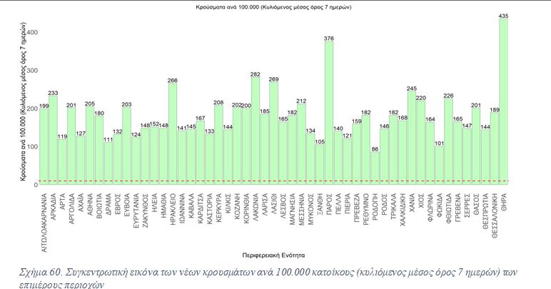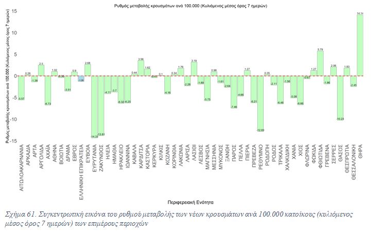 Η αποτύπωση των τάσεων στις επιμέρους περιοχές, παρουσιάζεται στο Σχήμα 61, όπου παρουσιάζεται ο ρυθμός μεταβολής των νέων κρουσμάτων ανά 100.000 κατοίκους (κυλιόμενος μέσος όρος 7 ημερών) των επιμέρους περιοχών. Θετικές τιμές του ρυθμού μεταβολής υποδηλώνουν άνοδο, ενώ αρνητικές τιμές υποδηλώνουν πτωτική πορεία.