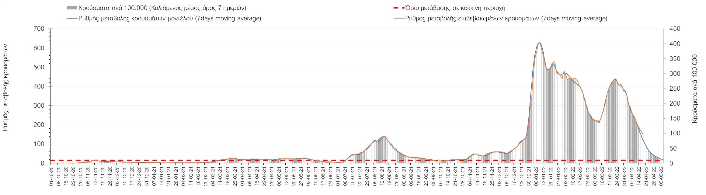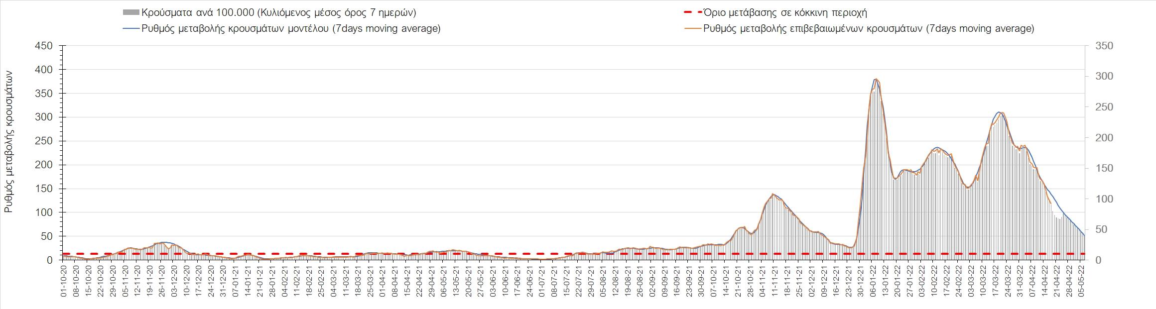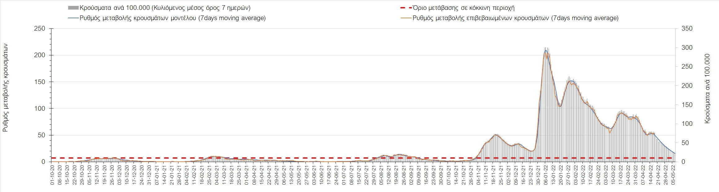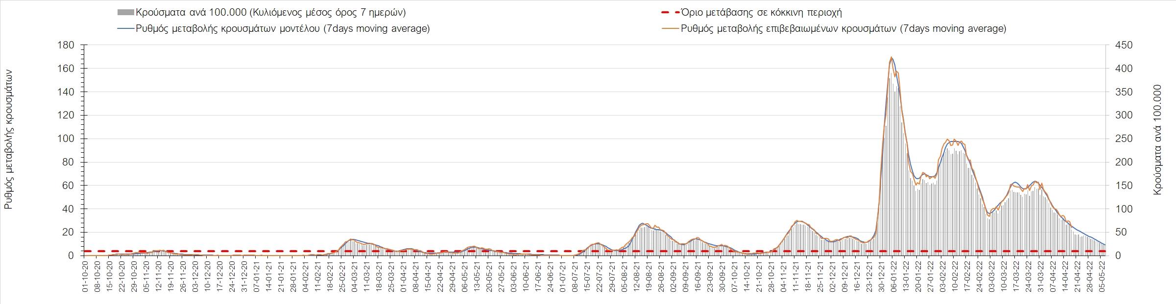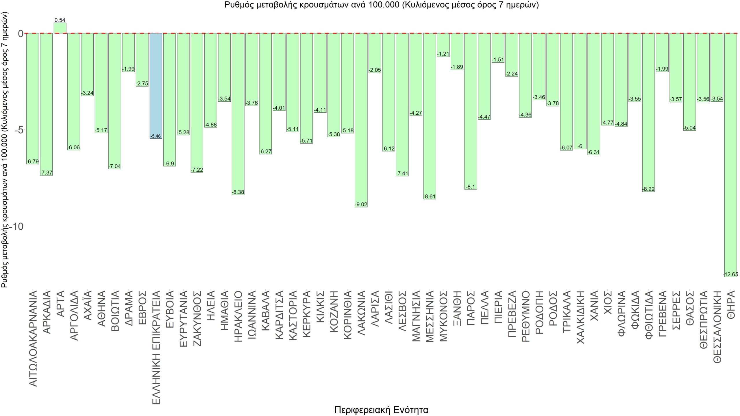 Η αποτύπωση των τάσεων στις επιμέρους περιοχές, παρουσιάζεται στο Σχήμα 61, όπου παρουσιάζεται ο ρυθμός μεταβολής των νέων κρουσμάτων ανά 100.000 κατοίκους (κυλιόμενος μέσος όρος 7 ημερών) των επιμέρους περιοχών. Θετικές τιμές του ρυθμού μεταβολής υποδηλώνουν άνοδο, ενώ αρνητικές τιμές υποδηλώνουν πτωτική πορεία.