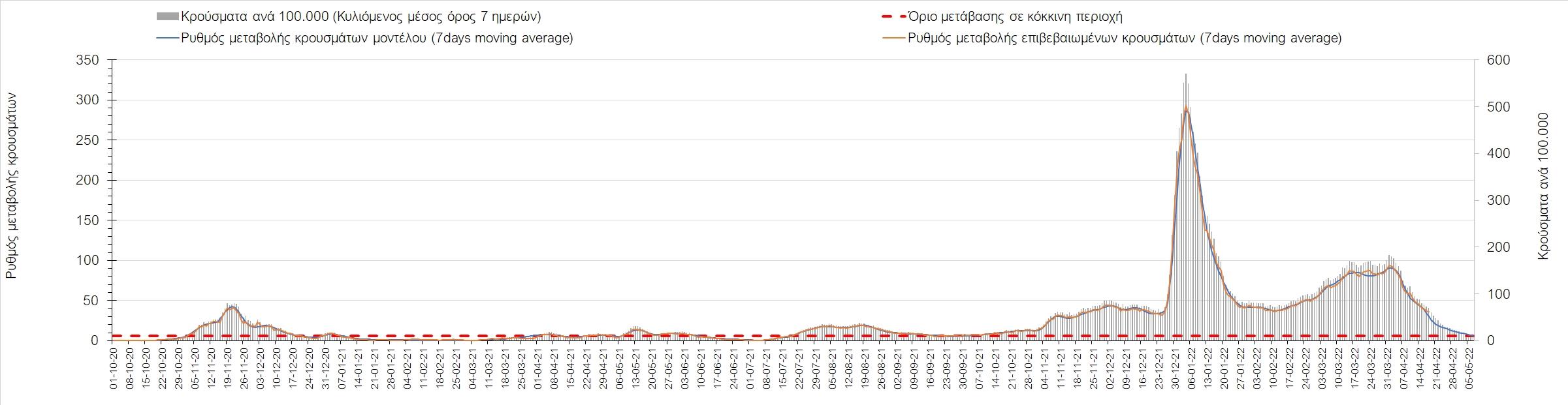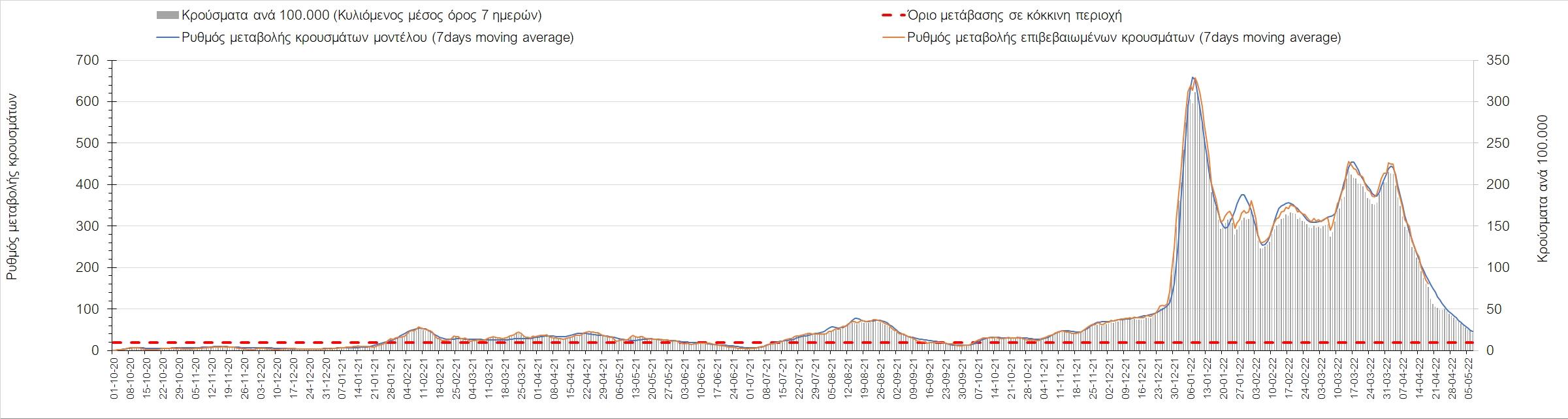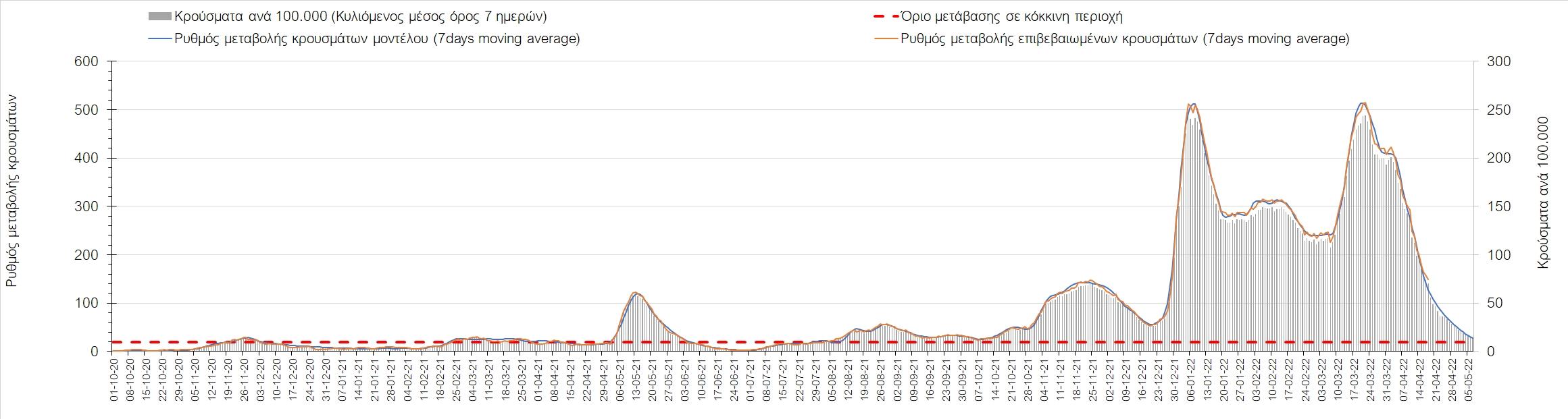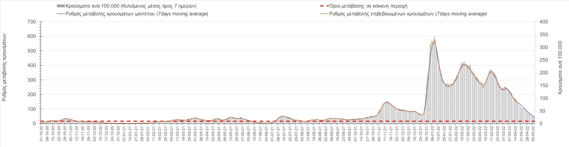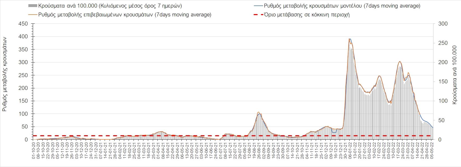 Η αποτύπωση των τάσεων στις επιμέρους περιοχές, παρουσιάζεται στο Σχήμα 61, όπου παρουσιάζεται ο ρυθμός μεταβολής των νέων κρουσμάτων ανά 100.000 κατοίκους (κυλιόμενος μέσος όρος 7 ημερών) των επιμέρους περιοχών. Θετικές τιμές του ρυθμού μεταβολής υποδηλώνουν άνοδο, ενώ αρνητικές τιμές υποδηλώνουν πτωτική πορεία.