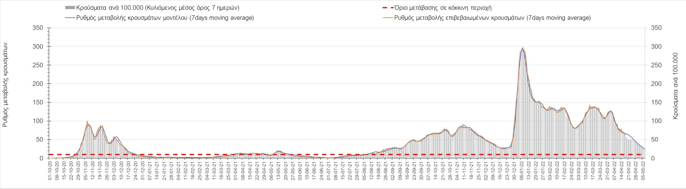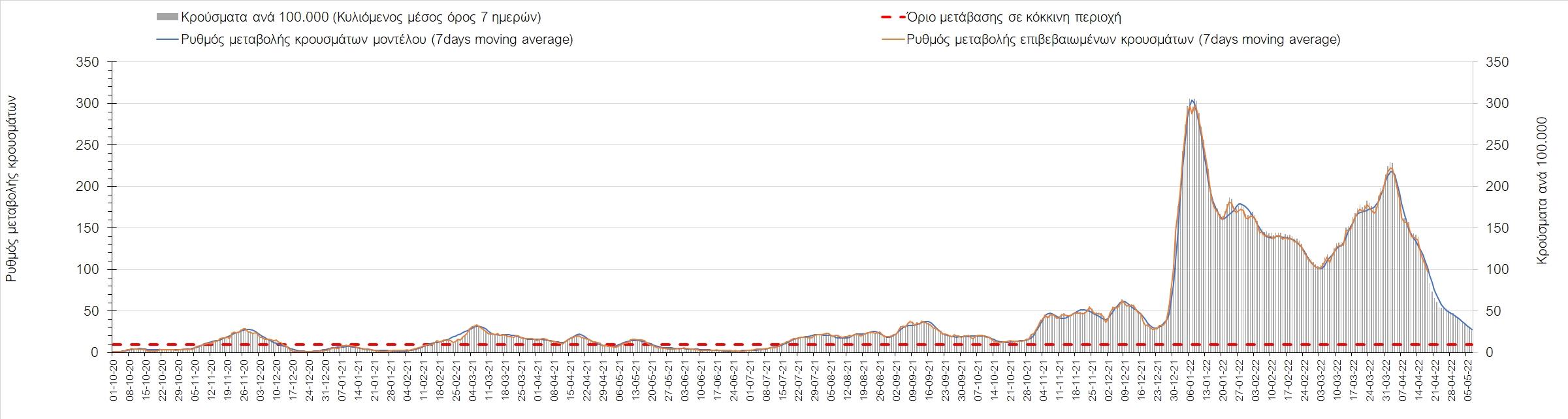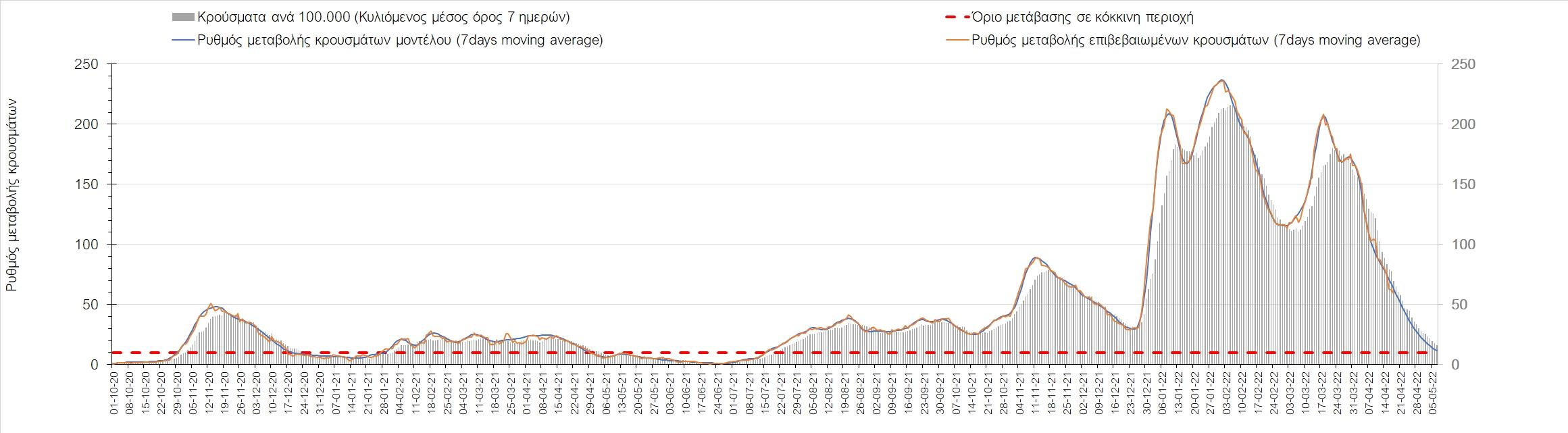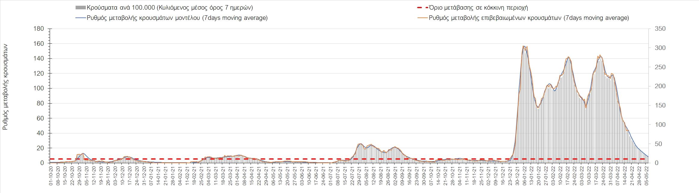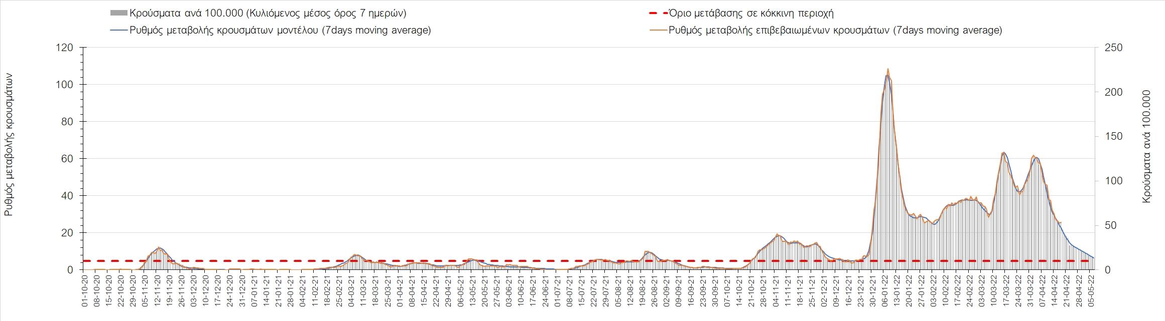 Η αποτύπωση των τάσεων στις επιμέρους περιοχές, παρουσιάζεται στο Σχήμα 61, όπου παρουσιάζεται ο ρυθμός μεταβολής των νέων κρουσμάτων ανά 100.000 κατοίκους (κυλιόμενος μέσος όρος 7 ημερών) των επιμέρους περιοχών. Θετικές τιμές του ρυθμού μεταβολής υποδηλώνουν άνοδο, ενώ αρνητικές τιμές υποδηλώνουν πτωτική πορεία.