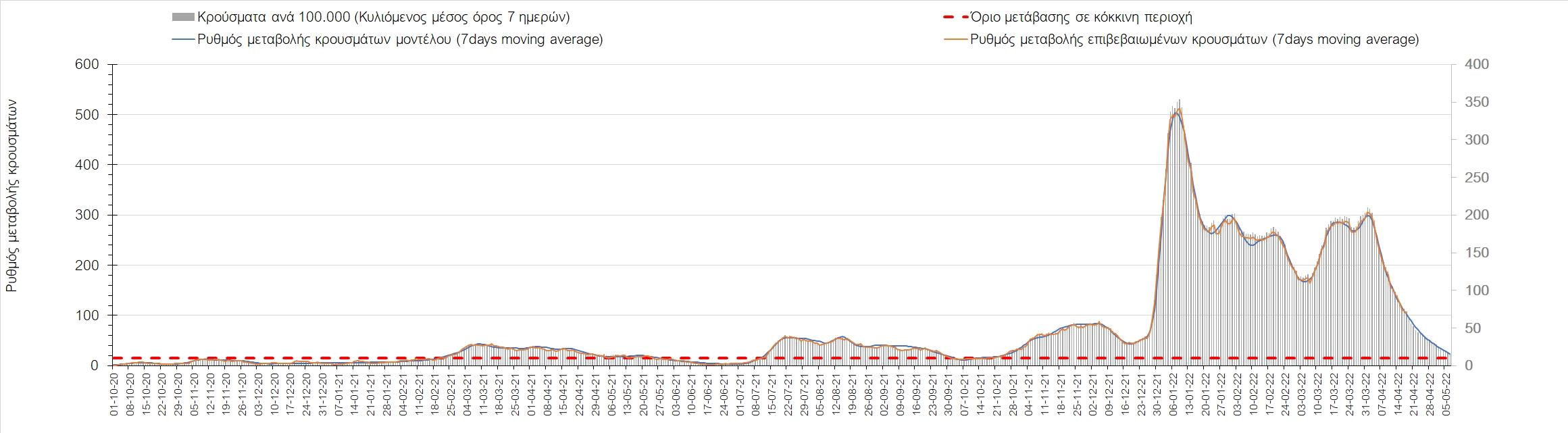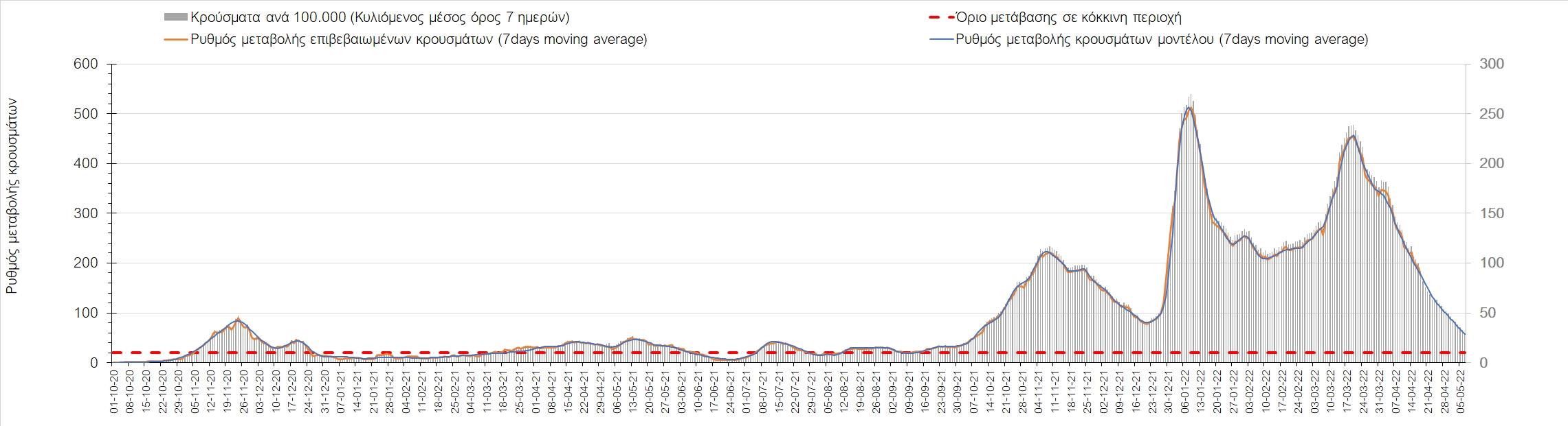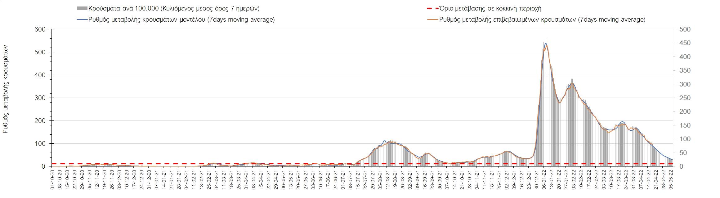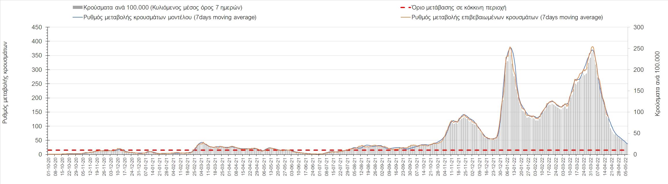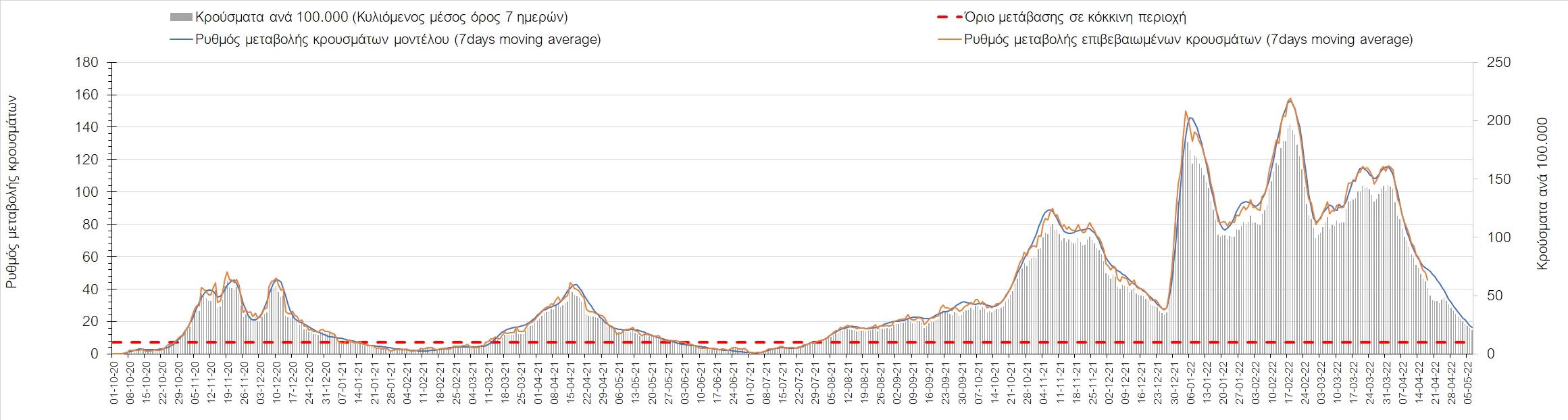 Η αποτύπωση των τάσεων στις επιμέρους περιοχές, παρουσιάζεται στο Σχήμα 61, όπου παρουσιάζεται ο ρυθμός μεταβολής των νέων κρουσμάτων ανά 100.000 κατοίκους (κυλιόμενος μέσος όρος 7 ημερών) των επιμέρους περιοχών. Θετικές τιμές του ρυθμού μεταβολής υποδηλώνουν άνοδο, ενώ αρνητικές τιμές υποδηλώνουν πτωτική πορεία.