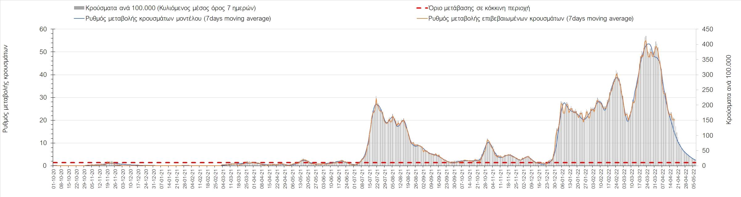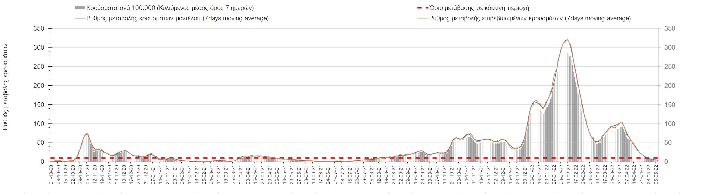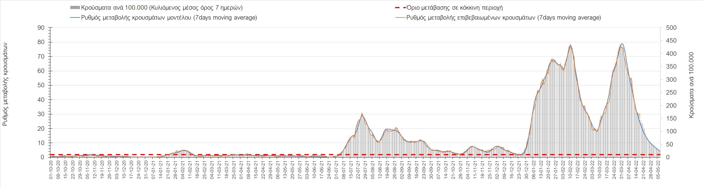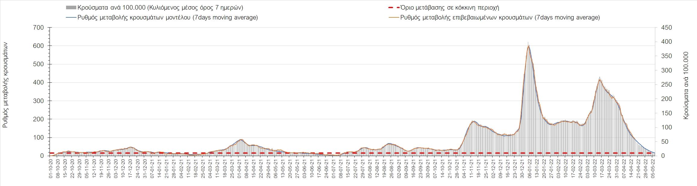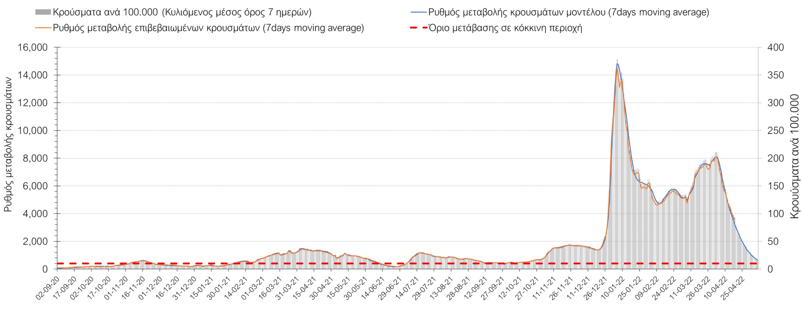 Η αποτύπωση των τάσεων στις επιμέρους περιοχές, παρουσιάζεται στο Σχήμα 61, όπου παρουσιάζεται ο ρυθμός μεταβολής των νέων κρουσμάτων ανά 100.000 κατοίκους (κυλιόμενος μέσος όρος 7 ημερών) των επιμέρους περιοχών. Θετικές τιμές του ρυθμού μεταβολής υποδηλώνουν άνοδο, ενώ αρνητικές τιμές υποδηλώνουν πτωτική πορεία.