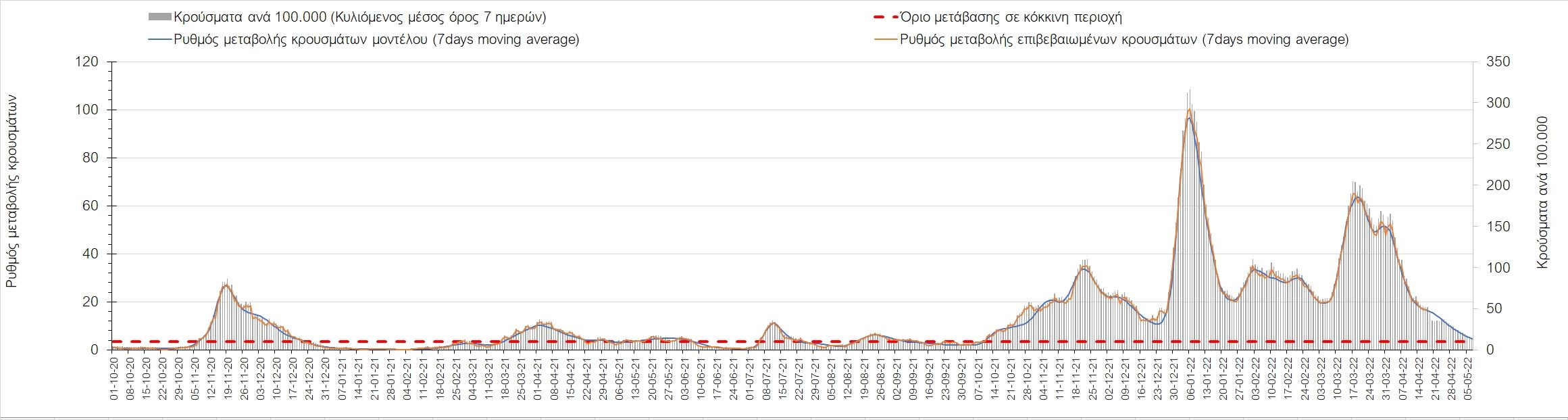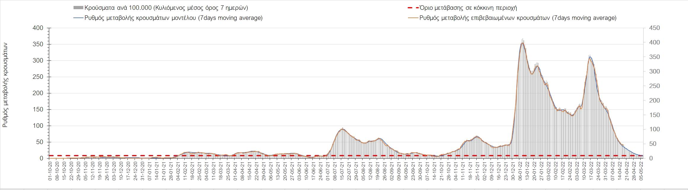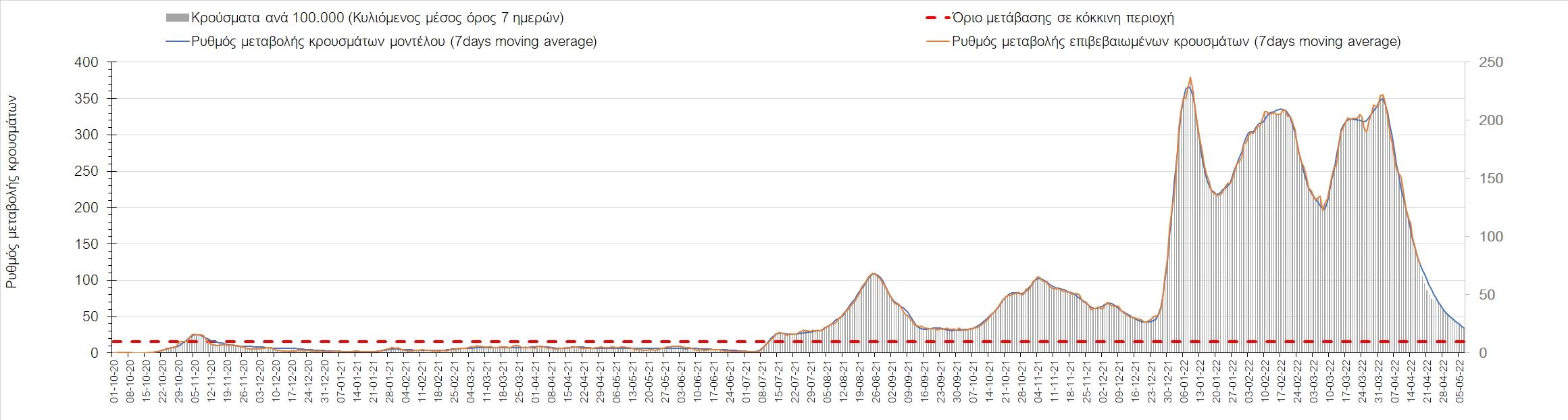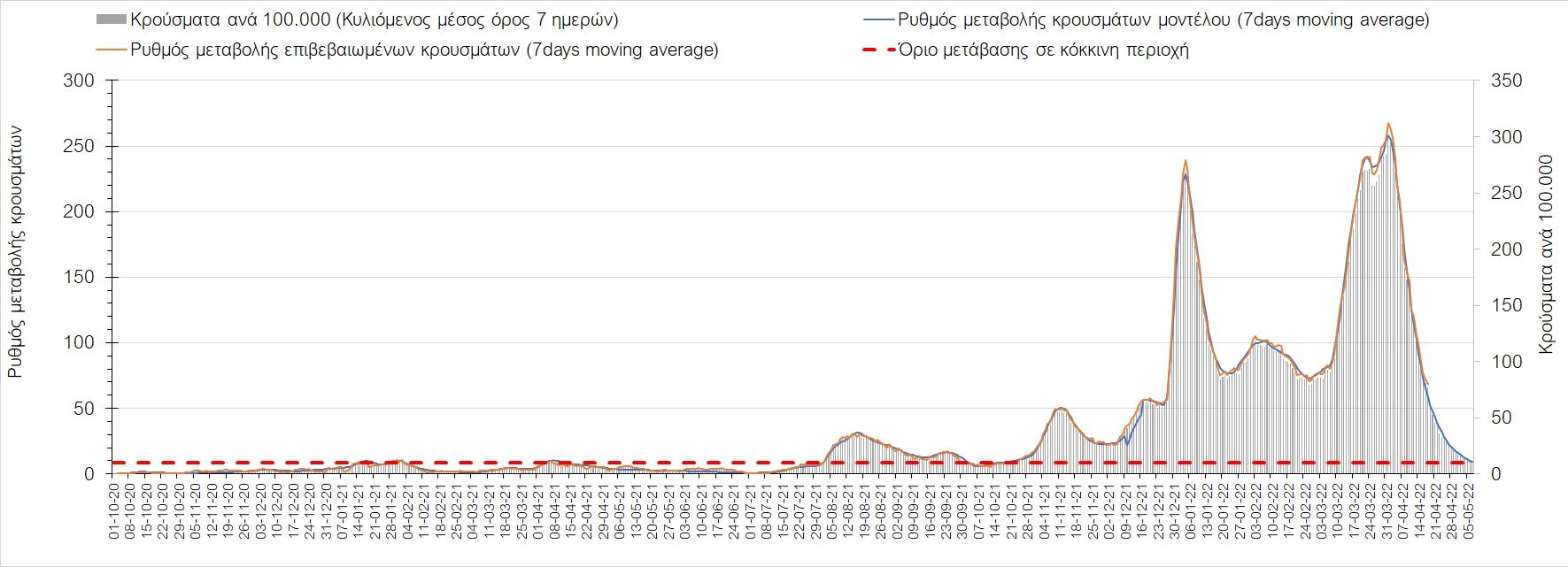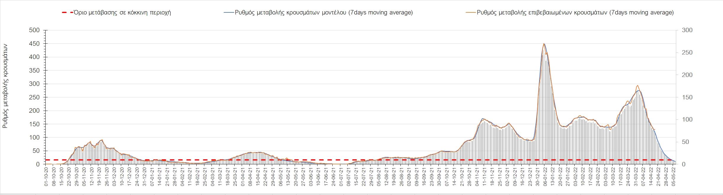 Η αποτύπωση των τάσεων στις επιμέρους περιοχές, παρουσιάζεται στο Σχήμα 61, όπου παρουσιάζεται ο ρυθμός μεταβολής των νέων κρουσμάτων ανά 100.000 κατοίκους (κυλιόμενος μέσος όρος 7 ημερών) των επιμέρους περιοχών. Θετικές τιμές του ρυθμού μεταβολής υποδηλώνουν άνοδο, ενώ αρνητικές τιμές υποδηλώνουν πτωτική πορεία.