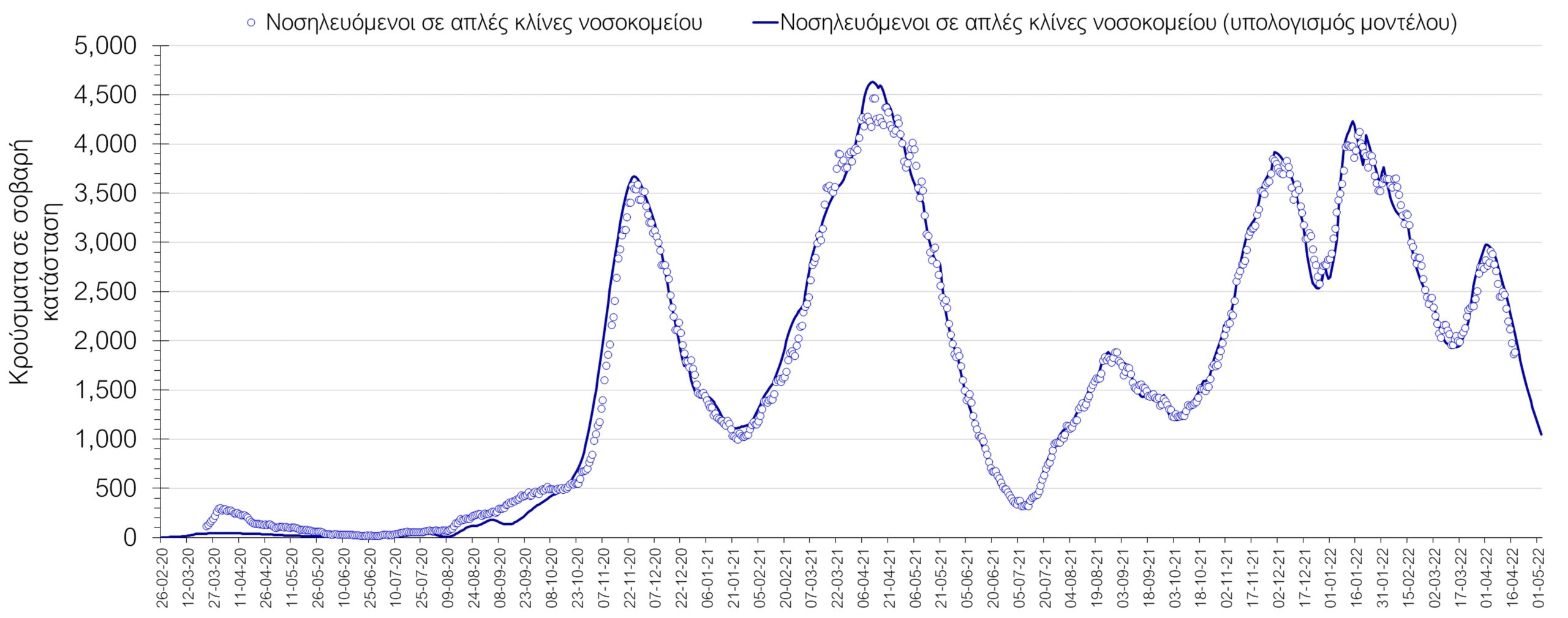Σχήμα 2. Αριθμός κρουσμάτων σε σοβαρή κατάσταση (νοσηλευόμενοι σε απλές κλίνες) σύμφωνα με τα στοιχεία του ΕΟΔΥ και τις προβλέψεις της υπολογιστικής πλατφόρμας CORE.
