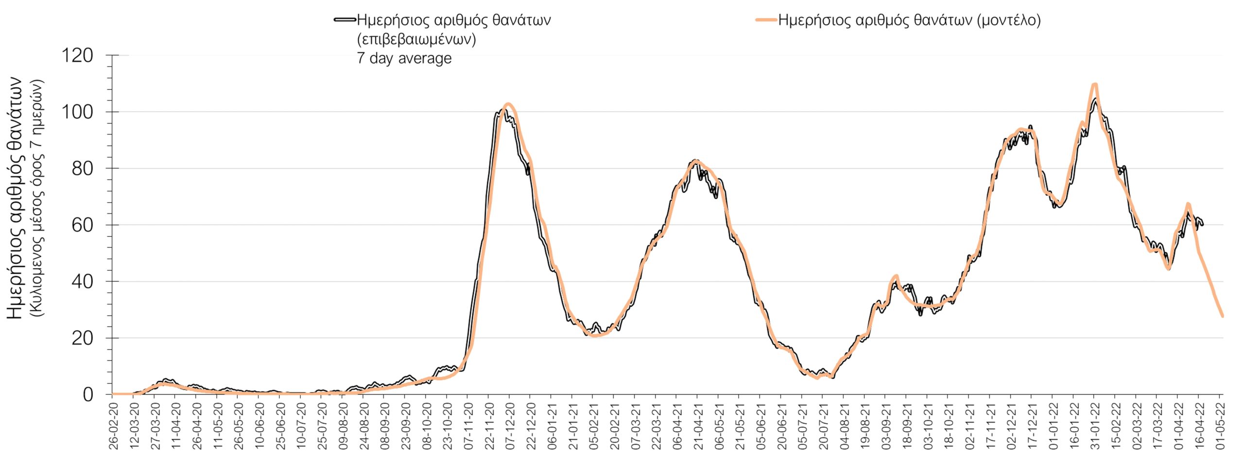Ο αριθμός ημερήσιων θανάτων (63) που καταγράφηκε τη Δευτέρα είναι αυξημένος σε σχέση με την Κυριακή (50). Όπως είχαμε προβλέψει ο κυλιόμενος εβδομαδιαίος μέσος όρος που  είναι 60,3 παραμένει υψηλός, και τόσο ο αριθμός, όσο και η τάση του, δε συνάδει με τον αριθμό των νοσηλειών σε κρίσιμη κατάσταση (διασωληνωμένοι σε ΜΕΘ).