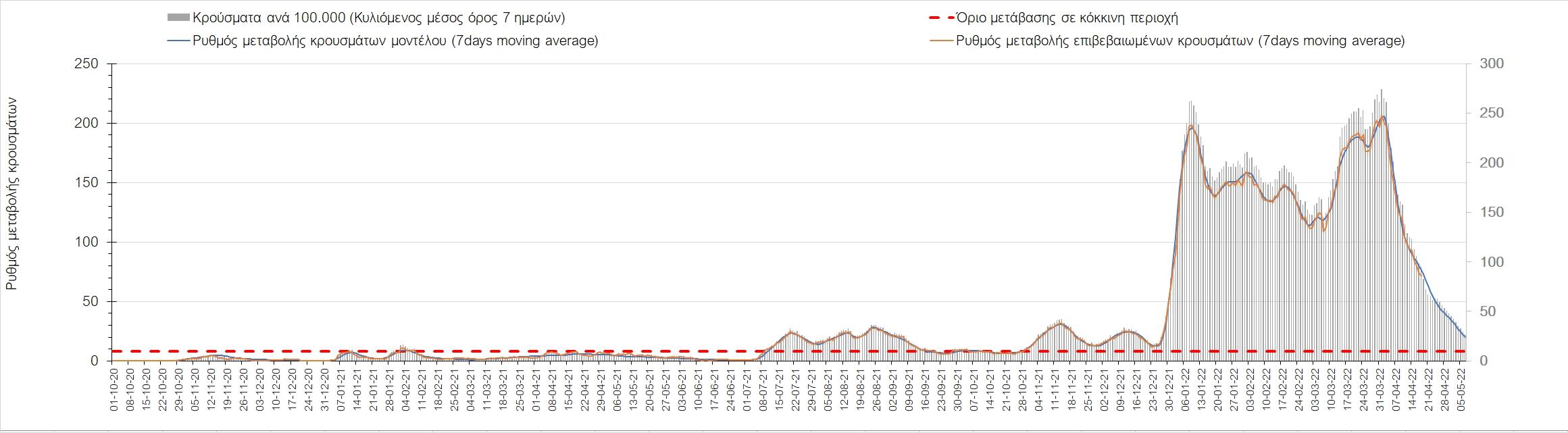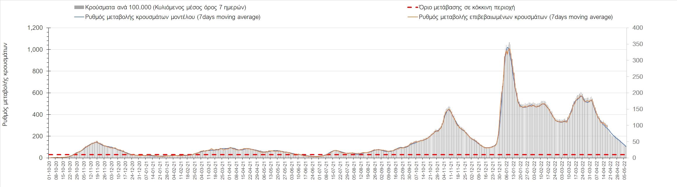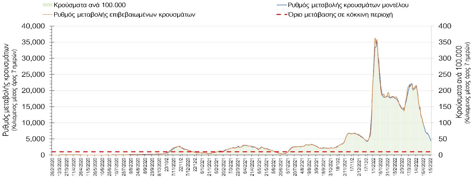 Η κάμψη της ανοδικής πορείας της προηγούμενης εβδομάδας, πλέον εξελίσσεται στην αναμενόμενη πτωτική πορεία και αντικατοπτρίζεται και στον ημερήσιο αριθμό των κρουσμάτων (κυλιόμενος μέσος όρος 7 ημερών), ο οποίος σήμερα εμφανίζει μείωση σε σχέση με την Κυριακή και βρίσκεται μόλις πάνω από τις 9.000 (9.018). Για να συνεχισθεί η συστηματική αποκλιμάκωση της πανδημίας, πέρα από την εφαρμογή των μέτρων (σε συνδυασμό με την σημαντική συνειδητοποίηση εκ μέρους του πληθυσμού ότι χρειάζεται προσοχή και σύνεση για την αντιμετώπιση της διασποράς της παραλλαγής Ο), θα πρέπει να στοχεύσουμε στη διατήρηση και την επέκταση της επίκτητης ανοσίας του πληθυσμού, αλλά και στον μεγάλο αριθμό των τεστ συνολικά (μοριακά, rapid και self-test) που πραγματοποιούνται καθημερινά. Για αυτό τον λόγο και με δεδομένη τη μεγάλη διασπορά στα σχολεία θεωρούμε πρόωρη τη μείωση των self-test στα παιδιά σχολικής ηλικίας σε ένα μόνο την εβδομάδα από τα δύο που γίνονταν μέχρι τώρα.