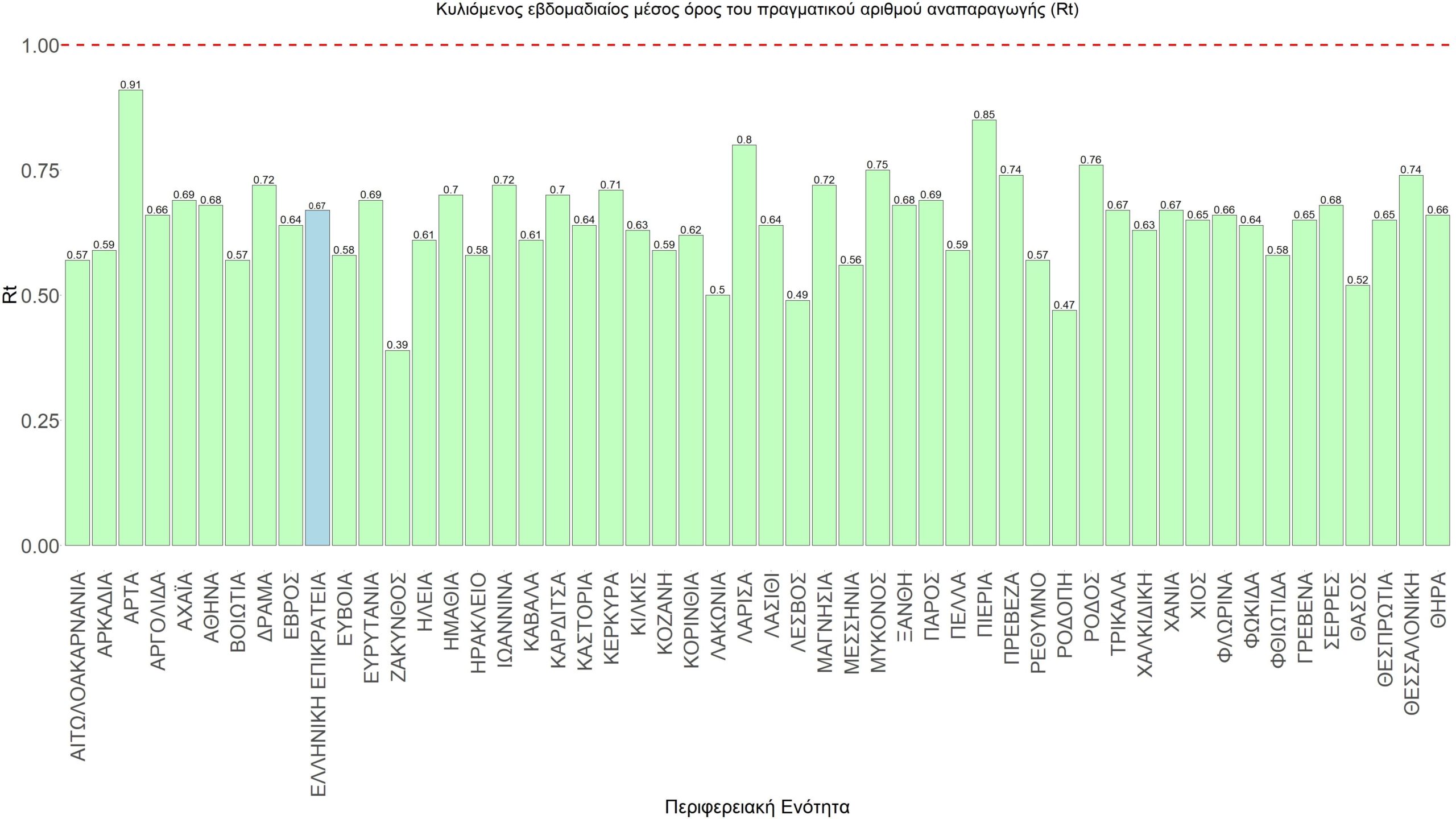 O πραγματικός αριθμός αναπαραγωγής Rt ανά περιφερειακή ενότητα της χώρας παρουσιάζεται στο Σχήμα 58.