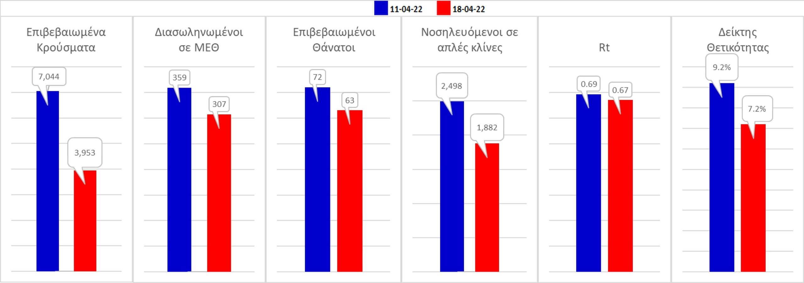Σχήμα 59. Συγκριτικά αποτελέσματα της επιδημιολογικής εικόνας της Δευτέρας (18/04/2022) σε σχέση με την προηγούμενη (11/04/2022)