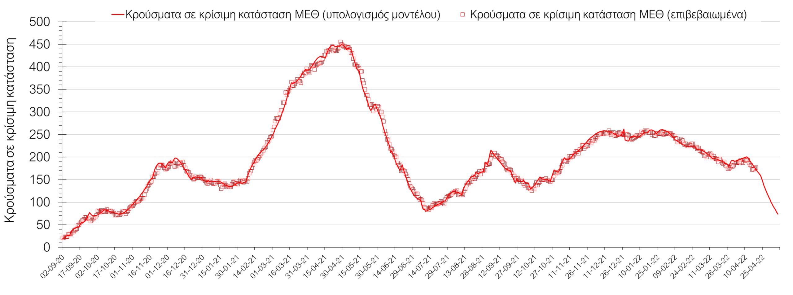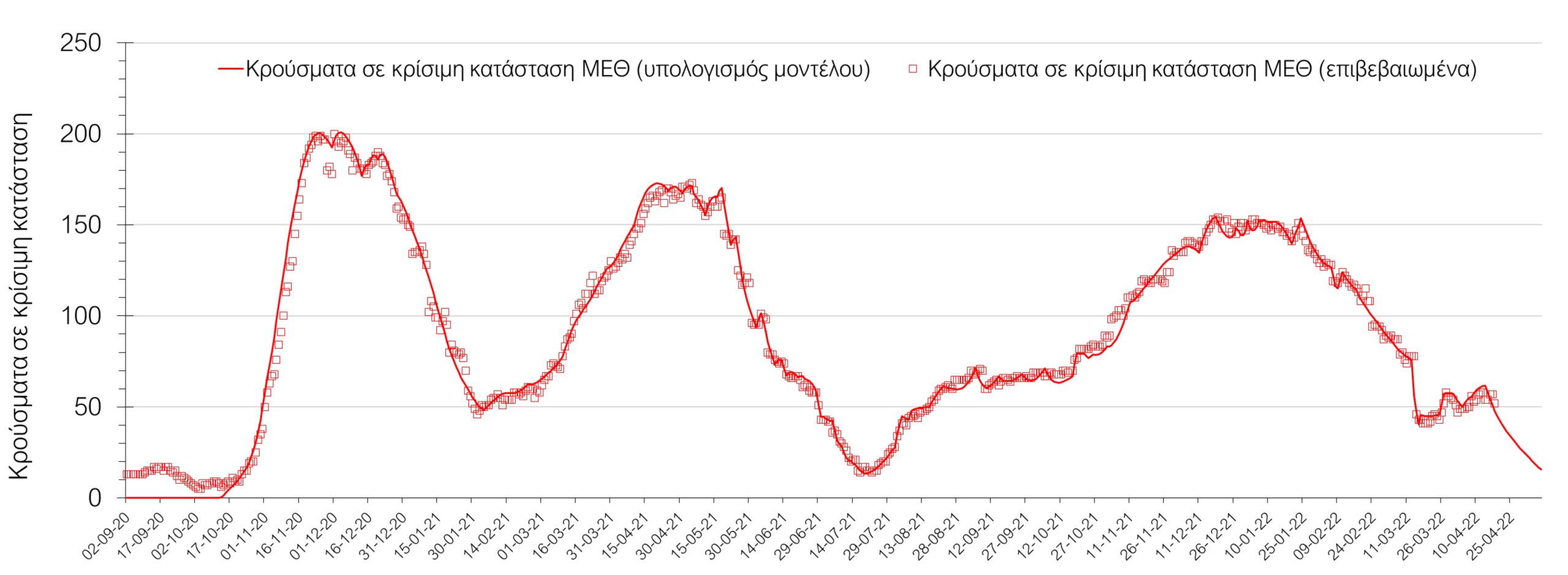 Σχήμα 1. Αριθμός κρουσμάτων σε κρίσιμη κατάσταση (ΜΕΘ) σύμφωνα με τα στοιχεία του ΕΟΔΥ και τις προβλέψεις της υπολογιστικής πλατφόρμας CORE.