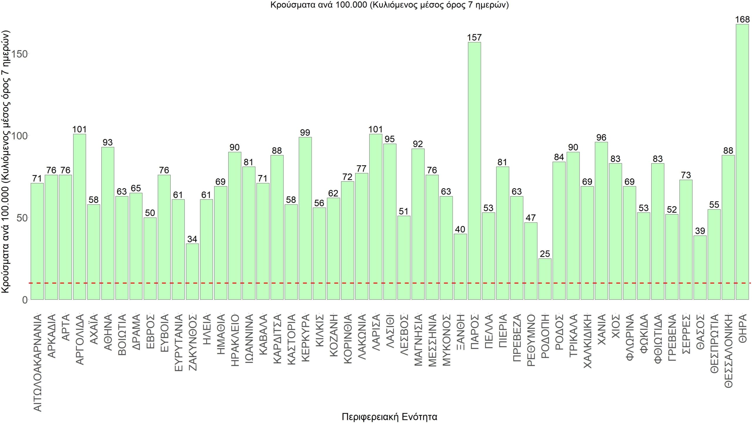Σχήμα 60. Συγκεντρωτική εικόνα των νέων κρουσμάτων ανά 100.000 κατοίκους (κυλιόμενος μέσος όρος 7 ημερών) των επιμέρους περιοχών