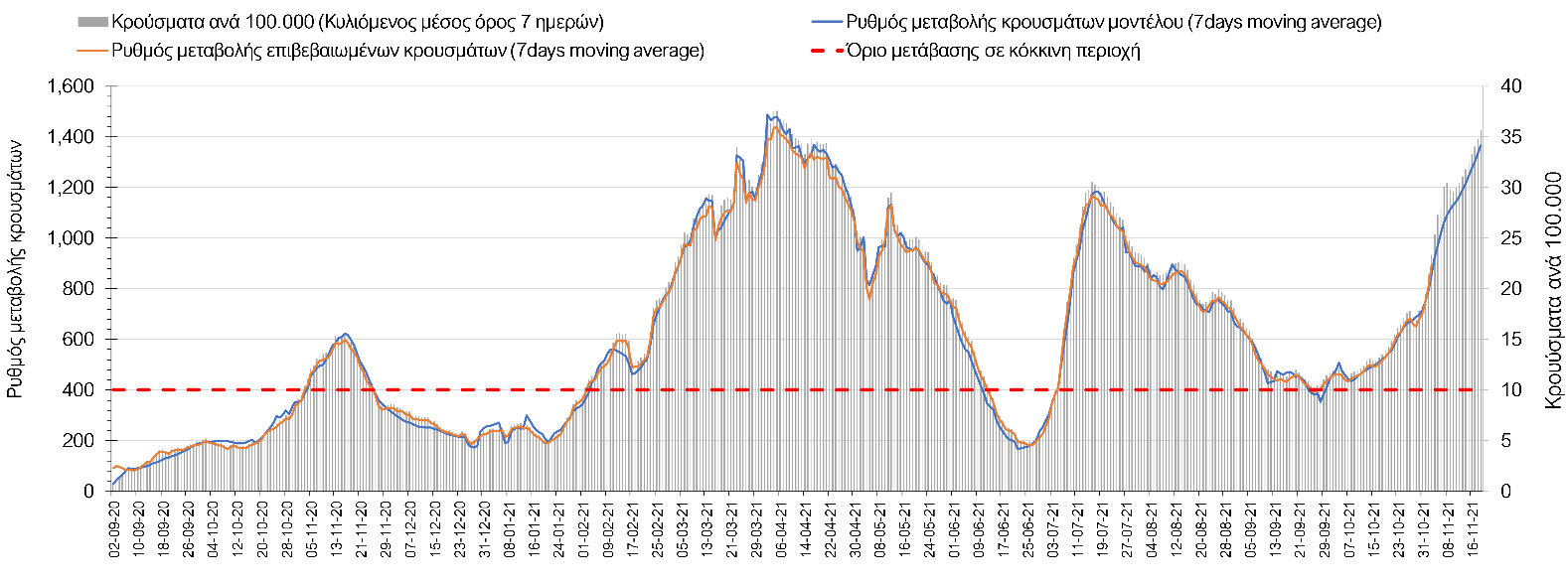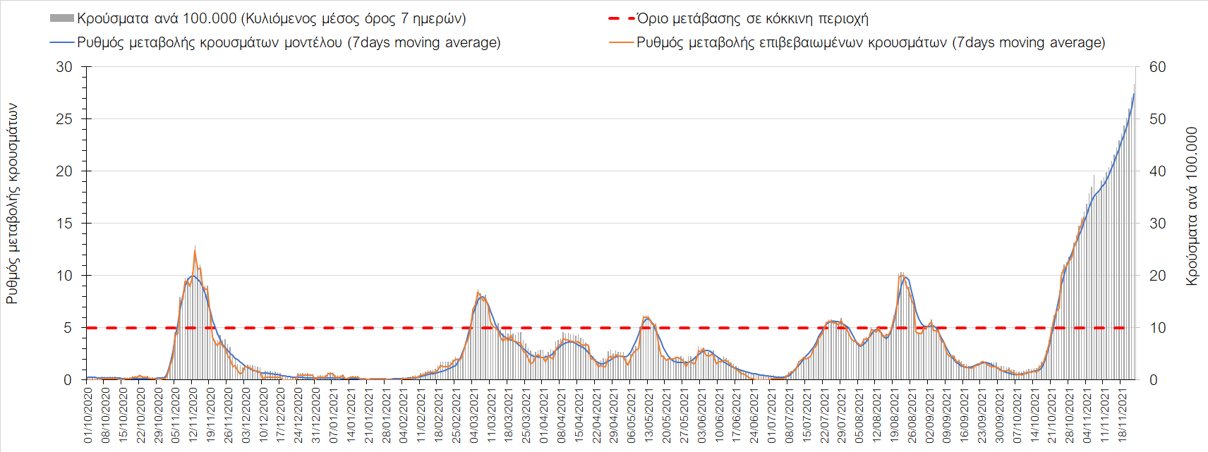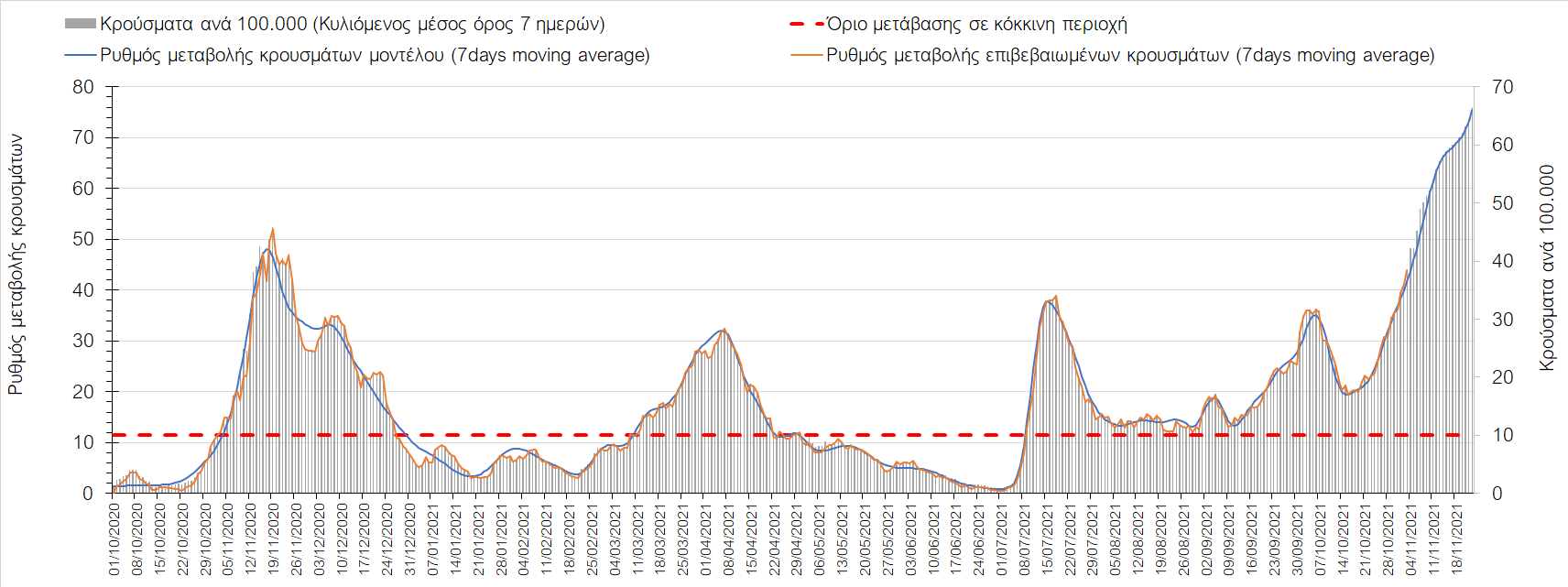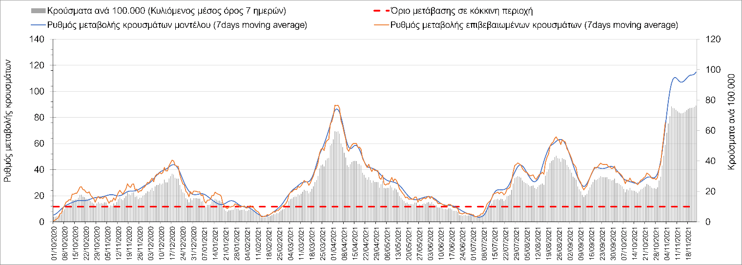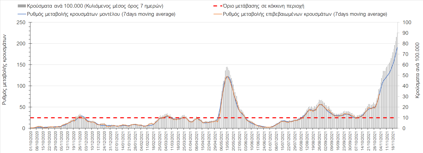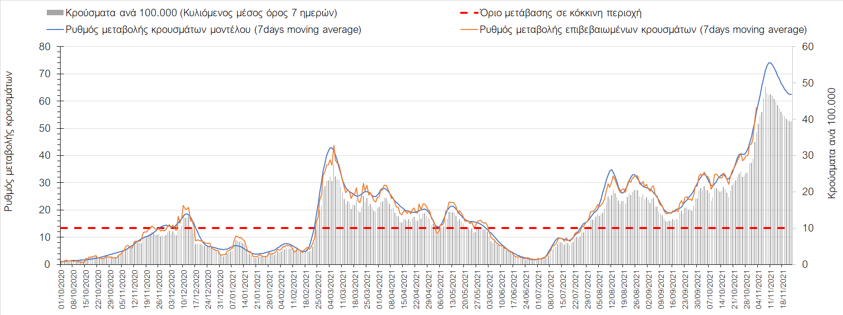 Συνολικά η ανοδική τάση των τελευταίων ημερών αντικατοπτρίζεται και από τον ημερήσιο αριθμό των κρουσμάτων (κυλιόμενος μέσος όρος 7 ημερών), ο οποίος ξεπέρασε τα 4600 (4621). Γενικά την τελευταία εβδομάδα συνεχίστηκε η αύξηση του αριθμού των κρουσμάτων (κυλιόμενος μέσος όρος 7 ημερών) που ξεκίνησε την προηγούμενη, κάτι που αναμέναμε να συμβεί μετά τα μέσα Οκτώβρη.