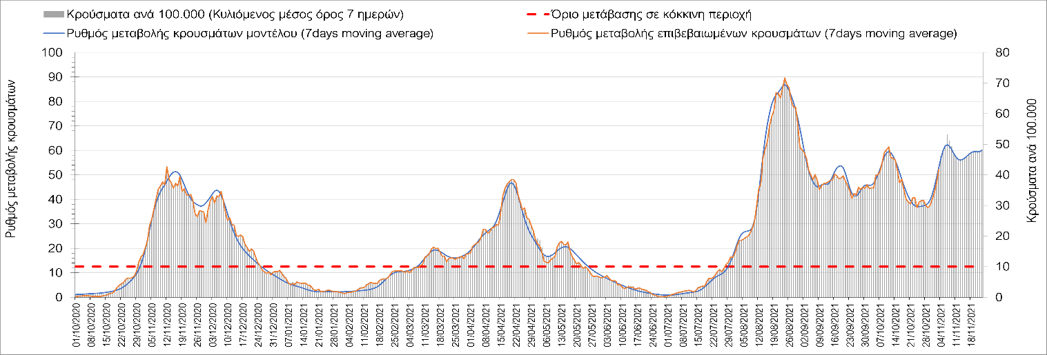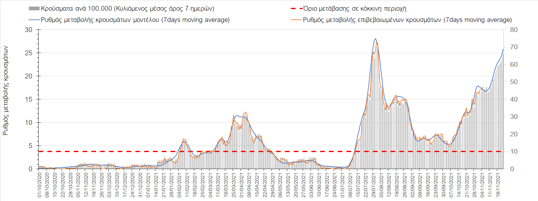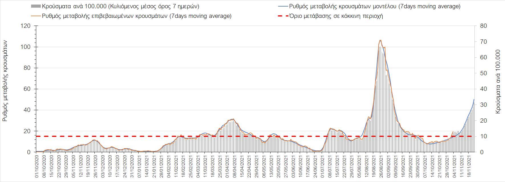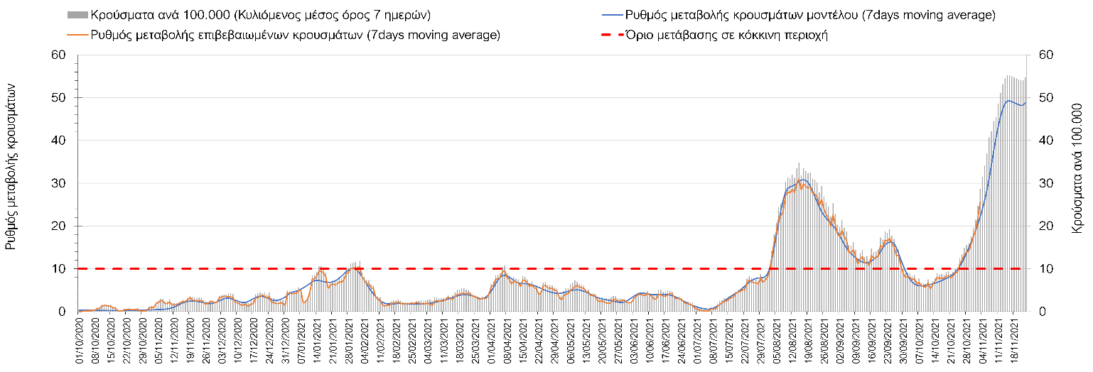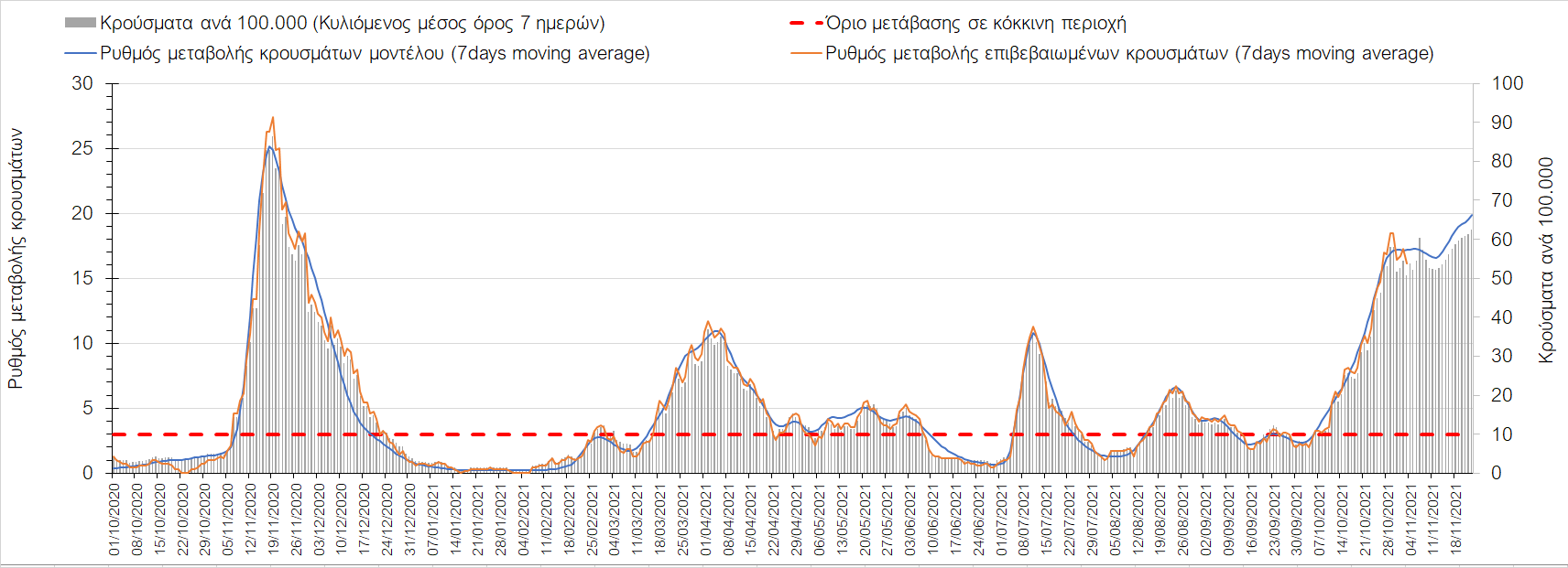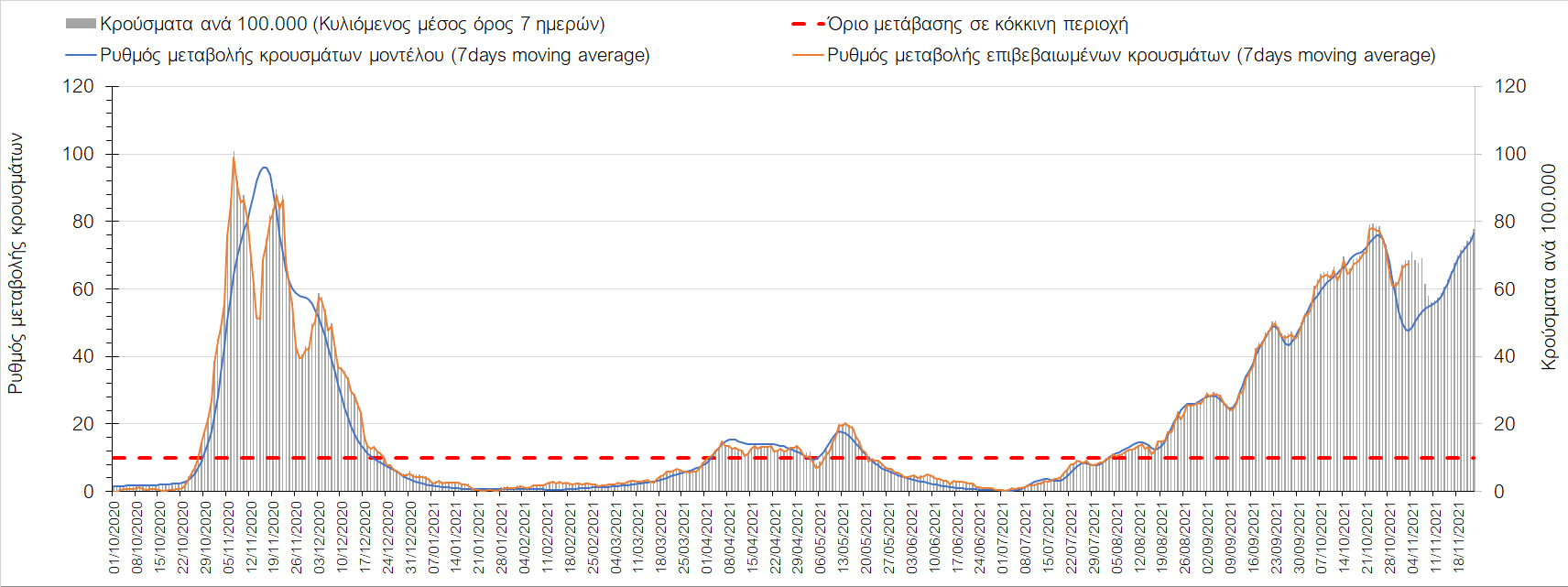 Συνολικά η ανοδική τάση των τελευταίων ημερών αντικατοπτρίζεται και από τον ημερήσιο αριθμό των κρουσμάτων (κυλιόμενος μέσος όρος 7 ημερών), ο οποίος ξεπέρασε τα 4600 (4621). Γενικά την τελευταία εβδομάδα συνεχίστηκε η αύξηση του αριθμού των κρουσμάτων (κυλιόμενος μέσος όρος 7 ημερών) που ξεκίνησε την προηγούμενη, κάτι που αναμέναμε να συμβεί μετά τα μέσα Οκτώβρη.