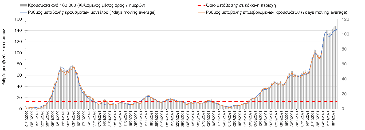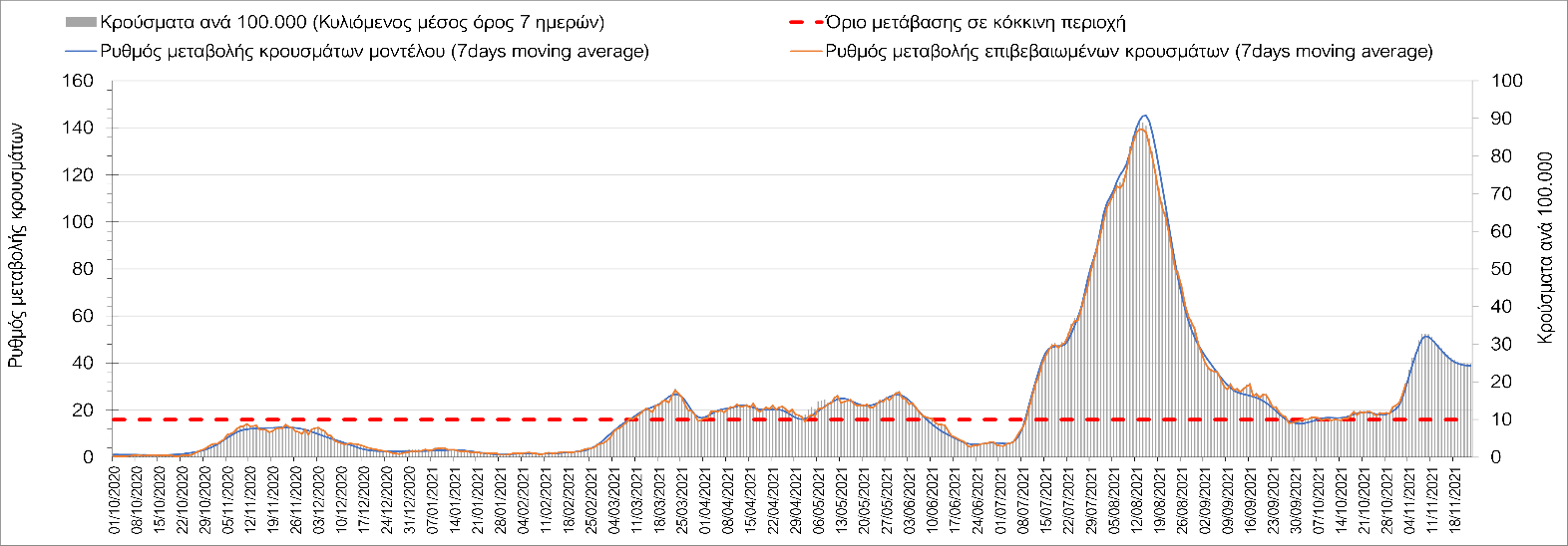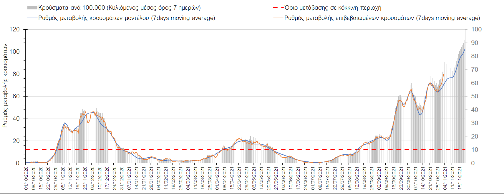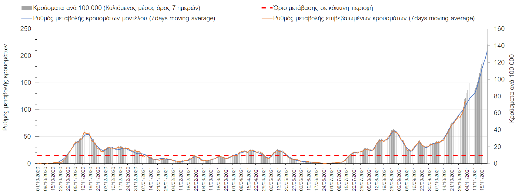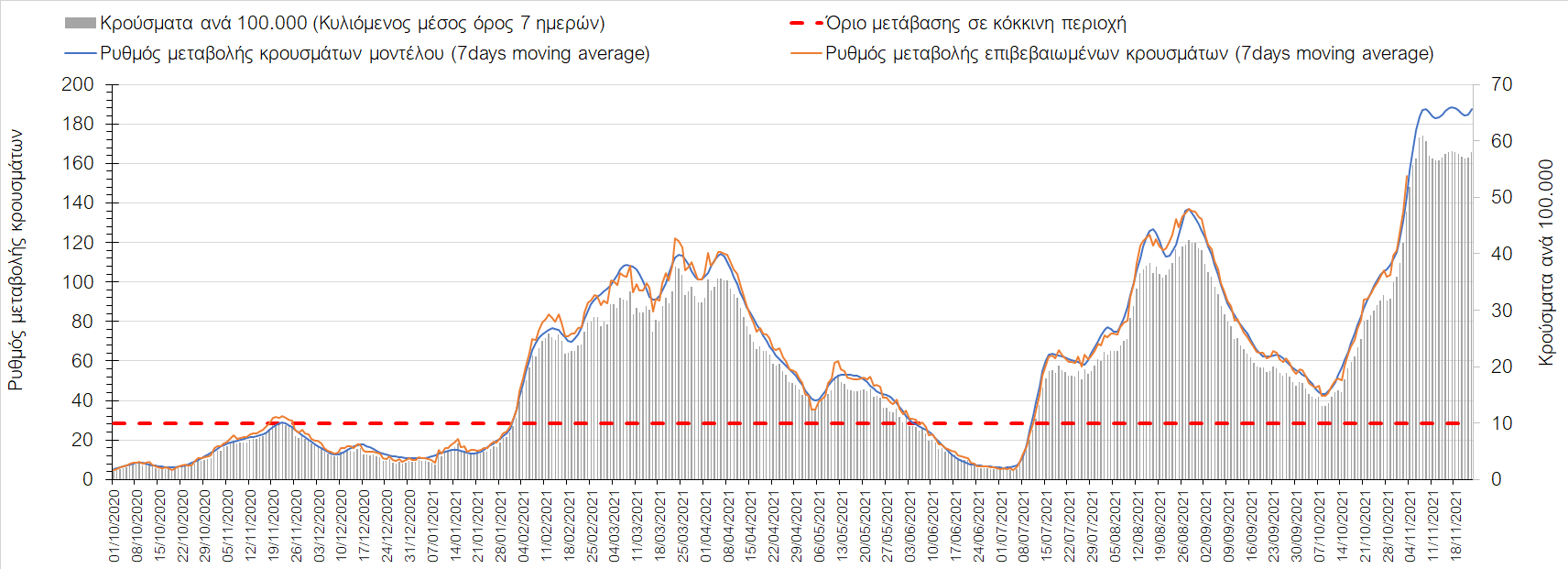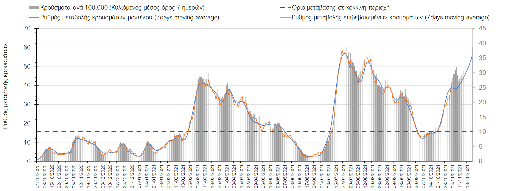 Συνολικά η ανοδική τάση των τελευταίων ημερών αντικατοπτρίζεται και από τον ημερήσιο αριθμό των κρουσμάτων (κυλιόμενος μέσος όρος 7 ημερών), ο οποίος ξεπέρασε τα 4600 (4621). Γενικά την τελευταία εβδομάδα συνεχίστηκε η αύξηση του αριθμού των κρουσμάτων (κυλιόμενος μέσος όρος 7 ημερών) που ξεκίνησε την προηγούμενη, κάτι που αναμέναμε να συμβεί μετά τα μέσα Οκτώβρη.