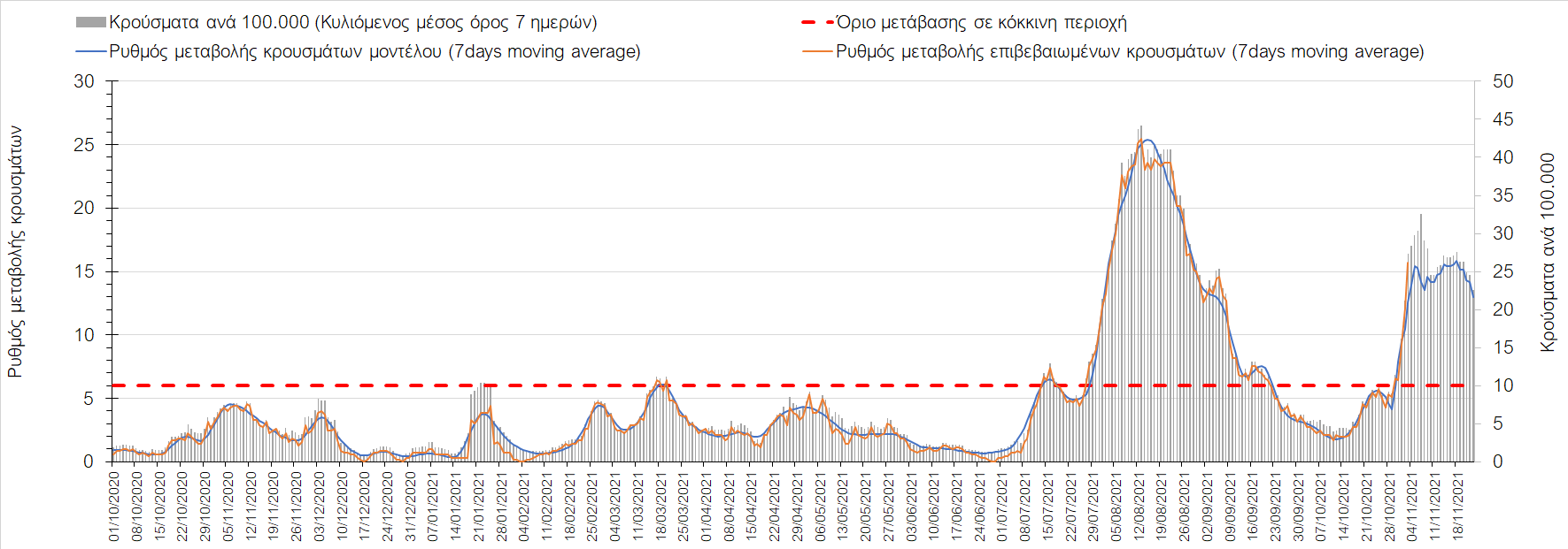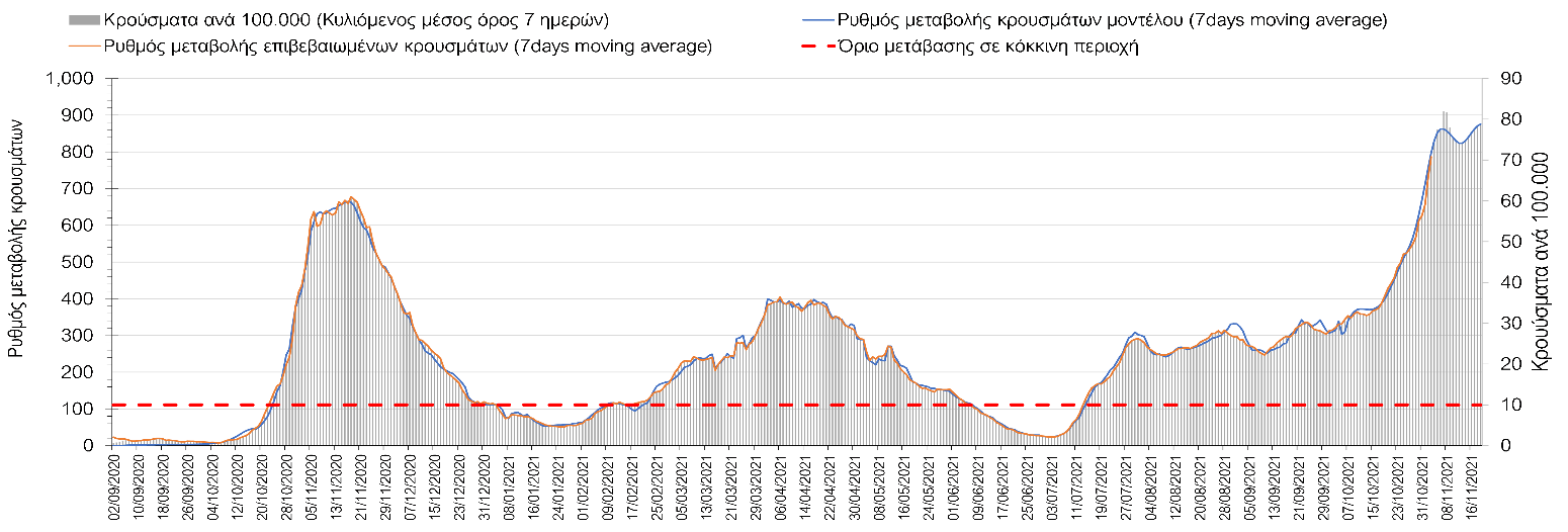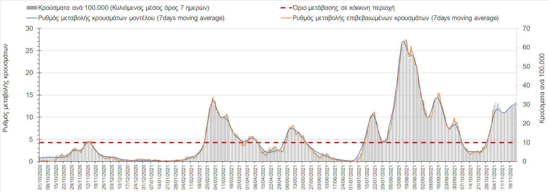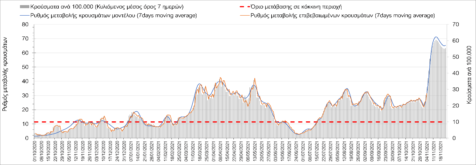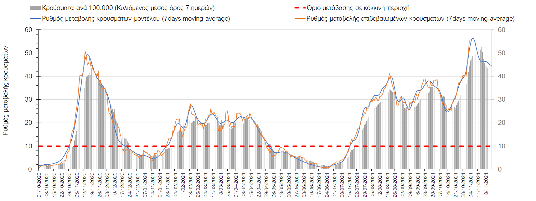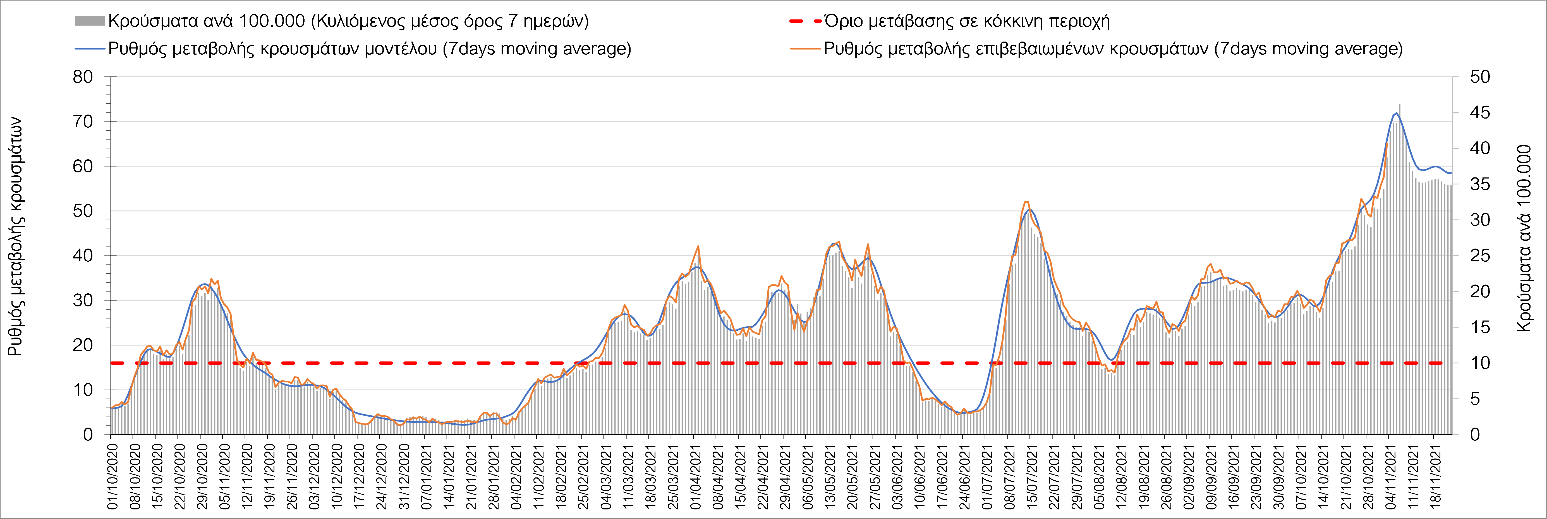 Συνολικά η ανοδική τάση των τελευταίων ημερών αντικατοπτρίζεται και από τον ημερήσιο αριθμό των κρουσμάτων (κυλιόμενος μέσος όρος 7 ημερών), ο οποίος ξεπέρασε τα 4600 (4621). Γενικά την τελευταία εβδομάδα συνεχίστηκε η αύξηση του αριθμού των κρουσμάτων (κυλιόμενος μέσος όρος 7 ημερών) που ξεκίνησε την προηγούμενη, κάτι που αναμέναμε να συμβεί μετά τα μέσα Οκτώβρη.