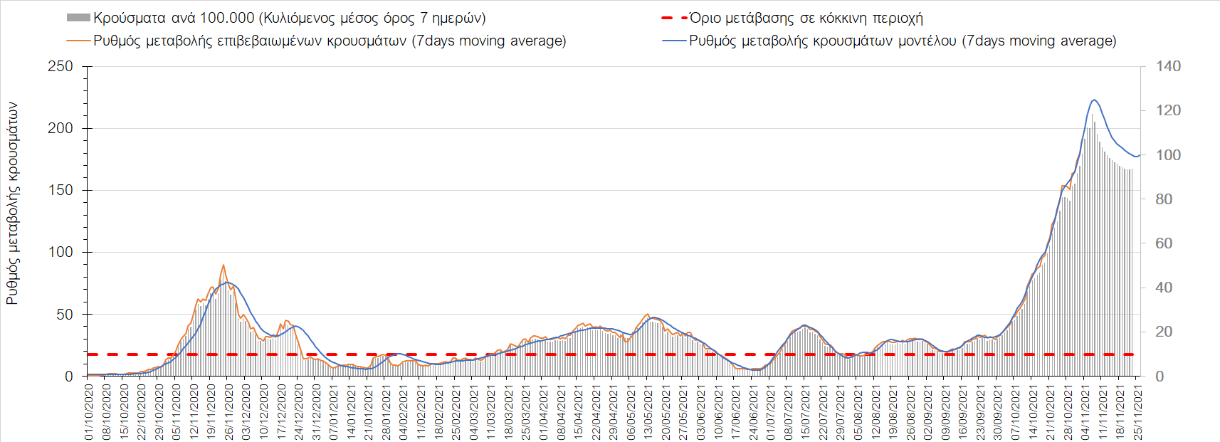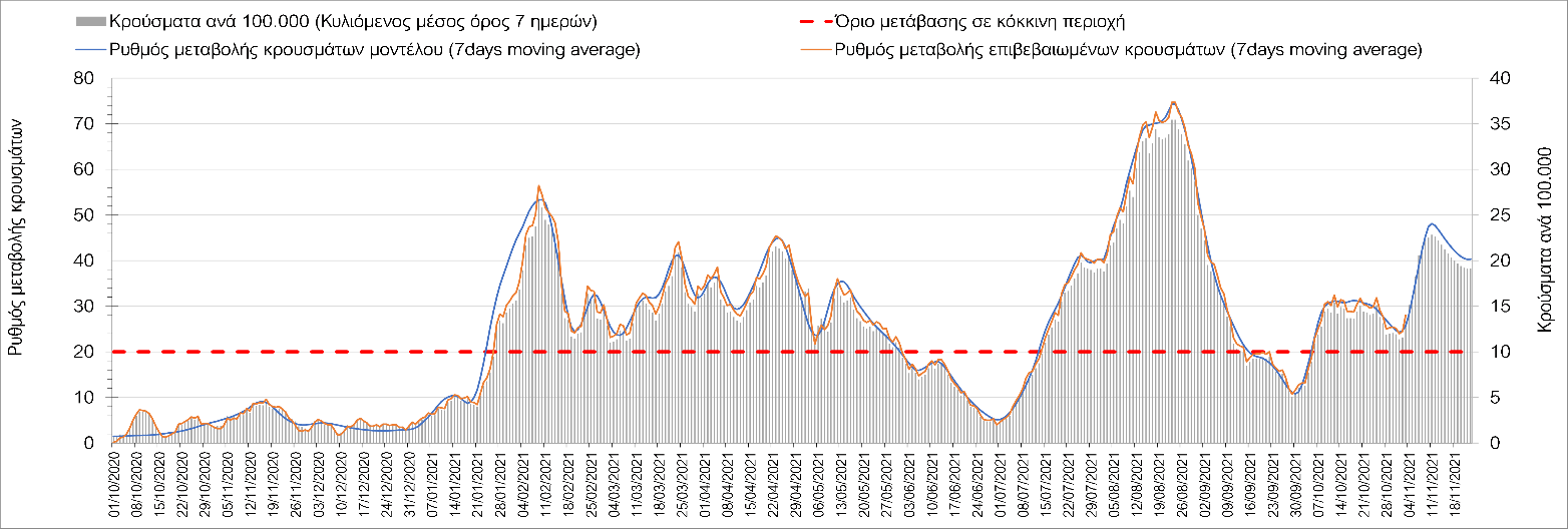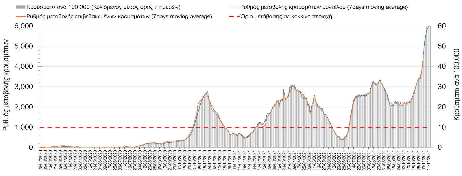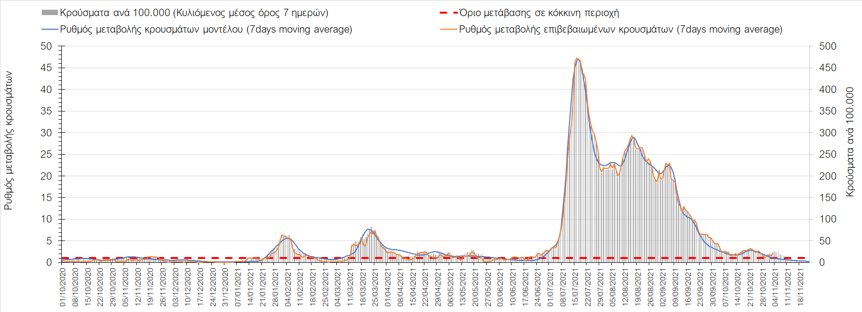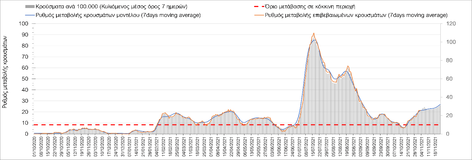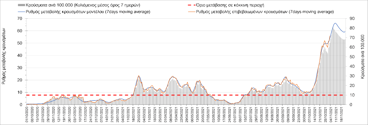 Συνολικά η ανοδική τάση των τελευταίων ημερών αντικατοπτρίζεται και από τον ημερήσιο αριθμό των κρουσμάτων (κυλιόμενος μέσος όρος 7 ημερών), ο οποίος ξεπέρασε τα 4600 (4621). Γενικά την τελευταία εβδομάδα συνεχίστηκε η αύξηση του αριθμού των κρουσμάτων (κυλιόμενος μέσος όρος 7 ημερών) που ξεκίνησε την προηγούμενη, κάτι που αναμέναμε να συμβεί μετά τα μέσα Οκτώβρη.