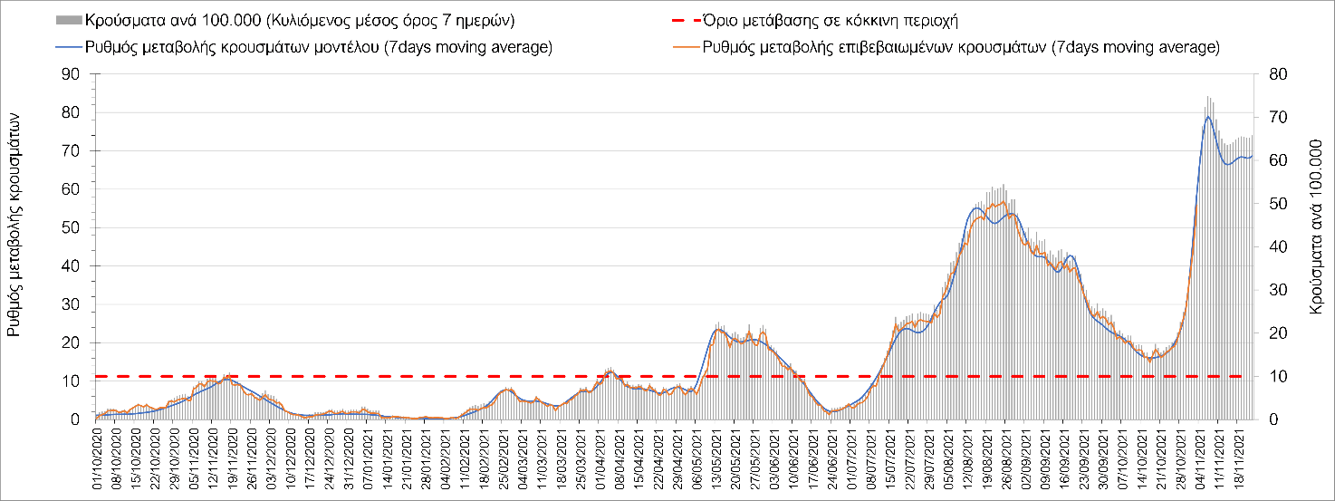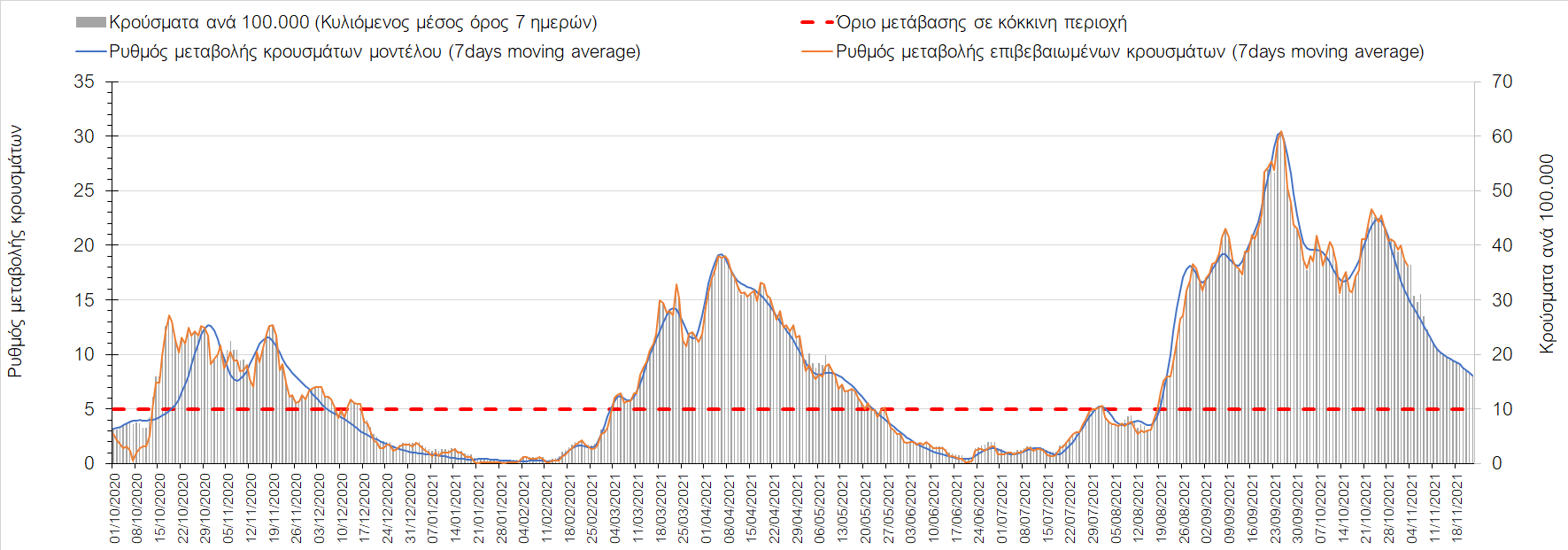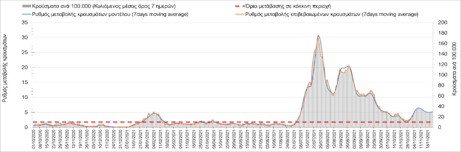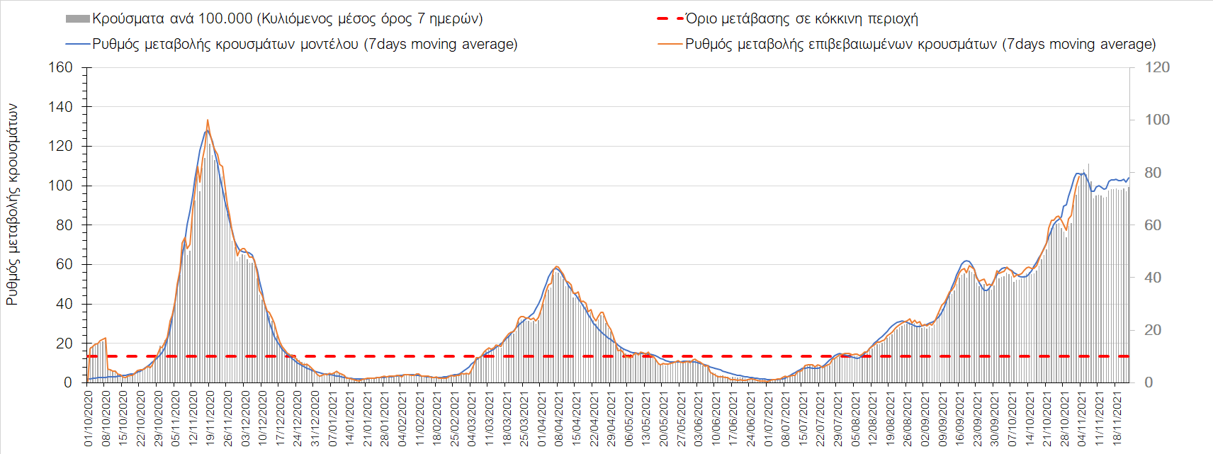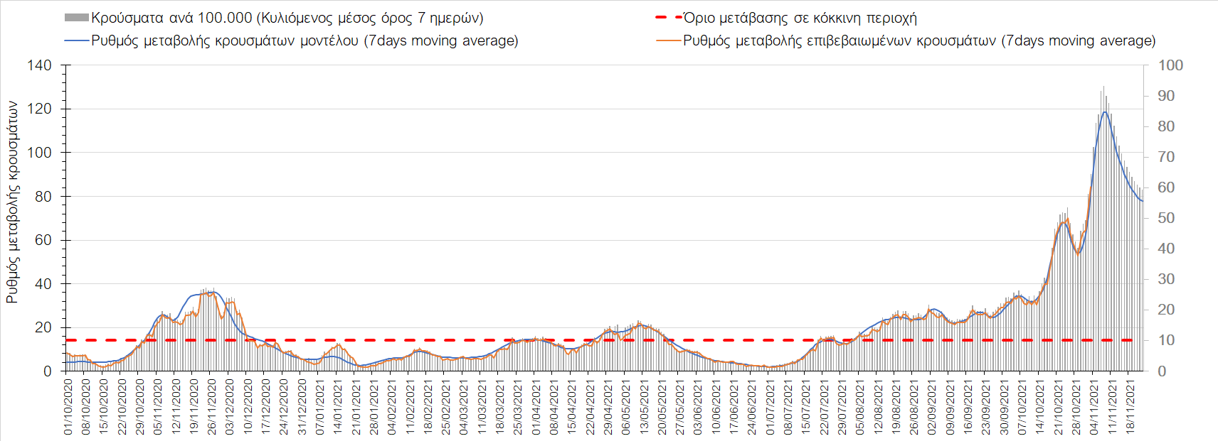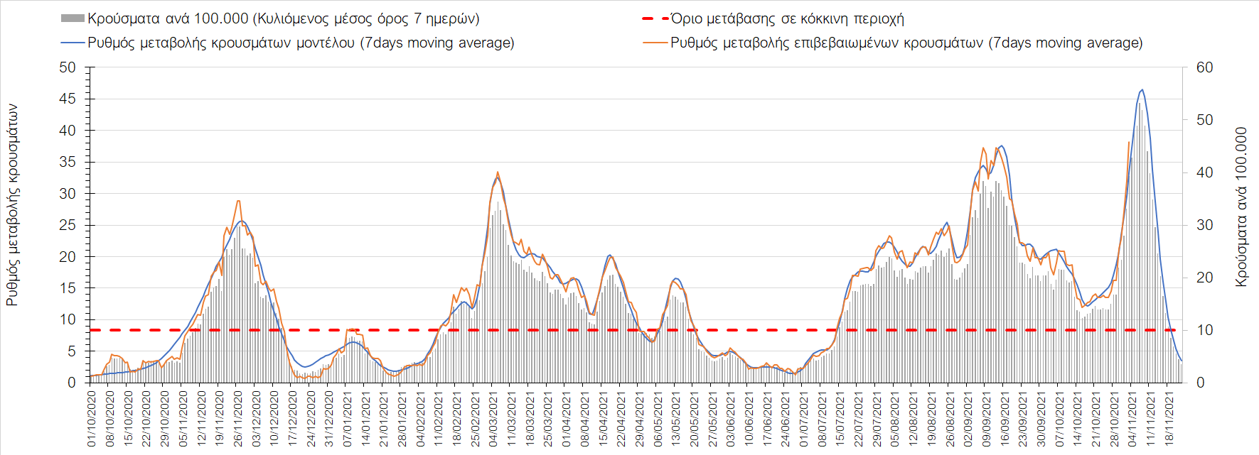 Συνολικά η ανοδική τάση των τελευταίων ημερών αντικατοπτρίζεται και από τον ημερήσιο αριθμό των κρουσμάτων (κυλιόμενος μέσος όρος 7 ημερών), ο οποίος ξεπέρασε τα 4600 (4621). Γενικά την τελευταία εβδομάδα συνεχίστηκε η αύξηση του αριθμού των κρουσμάτων (κυλιόμενος μέσος όρος 7 ημερών) που ξεκίνησε την προηγούμενη, κάτι που αναμέναμε να συμβεί μετά τα μέσα Οκτώβρη.