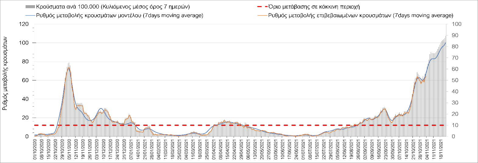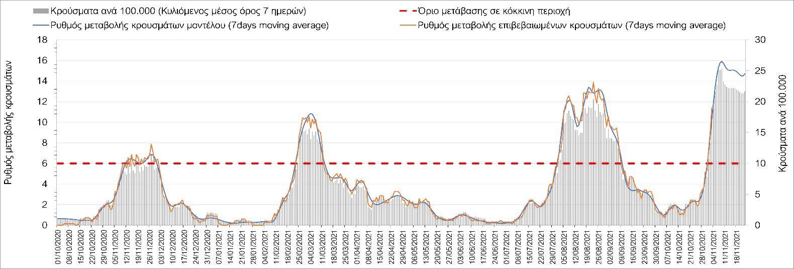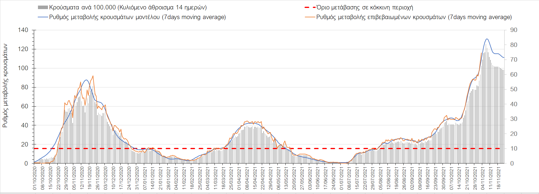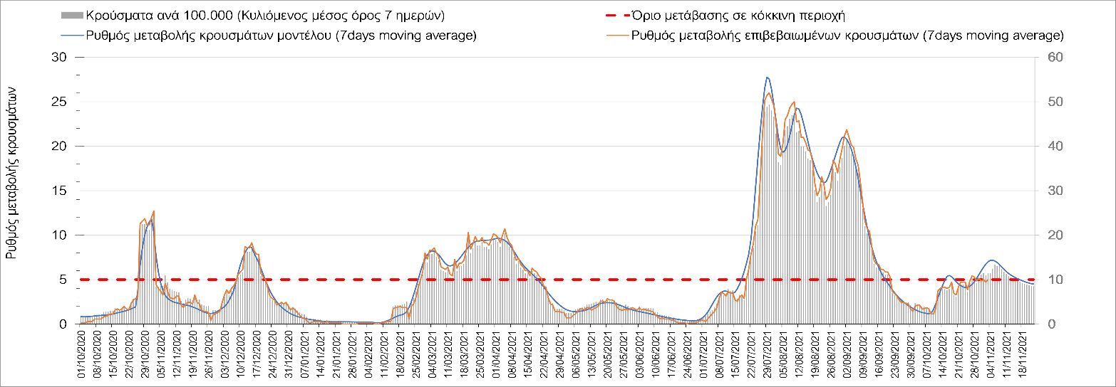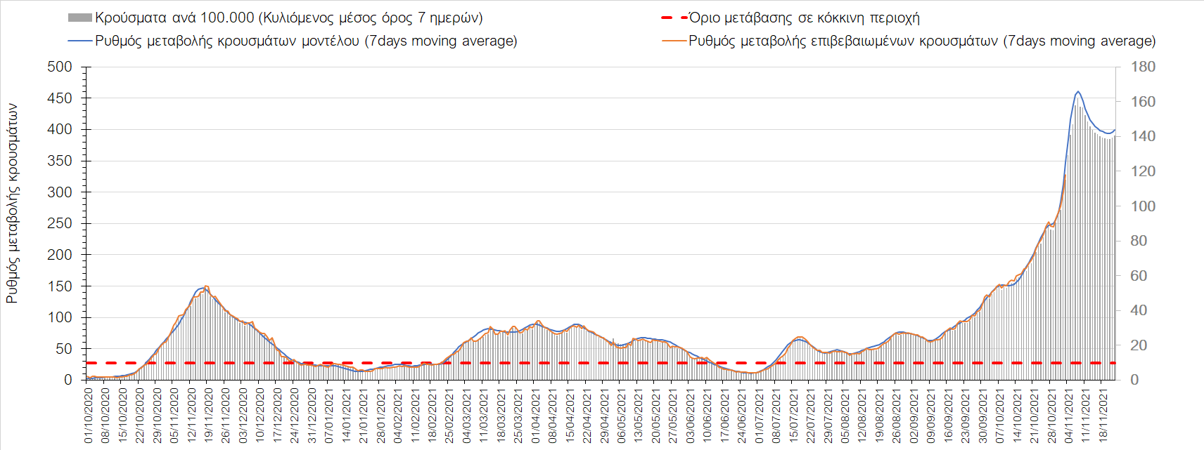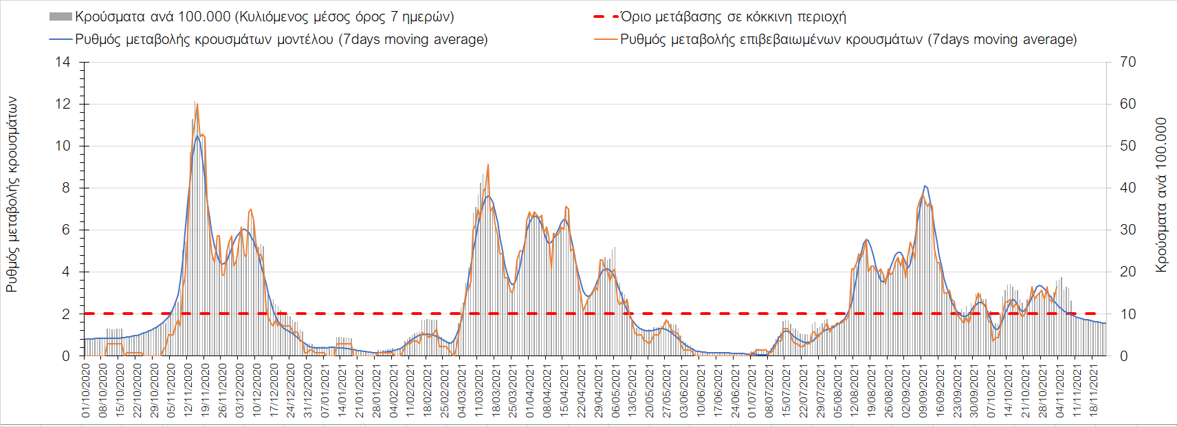Συνολικά η ανοδική τάση των τελευταίων ημερών αντικατοπτρίζεται και από τον ημερήσιο αριθμό των κρουσμάτων (κυλιόμενος μέσος όρος 7 ημερών), ο οποίος ξεπέρασε τα 4600 (4621). Γενικά την τελευταία εβδομάδα συνεχίστηκε η αύξηση του αριθμού των κρουσμάτων (κυλιόμενος μέσος όρος 7 ημερών) που ξεκίνησε την προηγούμενη, κάτι που αναμέναμε να συμβεί μετά τα μέσα Οκτώβρη.