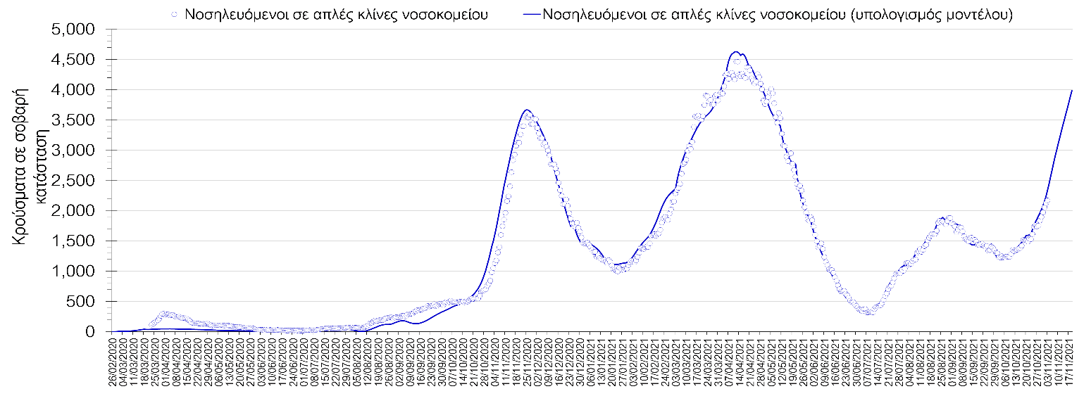 Σχήμα 2. Αριθμός κρουσμάτων σε σοβαρή κατάσταση (νοσηλευόμενοι σε απλές κλίνες) σύμφωνα με τα στοιχεία του ΕΟΔΥ και τις προβλέψεις της υπολογιστικής πλατφόρμας CORE.