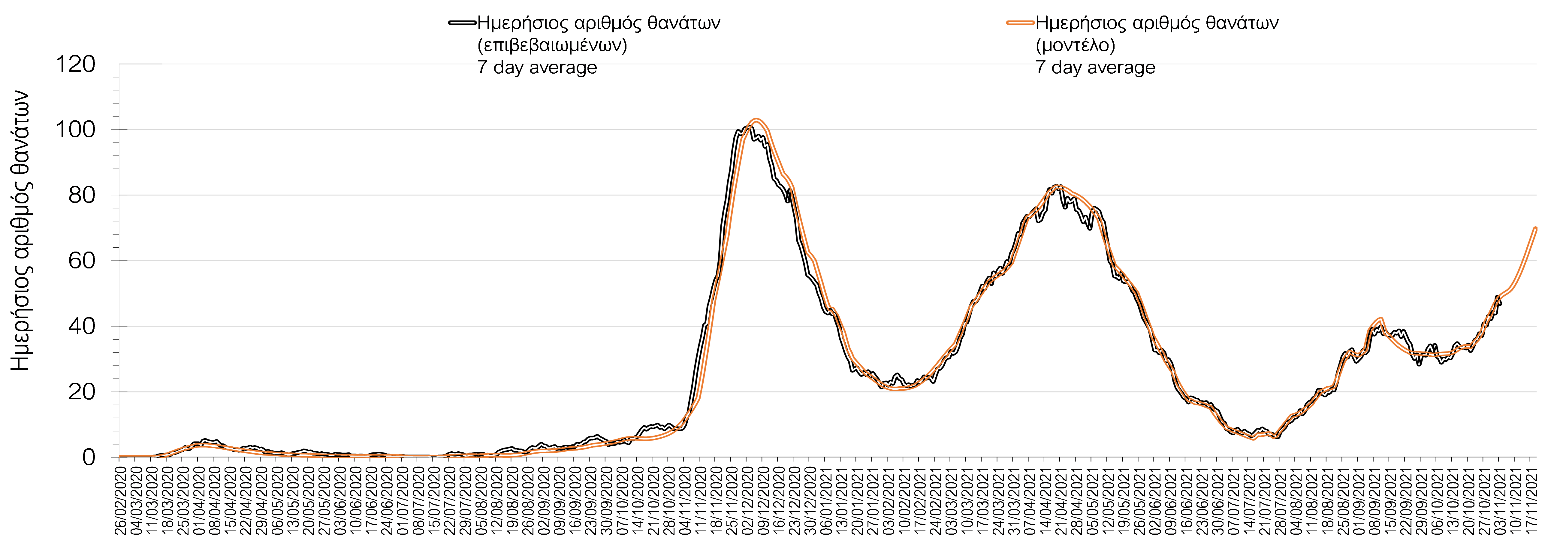 Σχήμα 3. Αριθμός θανάτων (κυλιόμενος μέσος όρος 7 ημερών) σύμφωνα με τα στοιχεία του ΕΟΔΥ και τις προβλέψεις της υπολογιστικής πλατφόρμας CORE.