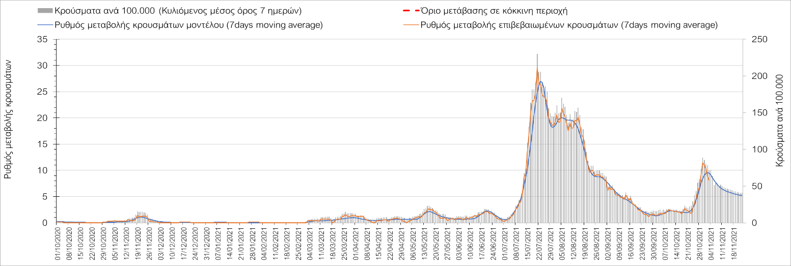 Η αποτύπωση των τάσεων στις επιμέρους περιοχές, παρουσιάζεται στο Σχήμα 61, όπου παρουσιάζεται ο ρυθμός μεταβολής των νέων κρουσμάτων ανά 100.000 κατοίκους (κυλιόμενος μέσος όρος 7 ημερών) των επιμέρους περιοχών. Θετικές τιμές του ρυθμού μεταβολής υποδηλώνουν άνοδο, ενώ αρνητικές τιμές υποδηλώνουν πτωτική πορεία. Το σχήμα αυτό είναι ιδιαίτερα κατατοπιστικό, γιατί οι τιμές που παρουσιάζονται είναι κανονικοποιημένες ως προς τον πληθυσμό, και η σύγκριση των τάσεων ανάμεσα στις επιμέρους περιοχές είναι άμεση. Με βάση και τα σημερινά δεδομένα, πολύ λίγες περιοχές της χώρα παρουσιάζουν αποκλιμάκωση της πανδημίας, πέρα από κάποιες που είναι είτε σε σταθεροποίηση (Καστοριά), είτε διανύουν διακυμάνσεις από μέρα σε μέρα (Βοιωτία).