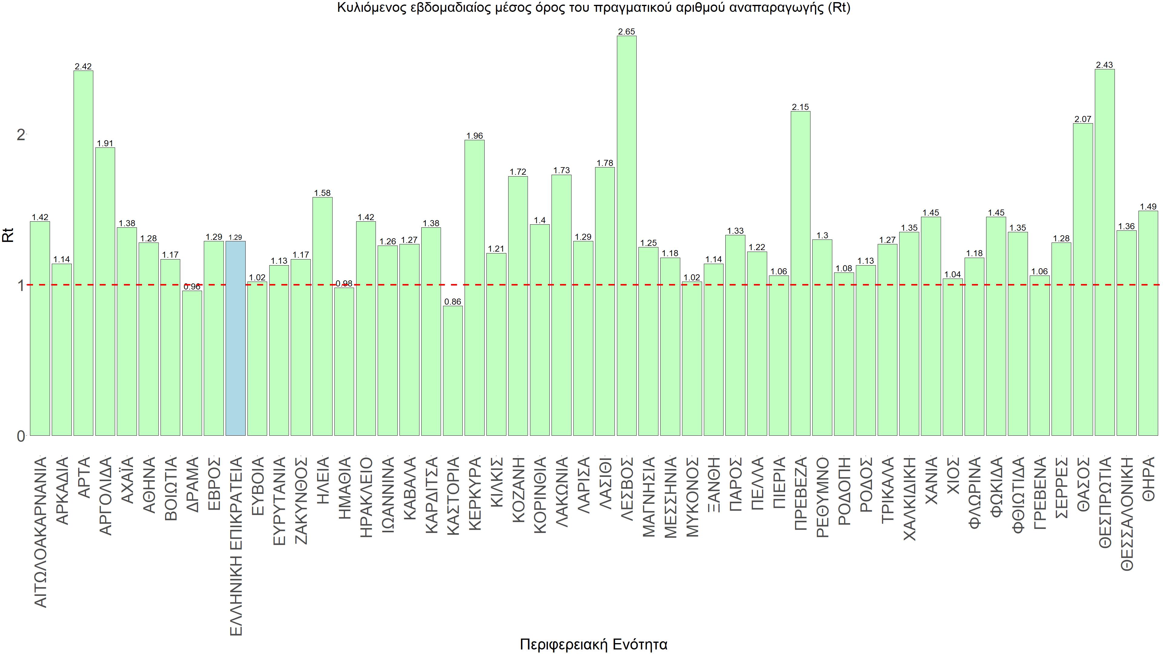 O πραγματικός αριθμός αναπαραγωγής Rt ανά περιφερειακή ενότητα της χώρας παρουσιάζεται στο Σχήμα 58.