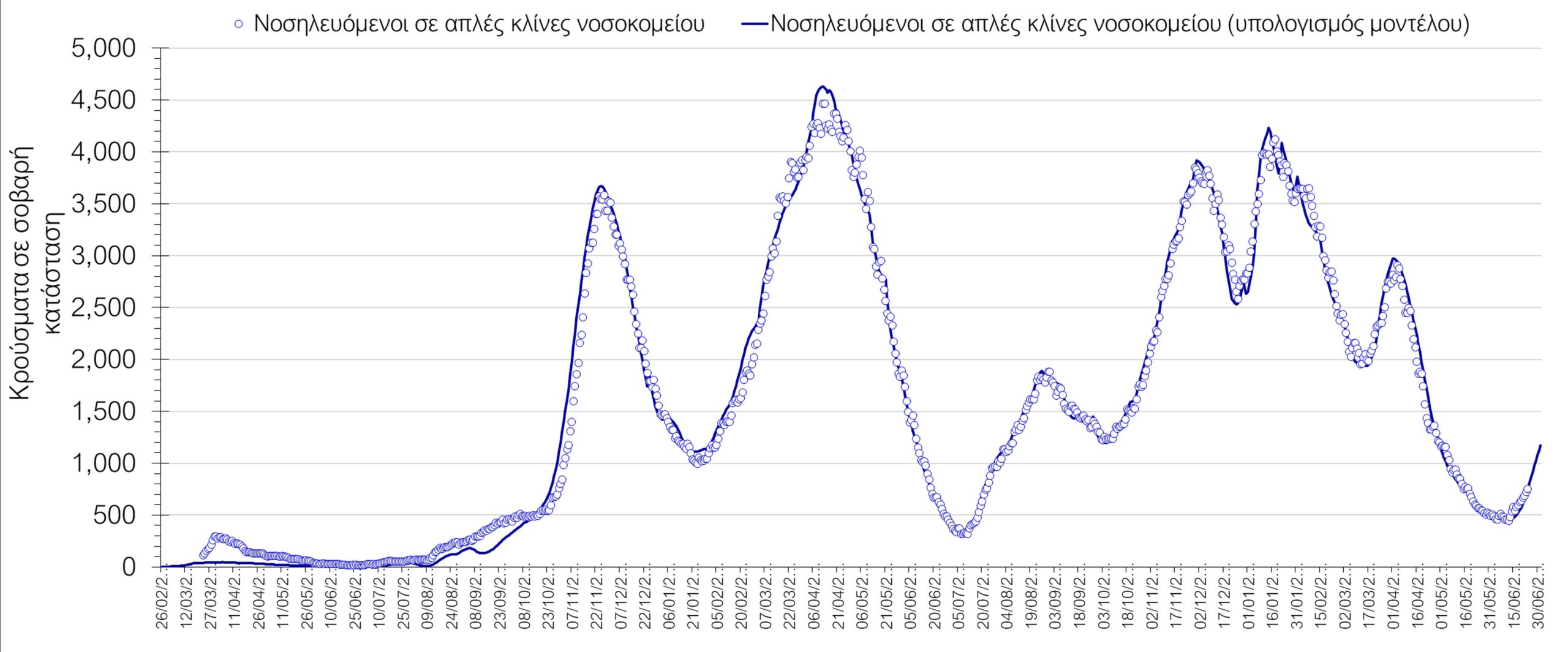 Σχήμα 2. Αριθμός κρουσμάτων σε σοβαρή κατάσταση (νοσηλευόμενοι σε απλές κλίνες) σύμφωνα με τα στοιχεία του ΕΟΔΥ και τις προβλέψεις της υπολογιστικής πλατφόρμας CORE.