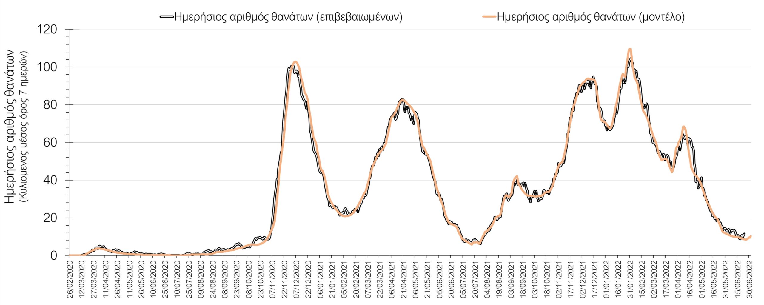 Σχήμα 3. Αριθμός θανάτων (κυλιόμενος μέσος όρος 7 ημερών) σύμφωνα με τα στοιχεία του ΕΟΔΥ και τις προβλέψεις της υπολογιστικής πλατφόρμας CORE.