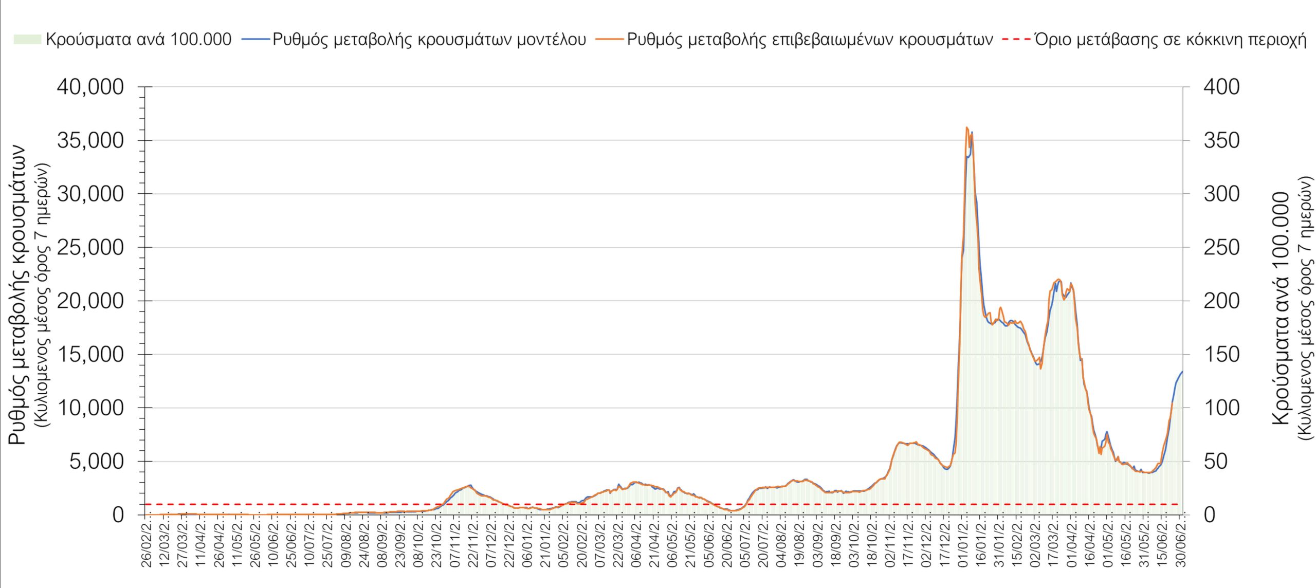 Η πορεία της μέσης εβδομαδιαίας τιμής των κρουσμάτων, καθώς και του κυλιόμενου μέσου όρου 7 ημερών του αριθμού των κρουσμάτων ανά 100.000 πληθυσμού, όπως έχουν καταγραφεί από τον ΕΟΔΥ και η αναμενόμενη πορεία τους, όπως προδιαγράφεται από την υπολογιστική πλατφόρμα CORE για την Ελληνική επικράτεια (όπως και στην Αττική και τη Θεσσαλονίκη) μέχρι τις 30 Ιουνίου, αποτυπώνονται στο Σχήμα 4. Αυτή η προβλεπόμενη πορεία, που αφορά τα κρούσματα, τους νοσηλευόμενους σε απλές κλίνες, όσο και σε ΜΕΘ, καθώς επίσης και τους θανάτους, βασίζεται στις ακόλουθες παραδοχές: