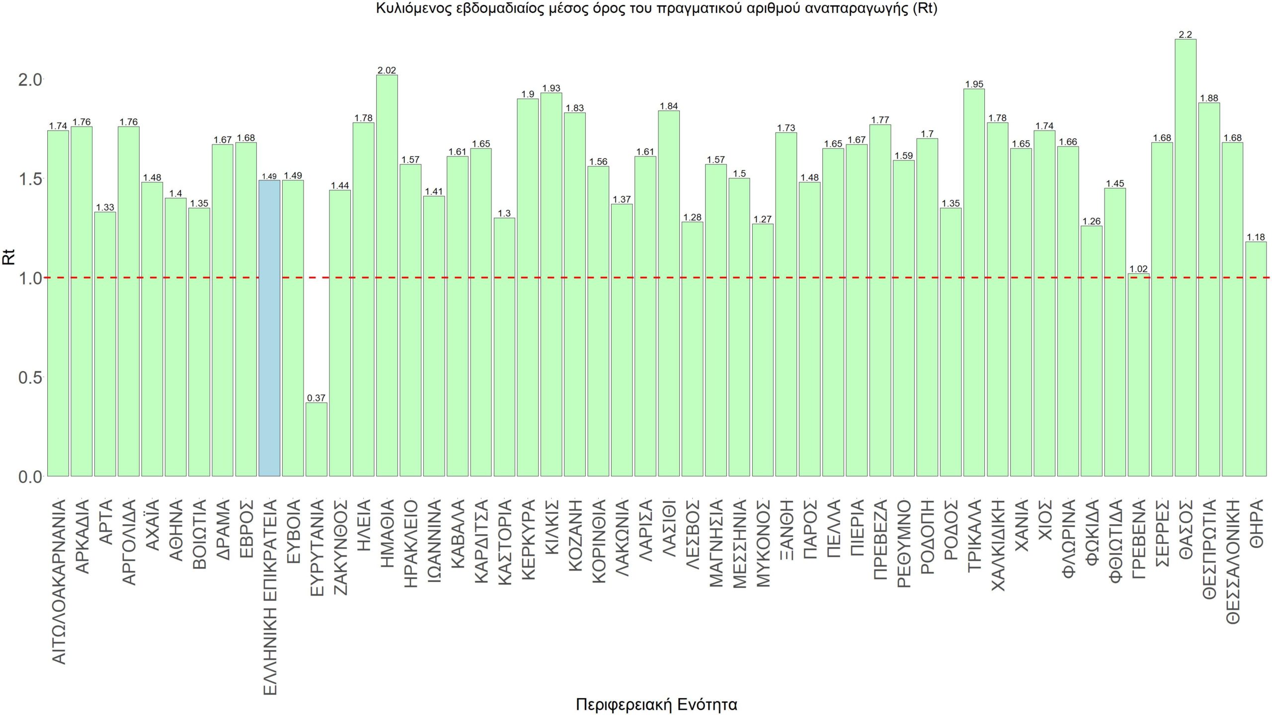 O πραγματικός αριθμός αναπαραγωγής Rt ανά περιφερειακή ενότητα της χώρας παρουσιάζεται στο Σχήμα 58.