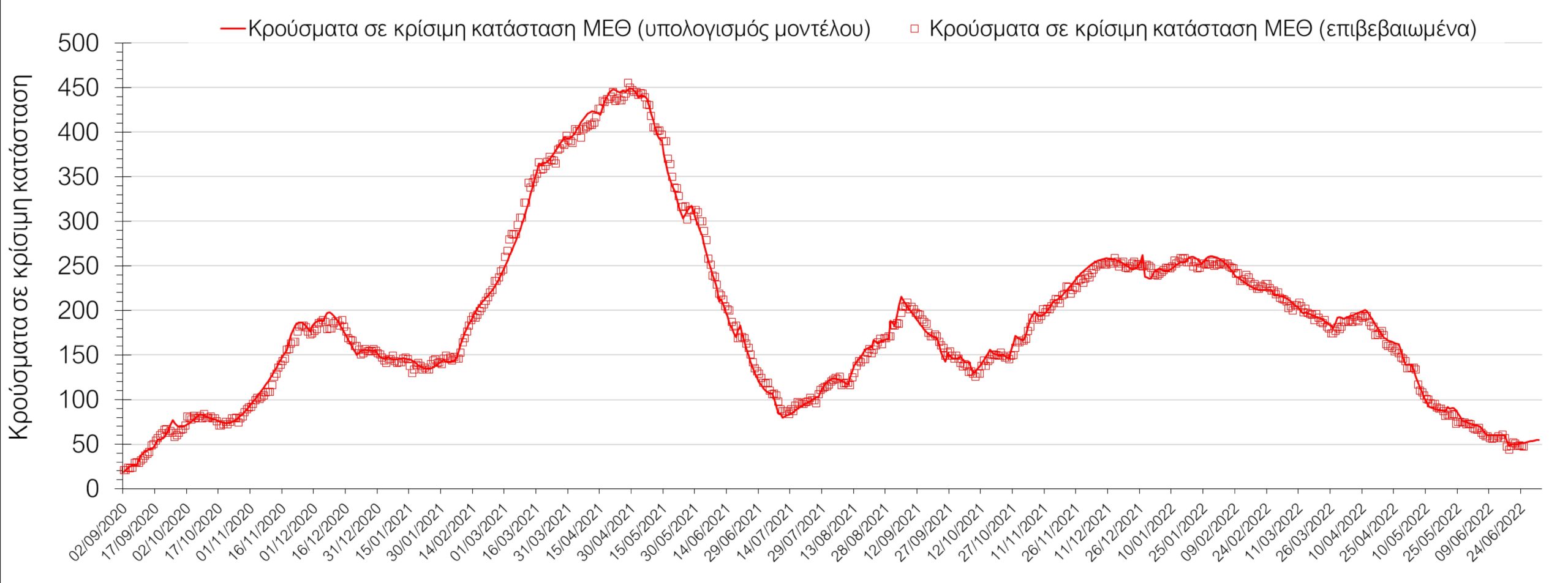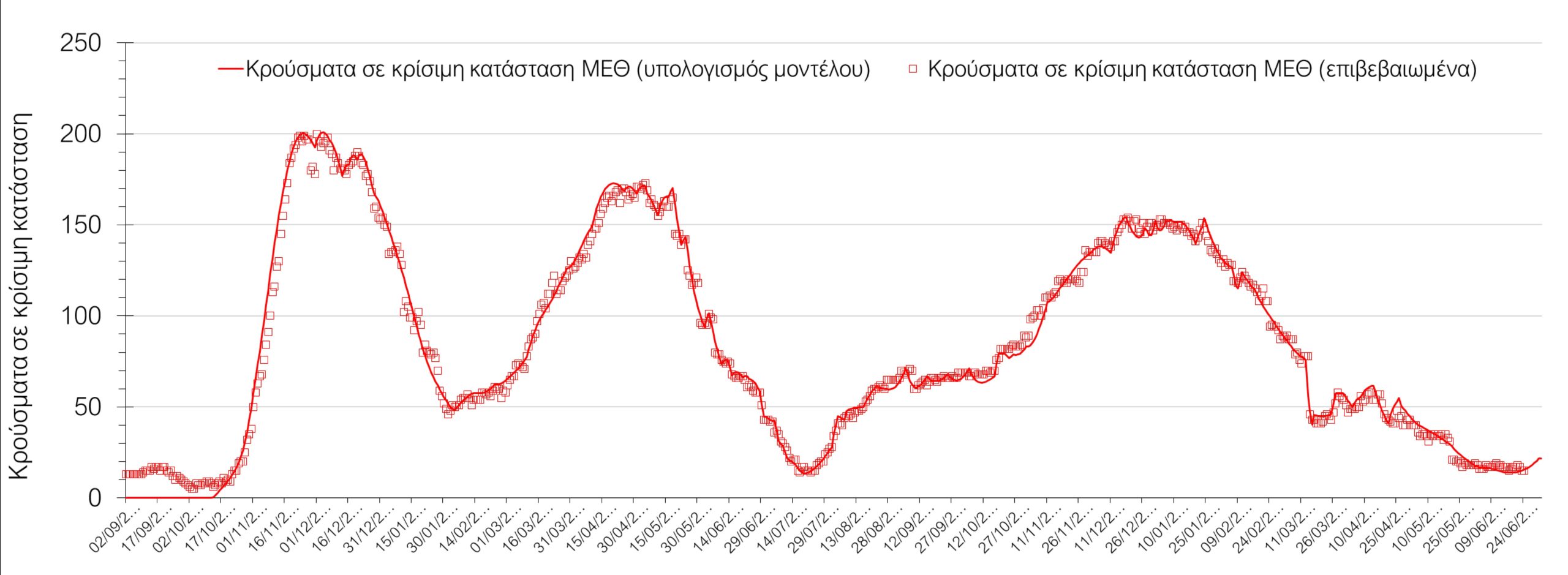 Σχήμα 8. Αριθμός κρουσμάτων σε κρίσιμη κατάσταση (ΜΕΘ) σύμφωνα με τα στοιχεία του ΕΟΔΥ και τις προβλέψεις της