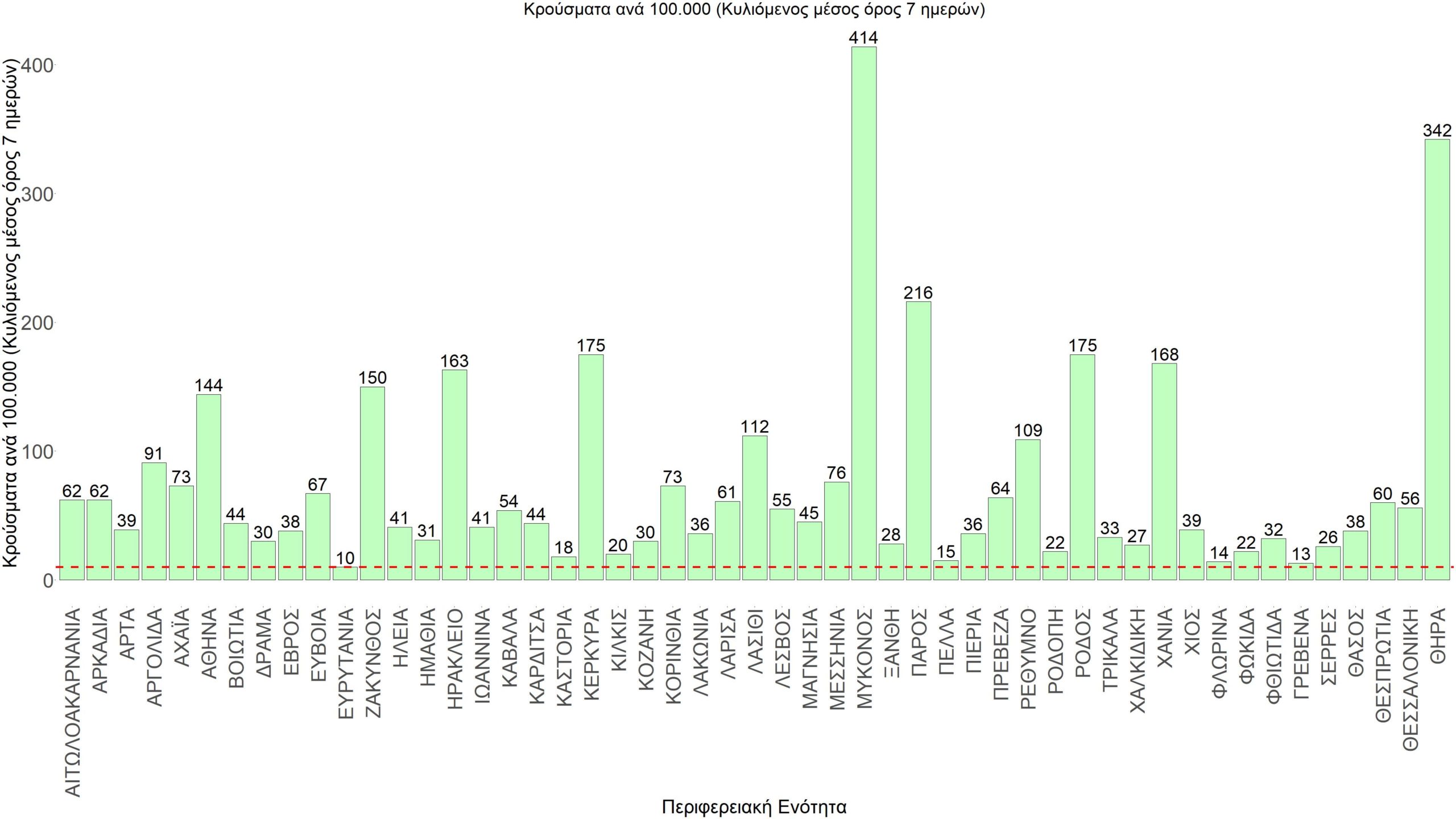 Η συγκεντρωτική εικόνα των νέων κρουσμάτων ανά 100.000 κατοίκους (κυλιόμενος μέσος όρος 7 ημερών) των επιμέρους περιοχών παρουσιάζεται στο Σχήμα 60. Όλες οι περιοχές παραμένουν πάνω από το όριο ανησυχίας.