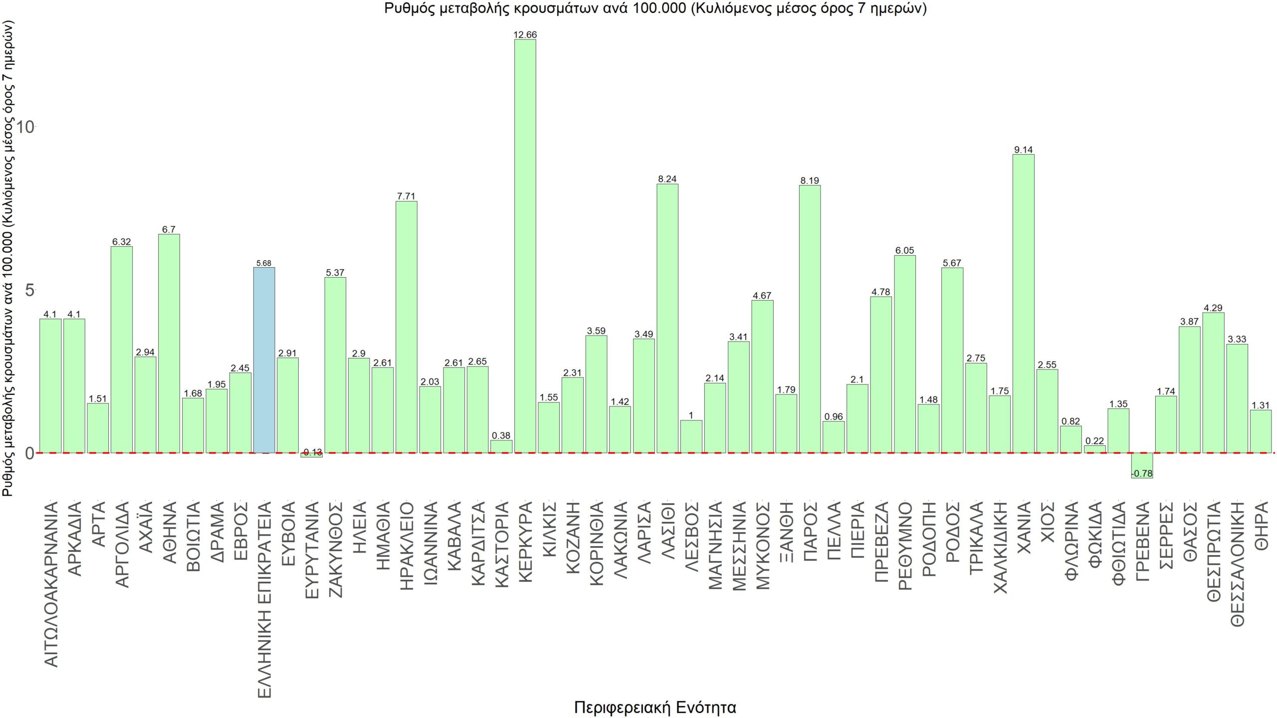 Η αποτύπωση των τάσεων στις επιμέρους περιοχές, παρουσιάζεται στο Σχήμα 61, όπου παρουσιάζεται ο ρυθμός μεταβολής των νέων κρουσμάτων ανά 100.000 κατοίκους (κυλιόμενος μέσος όρος 7 ημερών) των επιμέρους περιοχών. Θετικές τιμές του ρυθμού μεταβολής υποδηλώνουν άνοδο, ενώ αρνητικές τιμές υποδηλώνουν πτωτική πορεία.