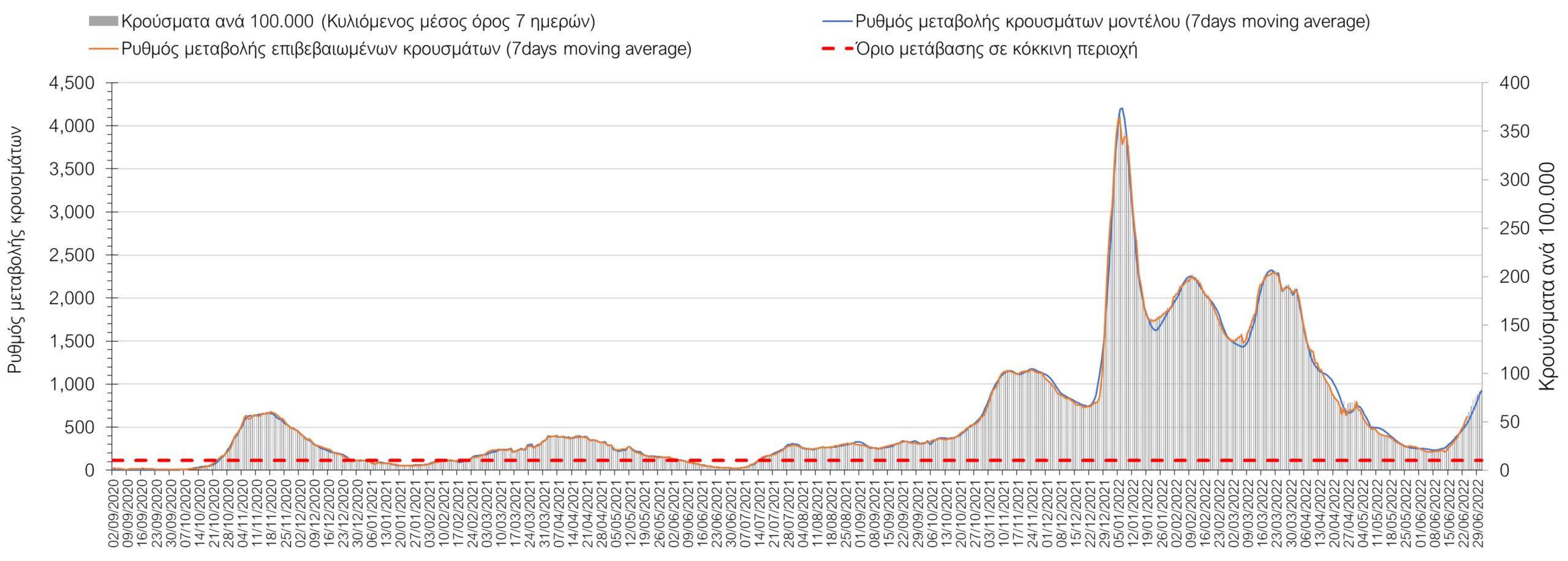 Ο αριθμός των κρουσμάτων που παρατηρείται, είναι σημαντικά υψηλότερος από αυτόν που αναμέναμε όταν ξεκίνησε η αποκλιμάκωση του 5ου κύματος και υποδηλώνει διαφυγή ανοσίας. O κυρίως λόγος που συμβαίνει αυτή η διαφυγή ανοσίας, είναι η καθυστέρηση της εφαρμογής της αναμνηστικής δόσης, με δεδομένη τη σημαντική διαφορά στην αποτελεσματικότητα προστασίας μεταξύ εμβολιασμένων με 2 δόσεις και με 3. Επίσης, σημαντική διαφυγή ανοσίας υπάρχει λόγω του αυξημένου ρυθμού επαναμολύνσεων ακόμα και σε σύντομο διάστημα από προηγούμενη μόλυνση, που αποτελεί χαρακτηριστικό του νέου υποστελέχους της Ο (ΒΑ.2, ή παραλλαγή Ο-2), το οποίο είναι ακόμη πιο μεταδοτικό από την παραλλαγή Ο κατά 33% μεσοσταθμικά. Συνεπώς, ο συνδυασμός επιβράδυνσης της 3ης δόσης και της παρουσίας του νέου στελέχους, οδήγησαν σε ένα νέο κύμα που έχει ήδη καθυστερήσει επιπλέον την ταχύτερη αποκλιμάκωση, ενώ τις τελευταίες ημέρες παρατηρούμε μια επιπλέον ανοδική διακύμανση, απόρροια της απώλειας ανοσίας και της πλήρους χαλάρωσης των μέτρων. Ο αριθμός των κρουσμάτων που εντοπίστηκαν είναι ιδιαίτερα υψηλός και με βάση και τα τελευταία δεδομένα αλληλούχισης των φορέων που παρουσιάστηκαν από τον ΕΟΔΥ, επιβεβαιώνεται ότι το νέο ανοδικό κύμα που διανύουμε εδώ και 15 ημέρες, οφείλεται στην παρουσία των νέων μεταλλαγμένων στελεχών ΒΑ.4/5, το οποίο εμφανίστηκε ως απόρροια των τουριστικών ροών.