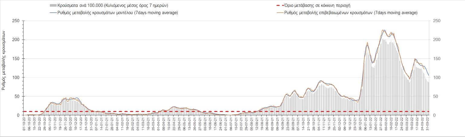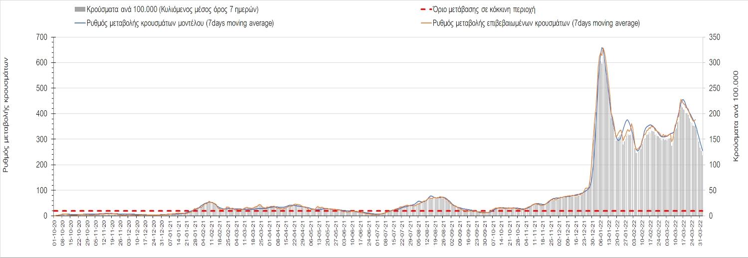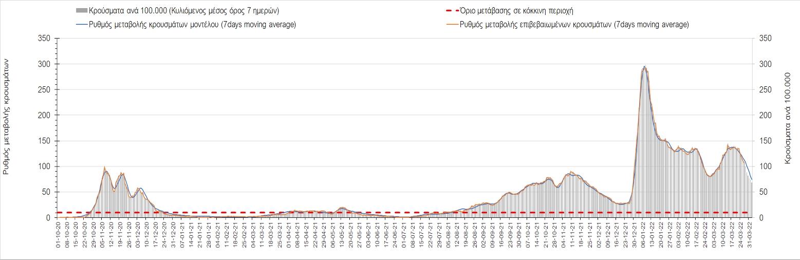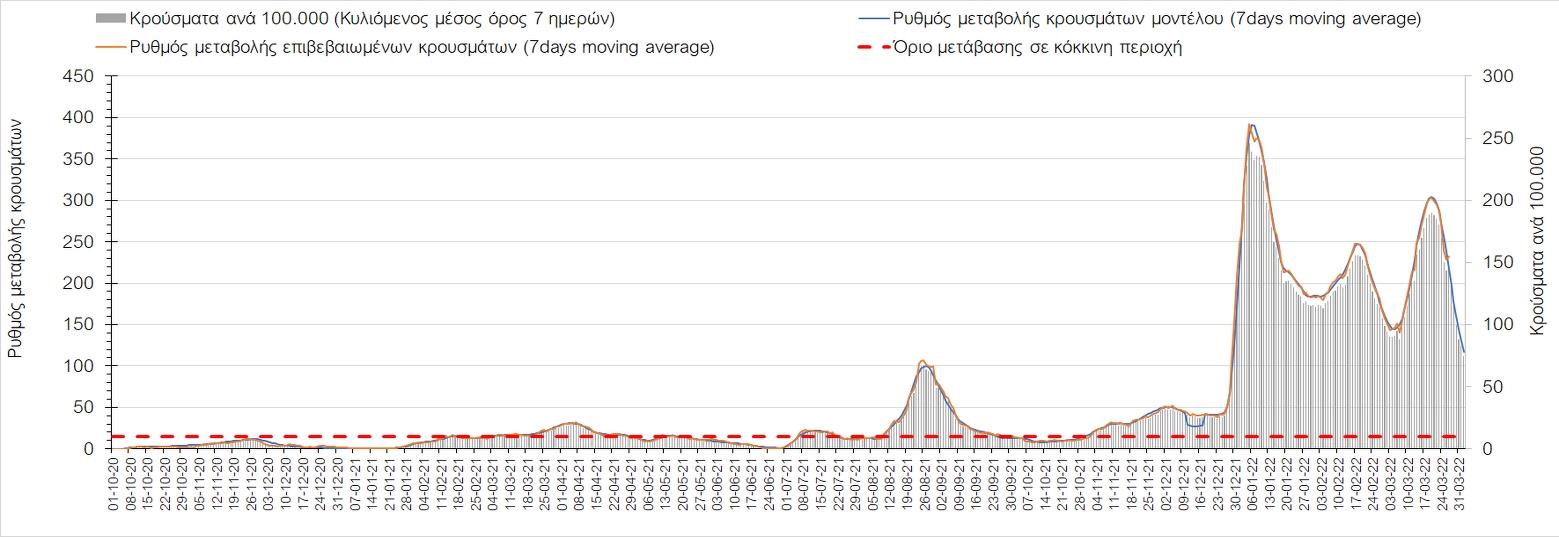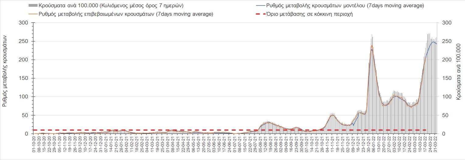 Η πορεία της μέσης εβδομαδιαίας τιμής των κρουσμάτων, καθώς και του κυλιόμενου μέσου όρου 7 ημερών του αριθμού των κρουσμάτων ανά 100.000 πληθυσμού, όπως έχουν καταγραφεί από τον ΕΟΔΥ και η αναμενόμενη πορεία τους, όπως προδιαγράφεται από την υπολογιστική πλατφόρμα CORE για την Ελληνική επικράτεια (όπως και στην Αττική και τη Θεσσαλονίκη) μέχρι τις 30 Μαρτίου, αποτυπώνονται στο Σχήμα 4. Αυτή η προβλεπόμενη πορεία, που αφορά τα κρούσματα, τους νοσηλευόμενους σε απλές κλίνες, όσο και σε ΜΕΘ, καθώς επίσης και τους θανάτους, βασίζεται στις ακόλουθες παραδοχές: