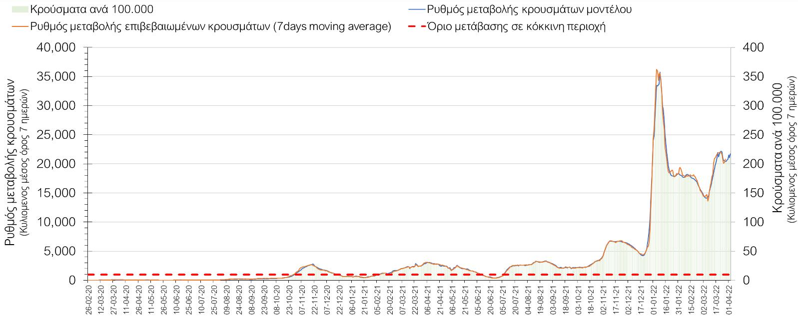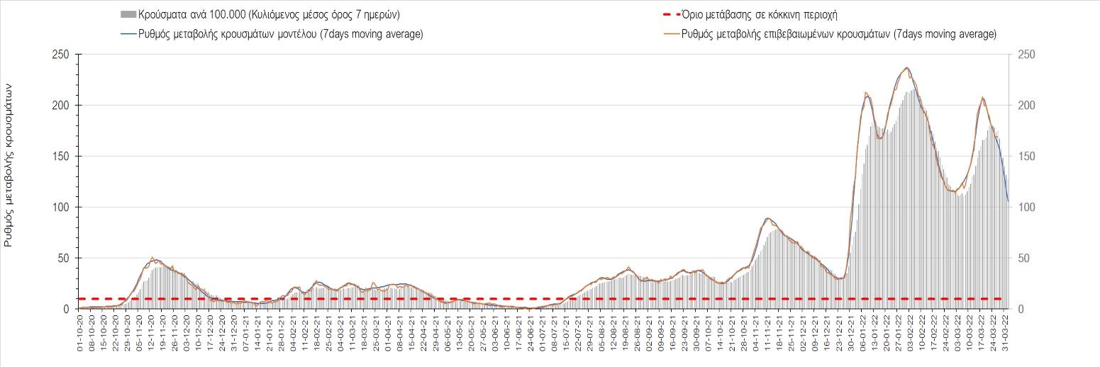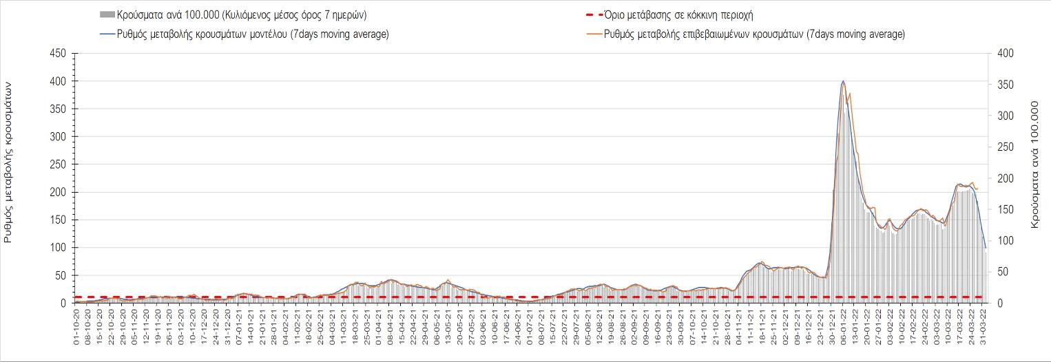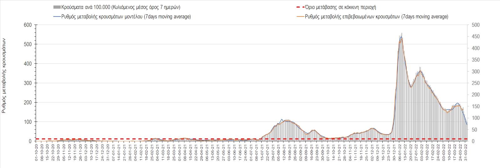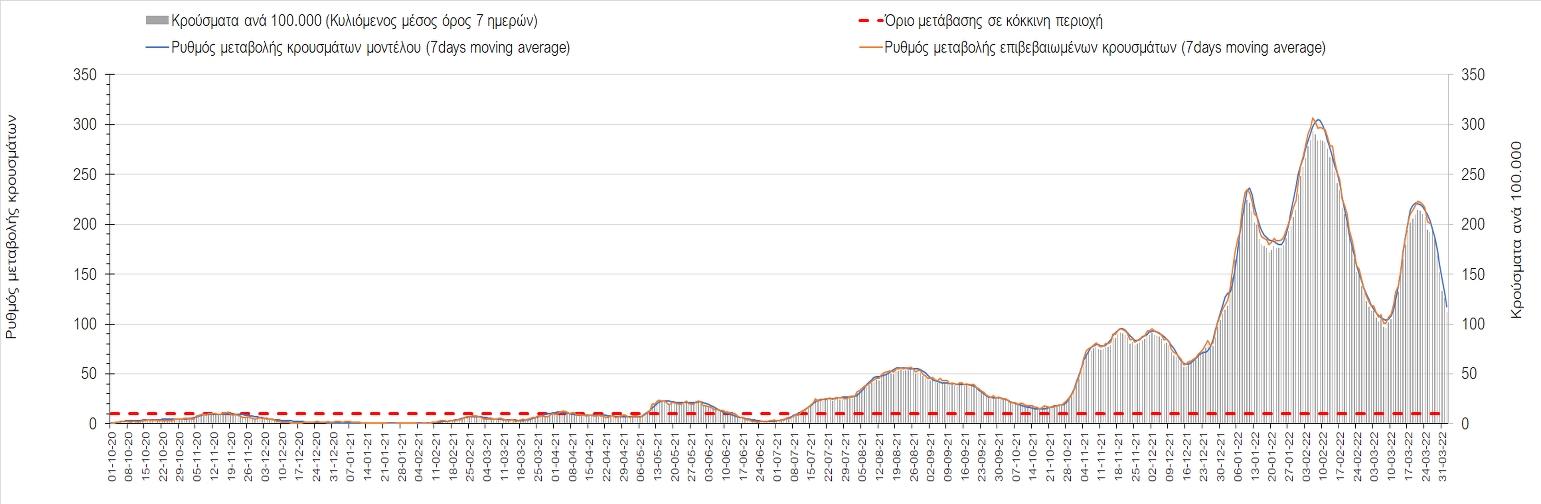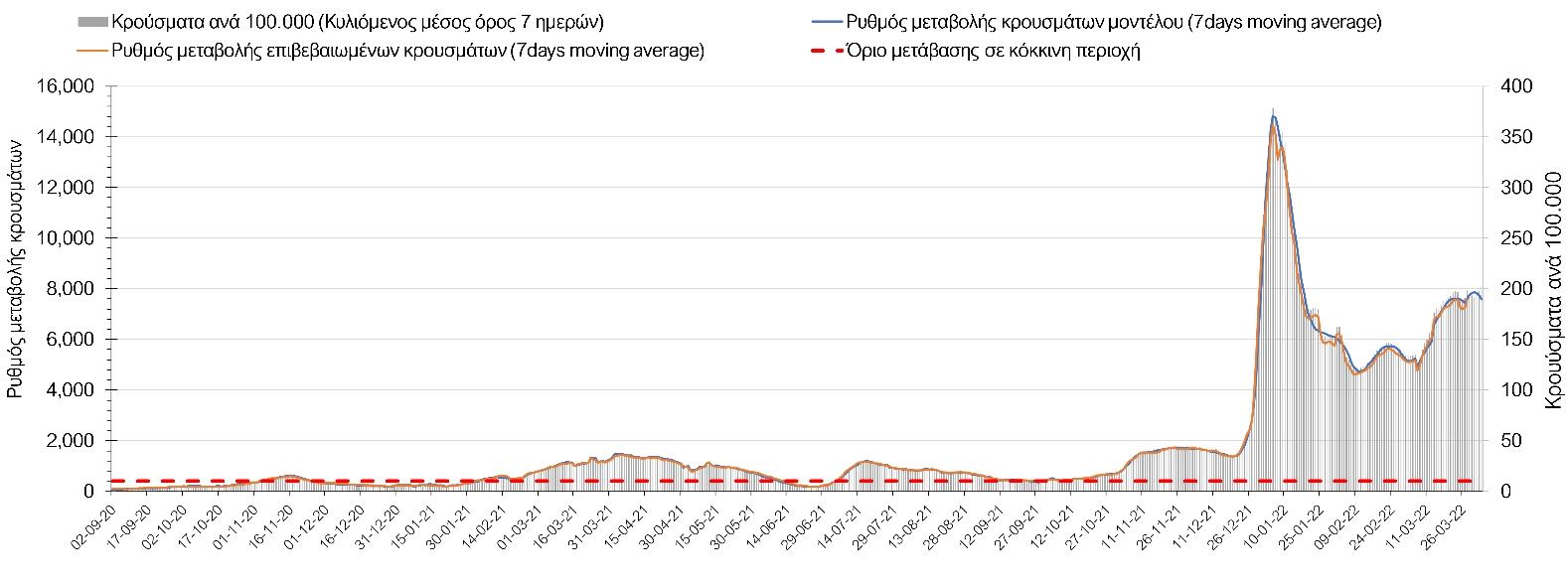 Η πορεία της μέσης εβδομαδιαίας τιμής των κρουσμάτων, καθώς και του κυλιόμενου μέσου όρου 7 ημερών του αριθμού των κρουσμάτων ανά 100.000 πληθυσμού, όπως έχουν καταγραφεί από τον ΕΟΔΥ και η αναμενόμενη πορεία τους, όπως προδιαγράφεται από την υπολογιστική πλατφόρμα CORE για την Ελληνική επικράτεια (όπως και στην Αττική και τη Θεσσαλονίκη) μέχρι τις 30 Μαρτίου, αποτυπώνονται στο Σχήμα 4. Αυτή η προβλεπόμενη πορεία, που αφορά τα κρούσματα, τους νοσηλευόμενους σε απλές κλίνες, όσο και σε ΜΕΘ, καθώς επίσης και τους θανάτους, βασίζεται στις ακόλουθες παραδοχές: