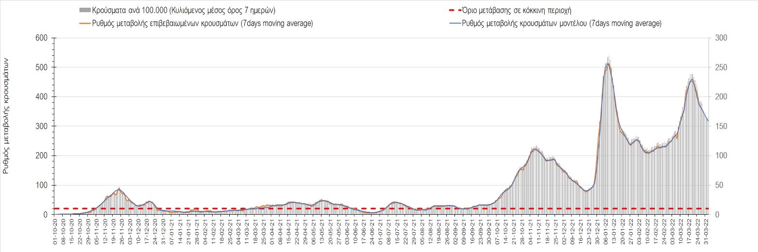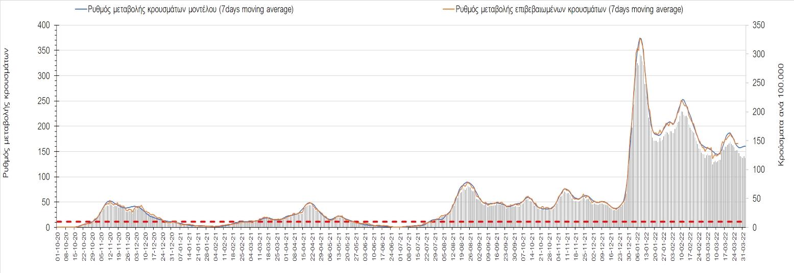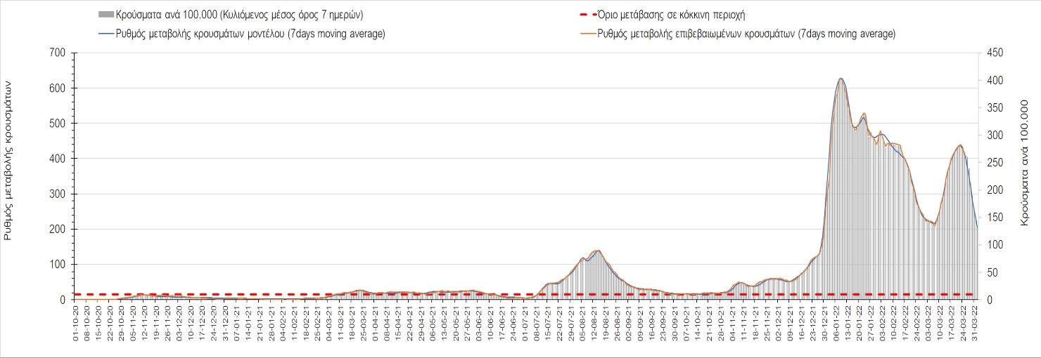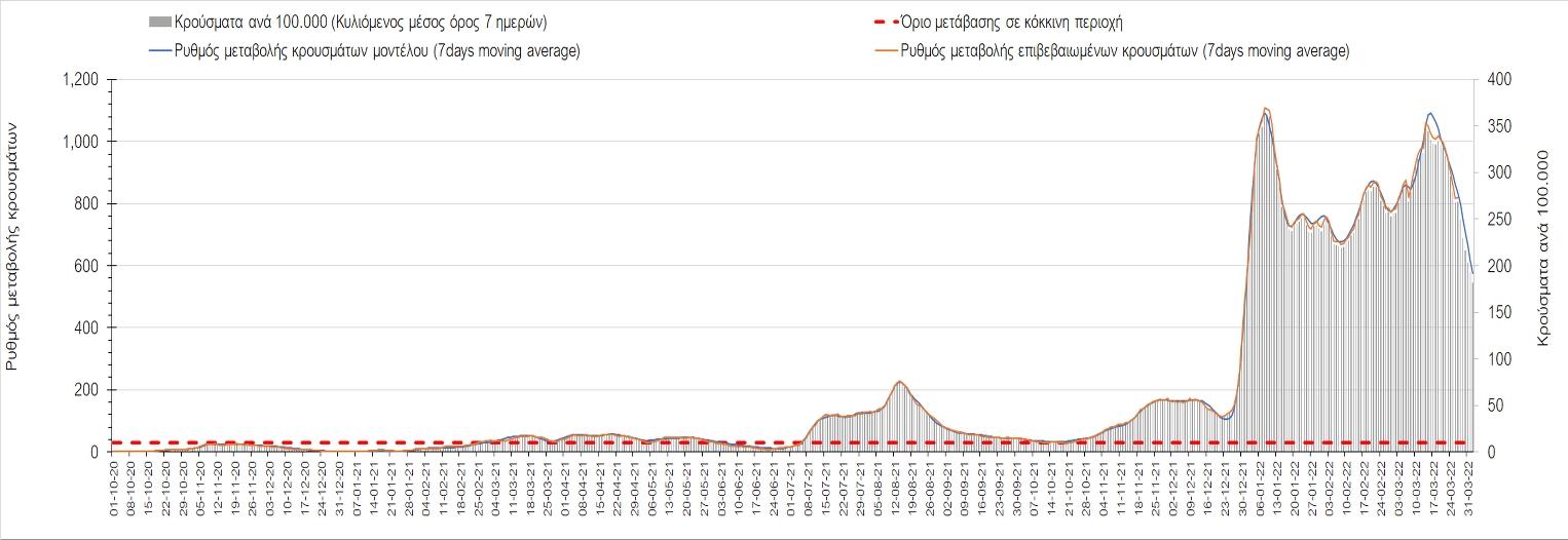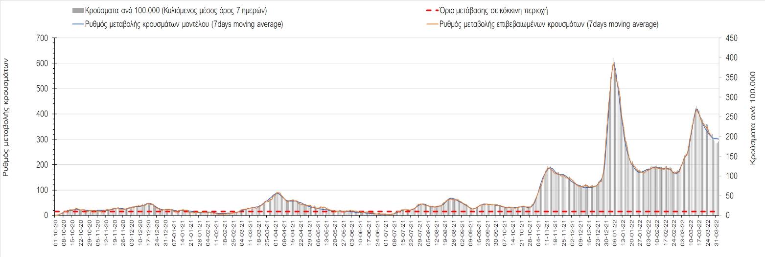 Η πορεία της μέσης εβδομαδιαίας τιμής των κρουσμάτων, καθώς και του κυλιόμενου μέσου όρου 7 ημερών του αριθμού των κρουσμάτων ανά 100.000 πληθυσμού, όπως έχουν καταγραφεί από τον ΕΟΔΥ και η αναμενόμενη πορεία τους, όπως προδιαγράφεται από την υπολογιστική πλατφόρμα CORE για την Ελληνική επικράτεια (όπως και στην Αττική και τη Θεσσαλονίκη) μέχρι τις 30 Μαρτίου, αποτυπώνονται στο Σχήμα 4. Αυτή η προβλεπόμενη πορεία, που αφορά τα κρούσματα, τους νοσηλευόμενους σε απλές κλίνες, όσο και σε ΜΕΘ, καθώς επίσης και τους θανάτους, βασίζεται στις ακόλουθες παραδοχές: