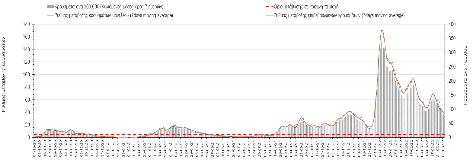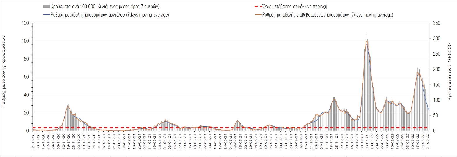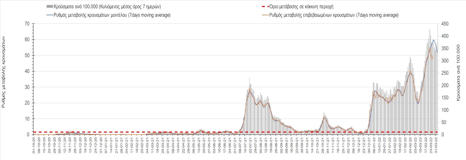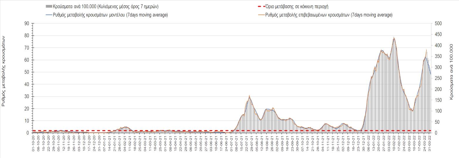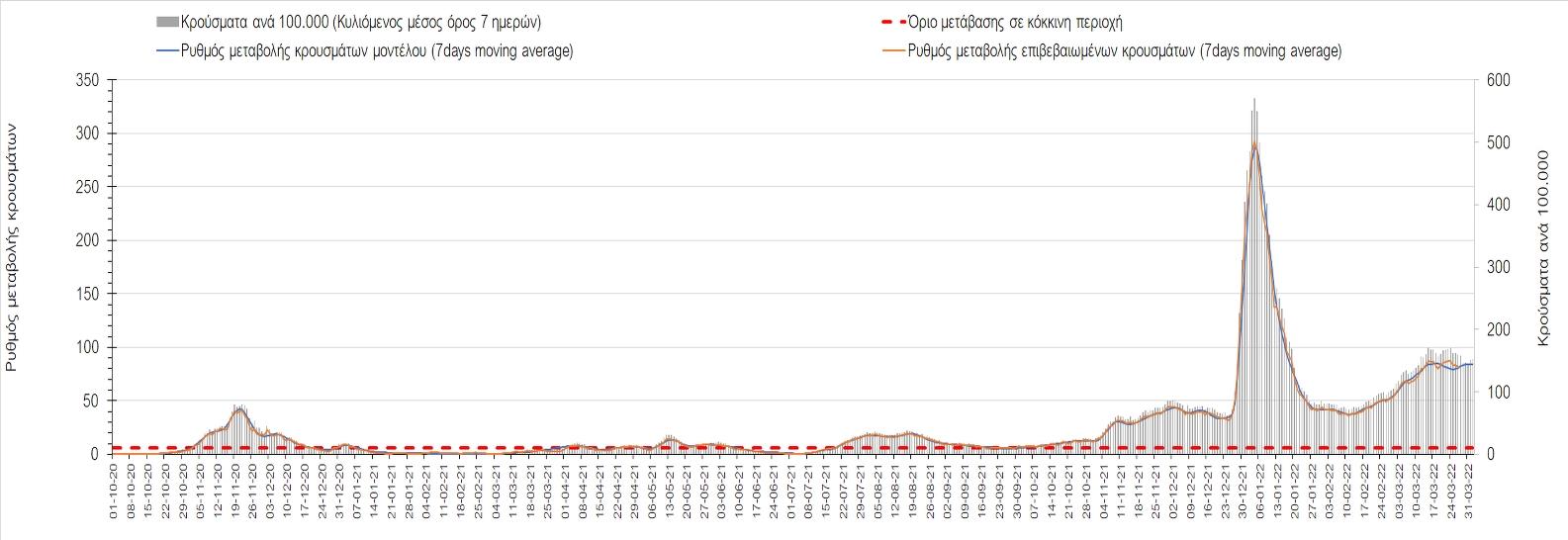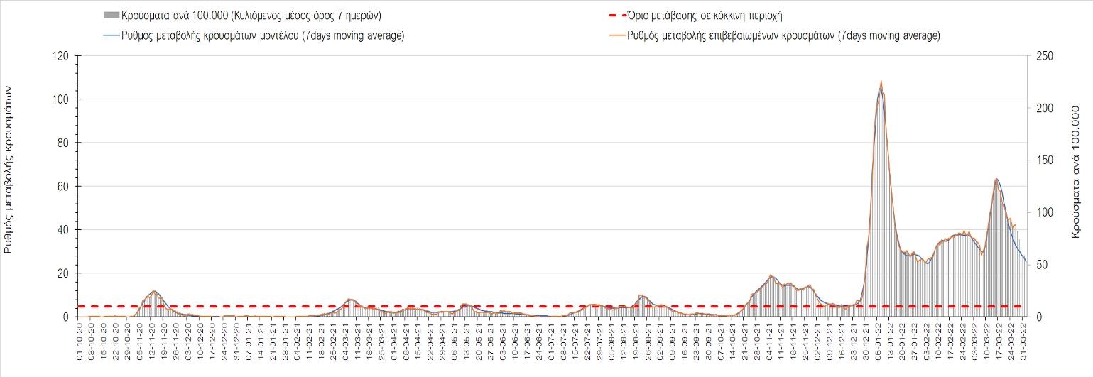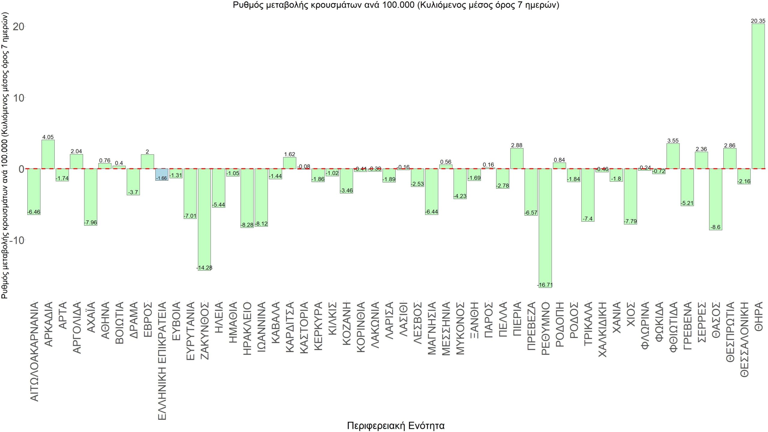 Η αποτύπωση των τάσεων στις επιμέρους περιοχές, παρουσιάζεται στο Σχήμα 61, όπου παρουσιάζεται ο ρυθμός μεταβολής των νέων κρουσμάτων ανά 100.000 κατοίκους (κυλιόμενος μέσος όρος 7 ημερών) των επιμέρους περιοχών. Θετικές τιμές του ρυθμού μεταβολής υποδηλώνουν άνοδο, ενώ αρνητικές τιμές υποδηλώνουν πτωτική πορεία.