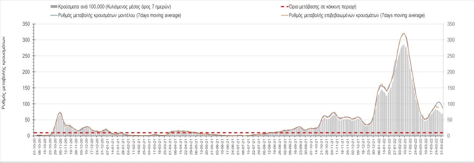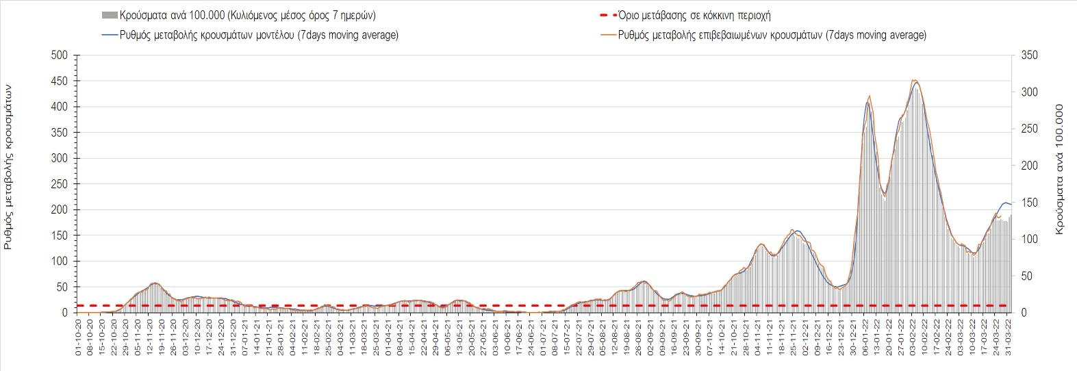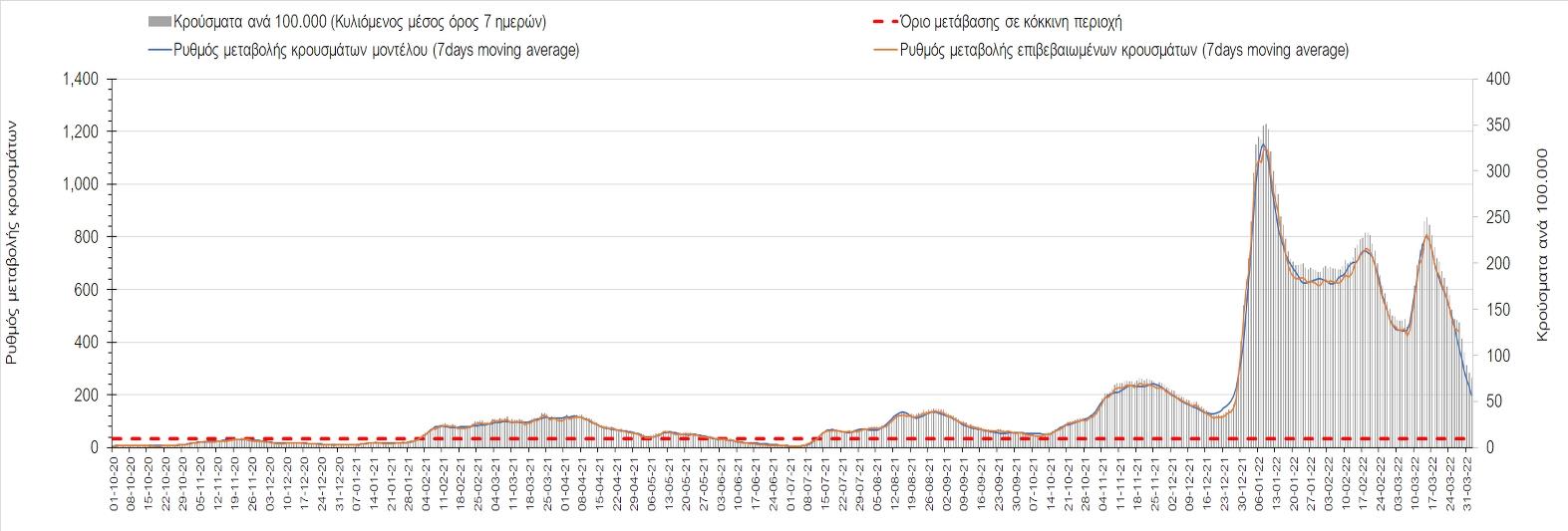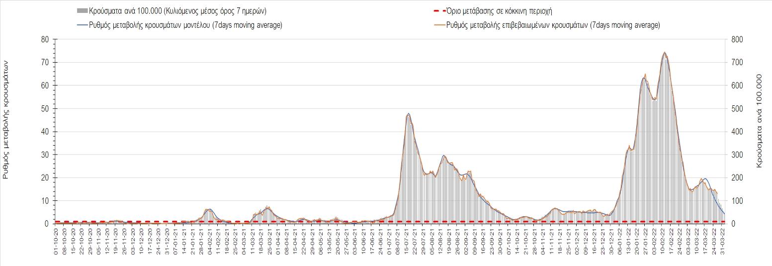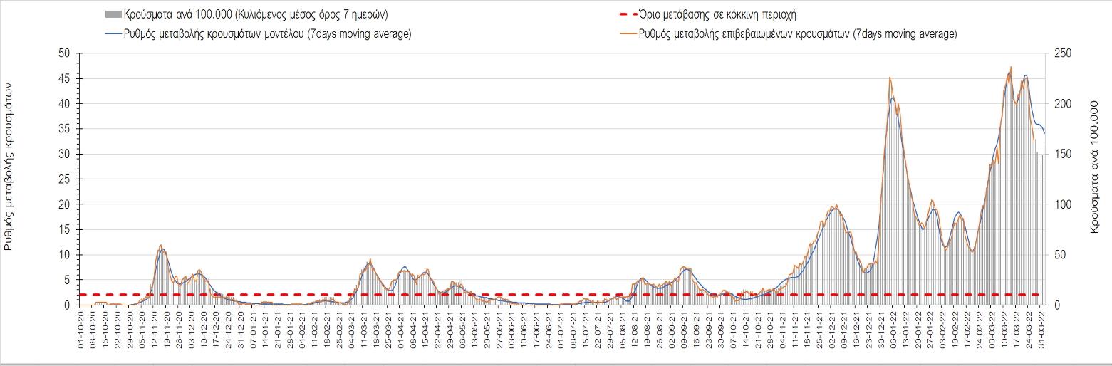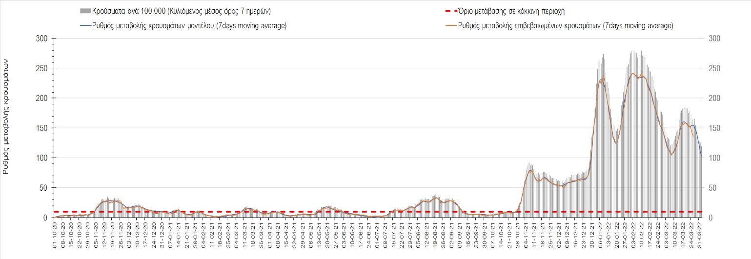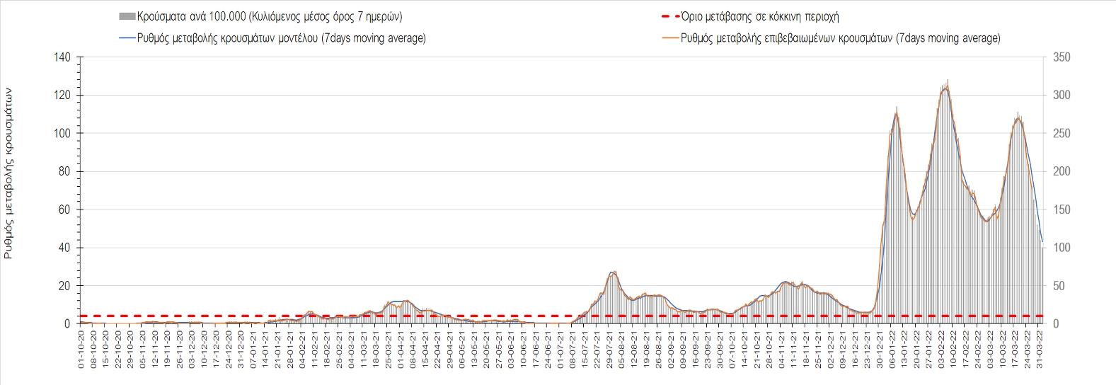 Η αποτύπωση των τάσεων στις επιμέρους περιοχές, παρουσιάζεται στο Σχήμα 61, όπου παρουσιάζεται ο ρυθμός μεταβολής των νέων κρουσμάτων ανά 100.000 κατοίκους (κυλιόμενος μέσος όρος 7 ημερών) των επιμέρους περιοχών. Θετικές τιμές του ρυθμού μεταβολής υποδηλώνουν άνοδο, ενώ αρνητικές τιμές υποδηλώνουν πτωτική πορεία.