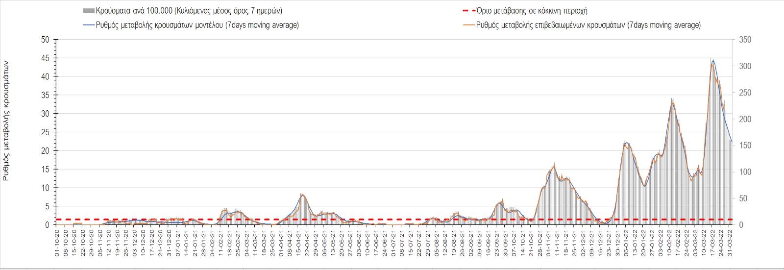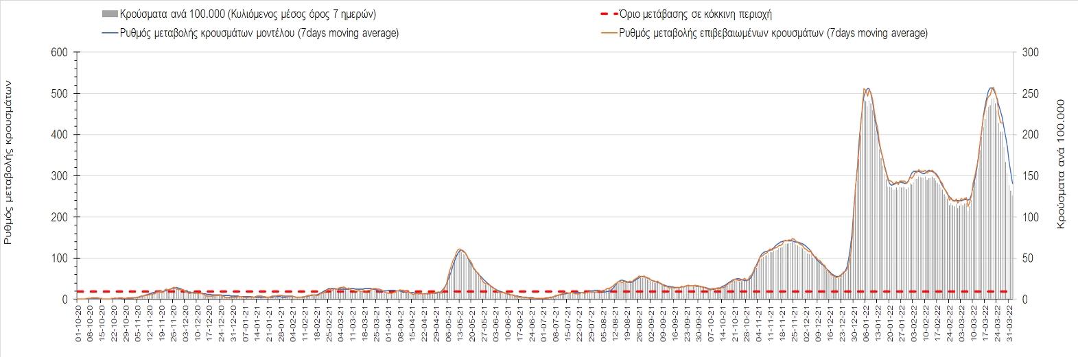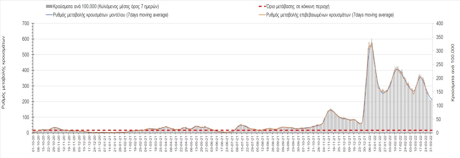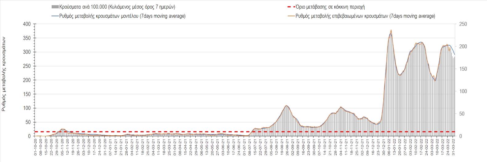 Πλέον παρατηρείται κάμψη της ανοδικής πορείας που αντικατοπτρίζεται και στον ημερήσιο αριθμό των κρουσμάτων (κυλιόμενος μέσος όρος 7 ημερών), ο οποίος αν και σήμερα εμφανίζει οριακή άνοδο, βρίσκεται μόλις κάτω από τις 21.000 (20.817). Για να επανέλθει η συστηματική αποκλιμάκωση της πανδημίας, πέρα από την εφαρμογή των μέτρων (σε συνδυασμό με την σημαντική συνειδητοποίηση εκ μέρους του πληθυσμού ότι χρειάζεται προσοχή και σύνεση για την αντιμετώπιση της διασποράς της παραλλαγής Ο), θα πρέπει να στοχεύσουμε στη διατήρηση και την επέκταση της επίκτητης ανοσίας του πληθυσμού, αλλά και στον πολύ μεγάλο αριθμό των τεστ συνολικά (μοριακά, rapid και self-test) που πραγματοποιούνται καθημερινά, των οποίων ο αριθμός έχει φθάσει σε ημερήσια βάση τις 700.000. Για αυτό το λόγο και με δεδομένη τη μεγάλη διασπορά στα σχολεία θεωρούμε πρόωρη τη μείωση των self-test στα παιδιά σχολικής ηλικίας σε ένα μόνο την εβδομάδα από τα δύο που γίνονταν μέχρι τώρα.