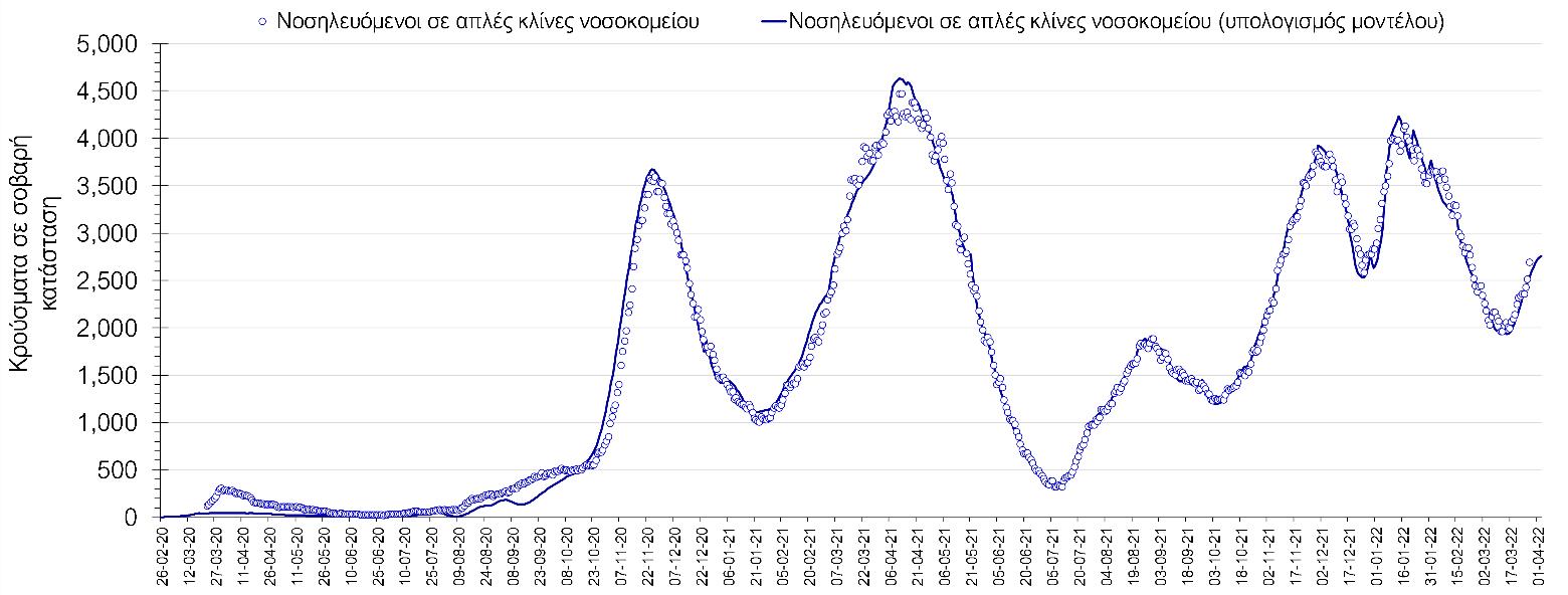 Σχήμα 2. Αριθμός κρουσμάτων σε σοβαρή κατάσταση (νοσηλευόμενοι σε απλές κλίνες) σύμφωνα με τα στοιχεία του ΕΟΔΥ και τις προβλέψεις της υπολογιστικής πλατφόρμας CORE.