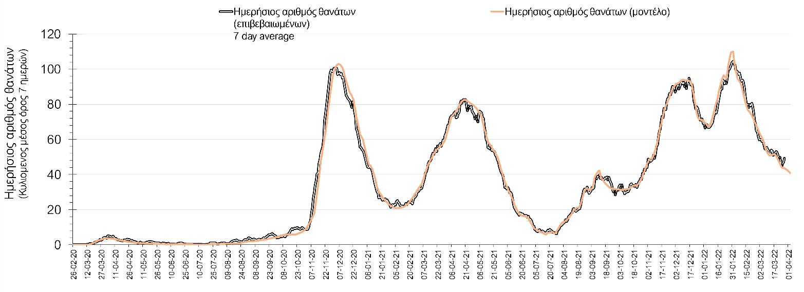 Ο αριθμός ημερήσιων θανάτων (73) που καταγράφηκε είναι σημαντικά υψηλότερος σε σχέση με την Κυριακή (52). Όπως είχαμε προβλέψει ο κυλιόμενος εβδομαδιαίος μέσος όρος που είναι 47,1 παραμένει υψηλός, ιδιαίτερα σε σχέση με τον αριθμό των νοσηλειών σε κρίσιμη κατάσταση (διασωληνωμένοι σε ΜΕΘ).