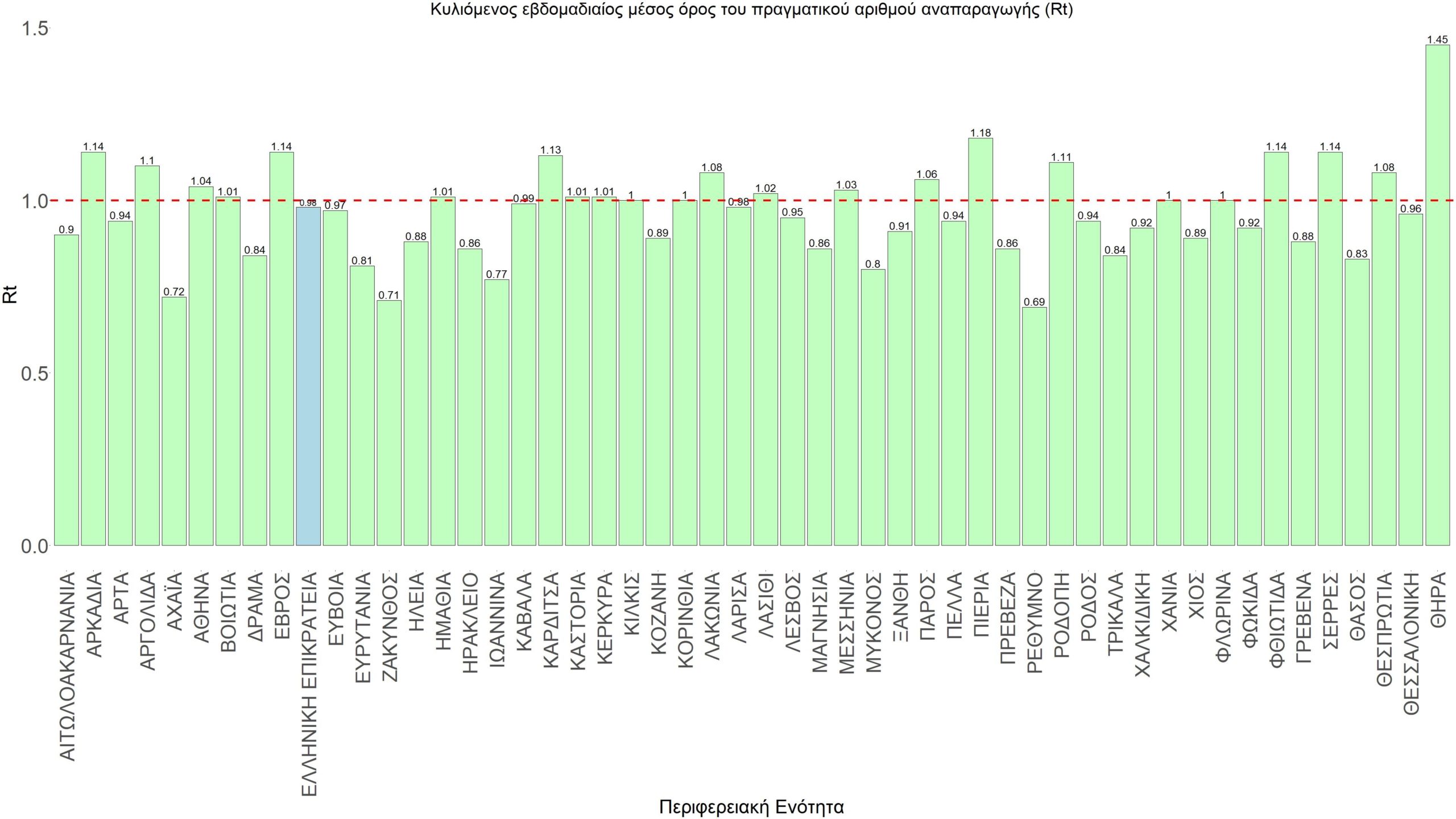 O πραγματικός αριθμός αναπαραγωγής Rt ανά περιφερειακή ενότητα της χώρας παρουσιάζεται στο Σχήμα 58.