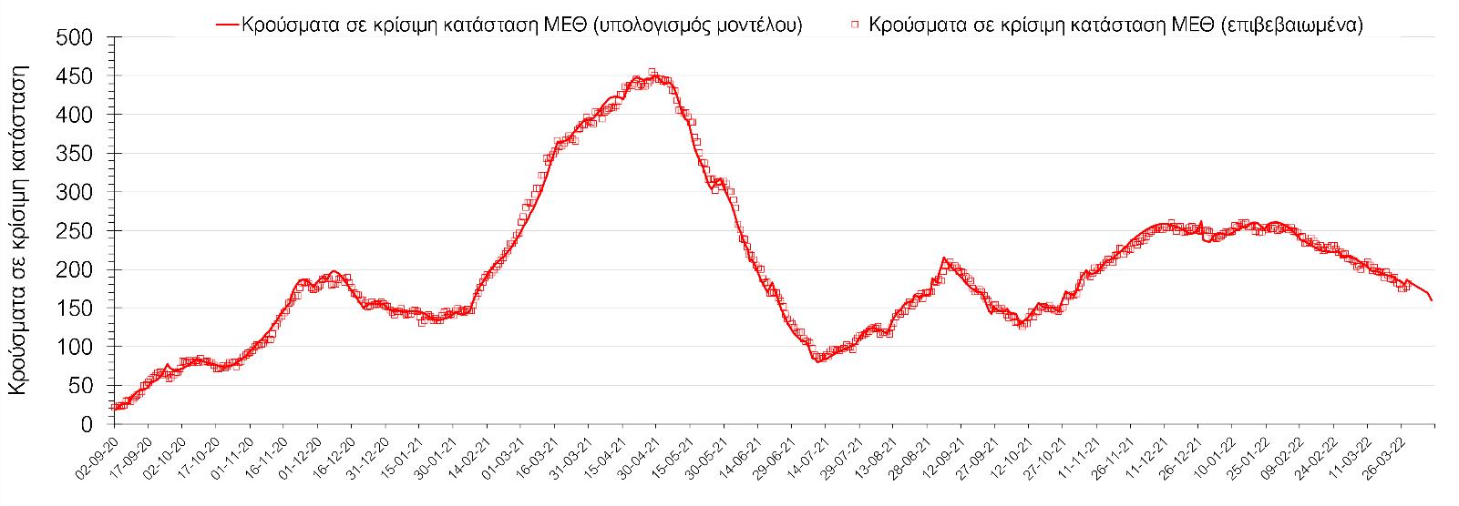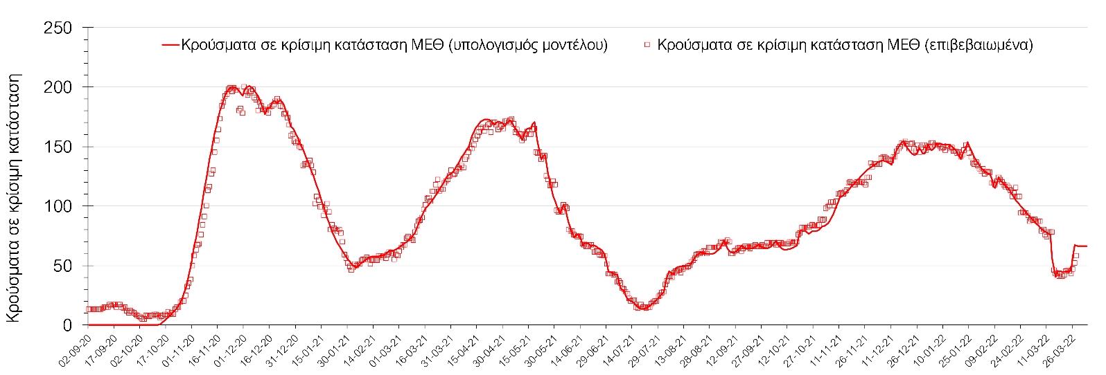 Όσον αφορά στους ασθενείς σε κρίσιμη κατάσταση (διασωληνωμένοι σε ΜΕΘ), ο αριθμός είναι ίδιος σε σχέση με την Κυριακή (342 από 342). Η καμπύλη εξέλιξης του αριθμού των ασθενών που νοσηλεύονται σε κλίνες ΜΕΘ με βάση τις προσομοιώσεις της πλατφόρμας CORE, παρουσιάζεται στο Σχήμα 1, των ασθενών που νοσηλεύονται σε απλές κλίνες στο Σχήμα 2, ενώ η εκτίμησή μας για την πορεία των θανάτων ανά ημέρα παρουσιάζεται στο Σχήμα 3.