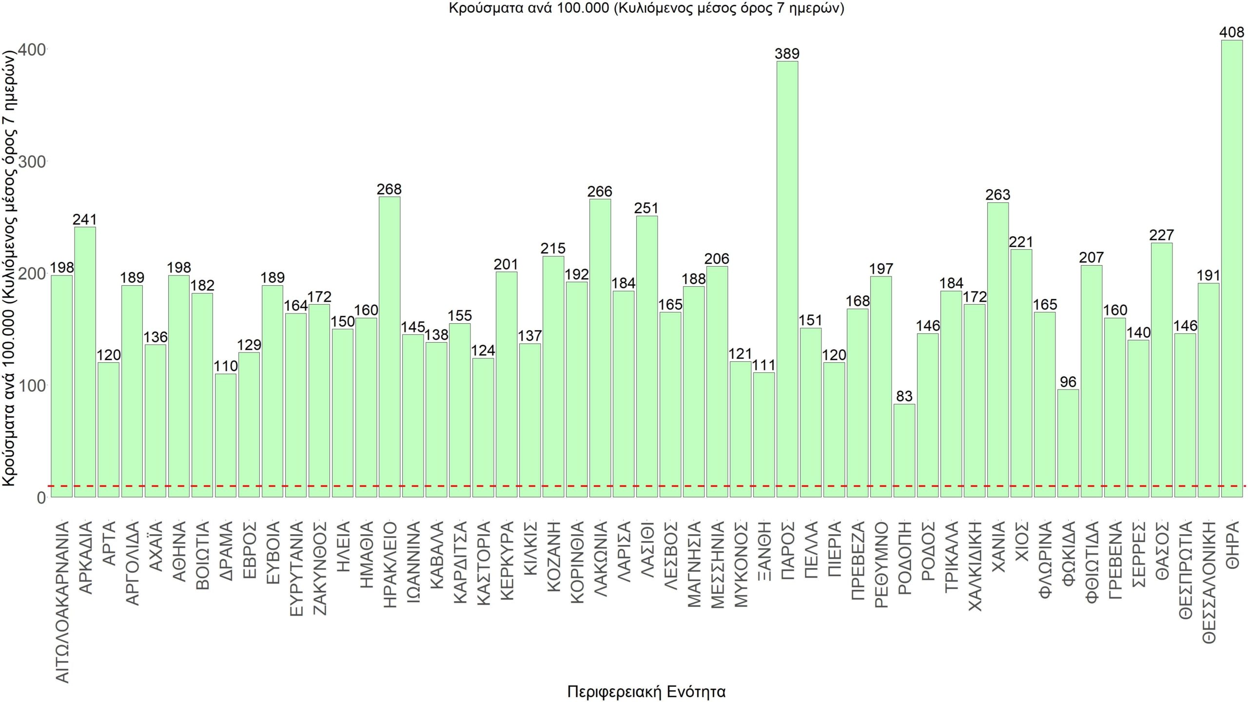 Σχήμα 60. Συγκεντρωτική εικόνα των νέων κρουσμάτων ανά 100.000 κατοίκους (κυλιόμενος μέσος όρος 7 ημερών) των επιμέρους περιοχών