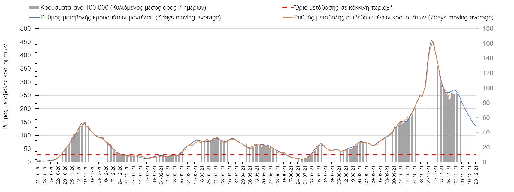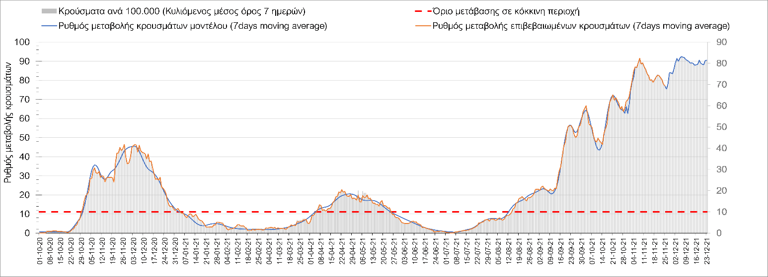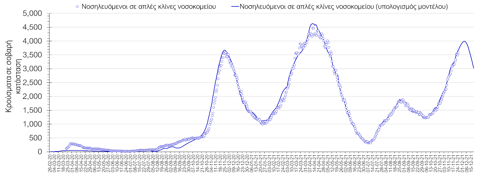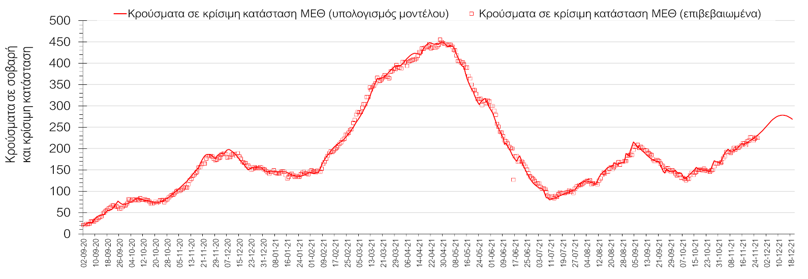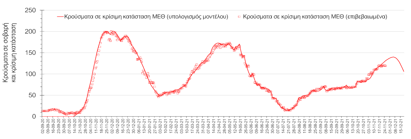 Η πορεία της μέσης εβδομαδιαίας τιμής των κρουσμάτων, καθώς και του κυλιόμενου μέσου όρου 7 ημερών του αριθμού των κρουσμάτων ανά 100.000 πληθυσμού, όπως έχουν καταγραφεί από τον ΕΟΔΥ και η αναμενόμενη πορεία τους όπως προδιαγράφεται από την υπολογιστική πλατφόρμα CORE για την Ελληνική επικράτεια μέχρι τις 15 Δεκεμβρίου, αποτυπώνονται στο Σχήμα 4. Αυτή η προβλεπόμενη πορεία, που αφορά τα κρούσματα, τους νοσηλευόμενους σε απλές κλίνες, όσο και σε ΜΕΘ, καθώς επίσης και τους θανάτους, βασίζεται στις ακόλουθες παραδοχές: