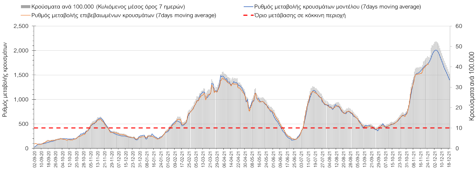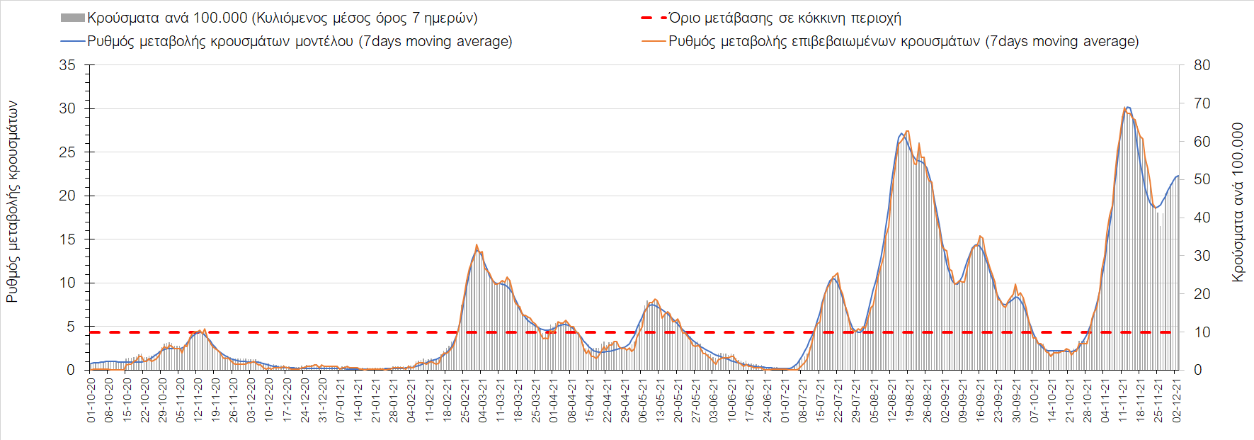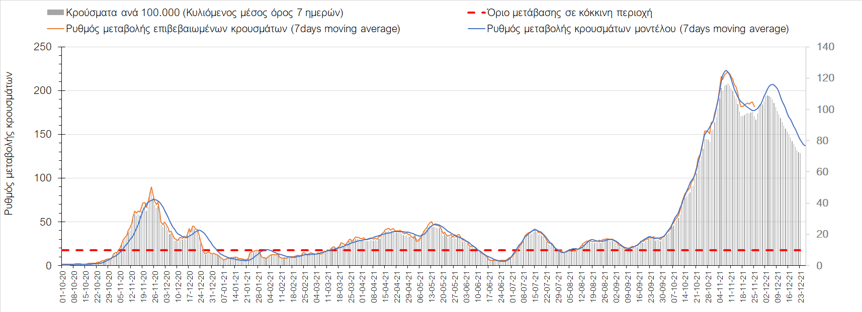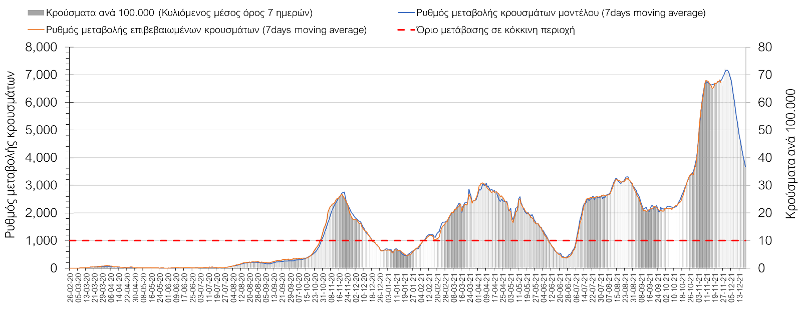 Η πορεία της μέσης εβδομαδιαίας τιμής των κρουσμάτων, καθώς και του κυλιόμενου μέσου όρου 7 ημερών του αριθμού των κρουσμάτων ανά 100.000 πληθυσμού, όπως έχουν καταγραφεί από τον ΕΟΔΥ και η αναμενόμενη πορεία τους όπως προδιαγράφεται από την υπολογιστική πλατφόρμα CORE για την Ελληνική επικράτεια μέχρι τις 15 Δεκεμβρίου, αποτυπώνονται στο Σχήμα 4. Αυτή η προβλεπόμενη πορεία, που αφορά τα κρούσματα, τους νοσηλευόμενους σε απλές κλίνες, όσο και σε ΜΕΘ, καθώς επίσης και τους θανάτους, βασίζεται στις ακόλουθες παραδοχές: