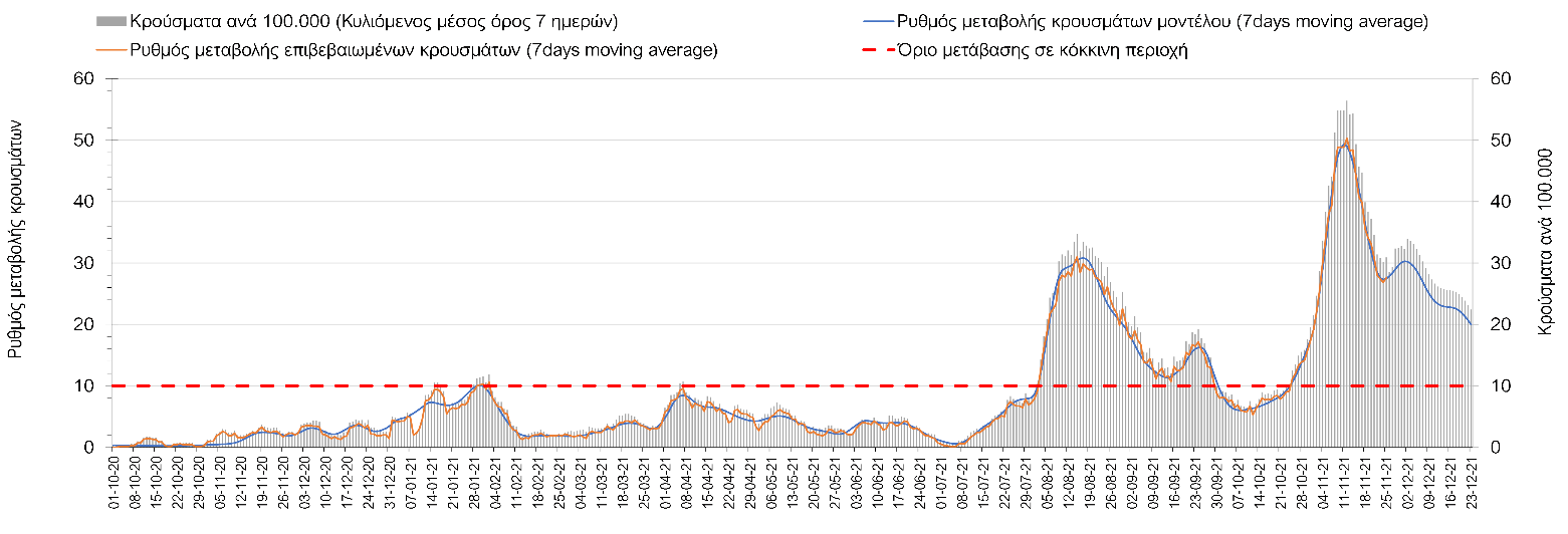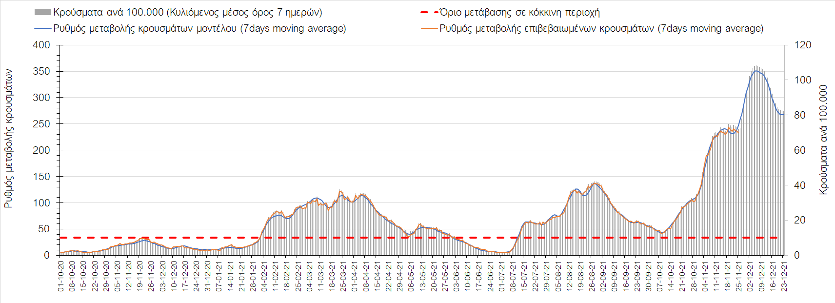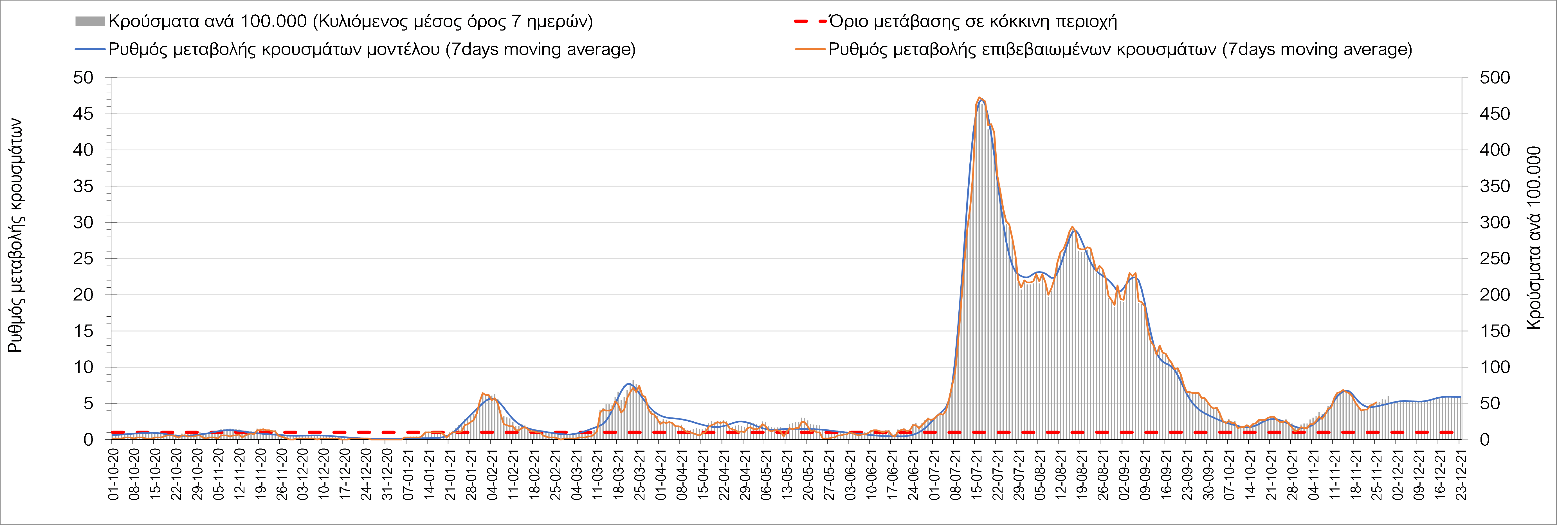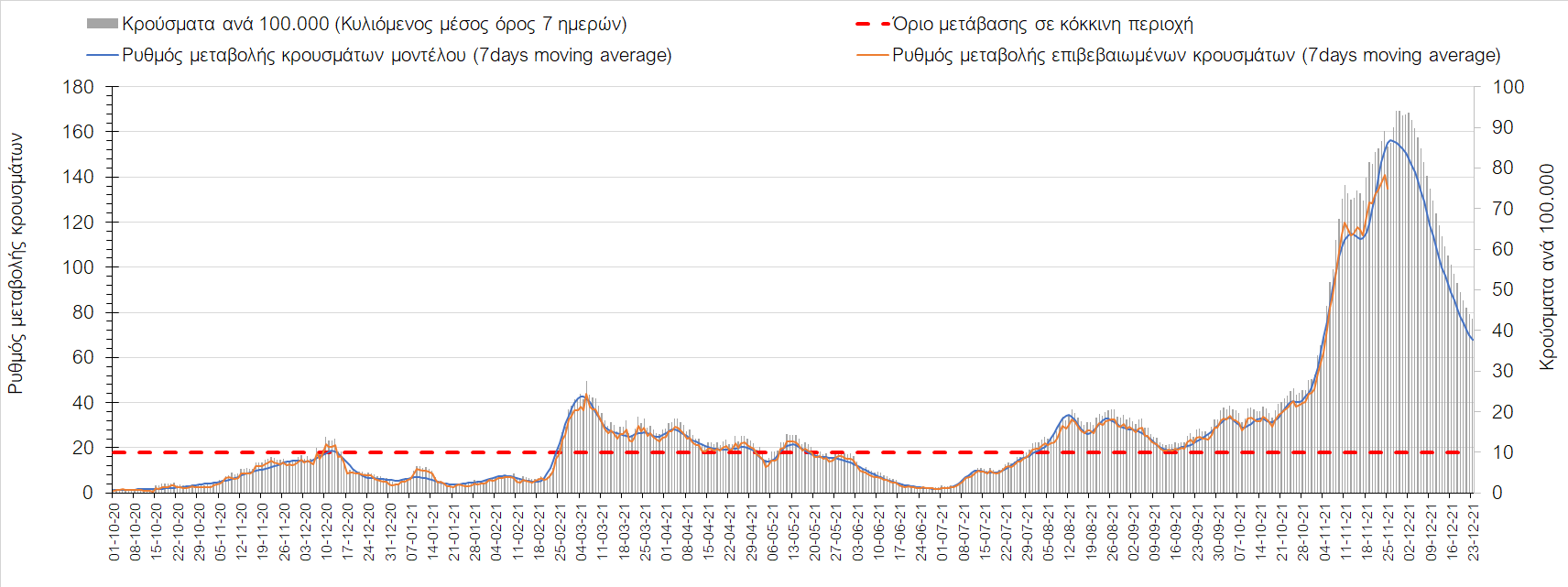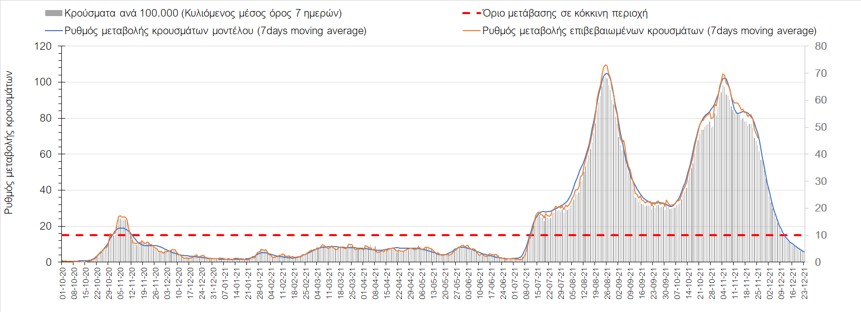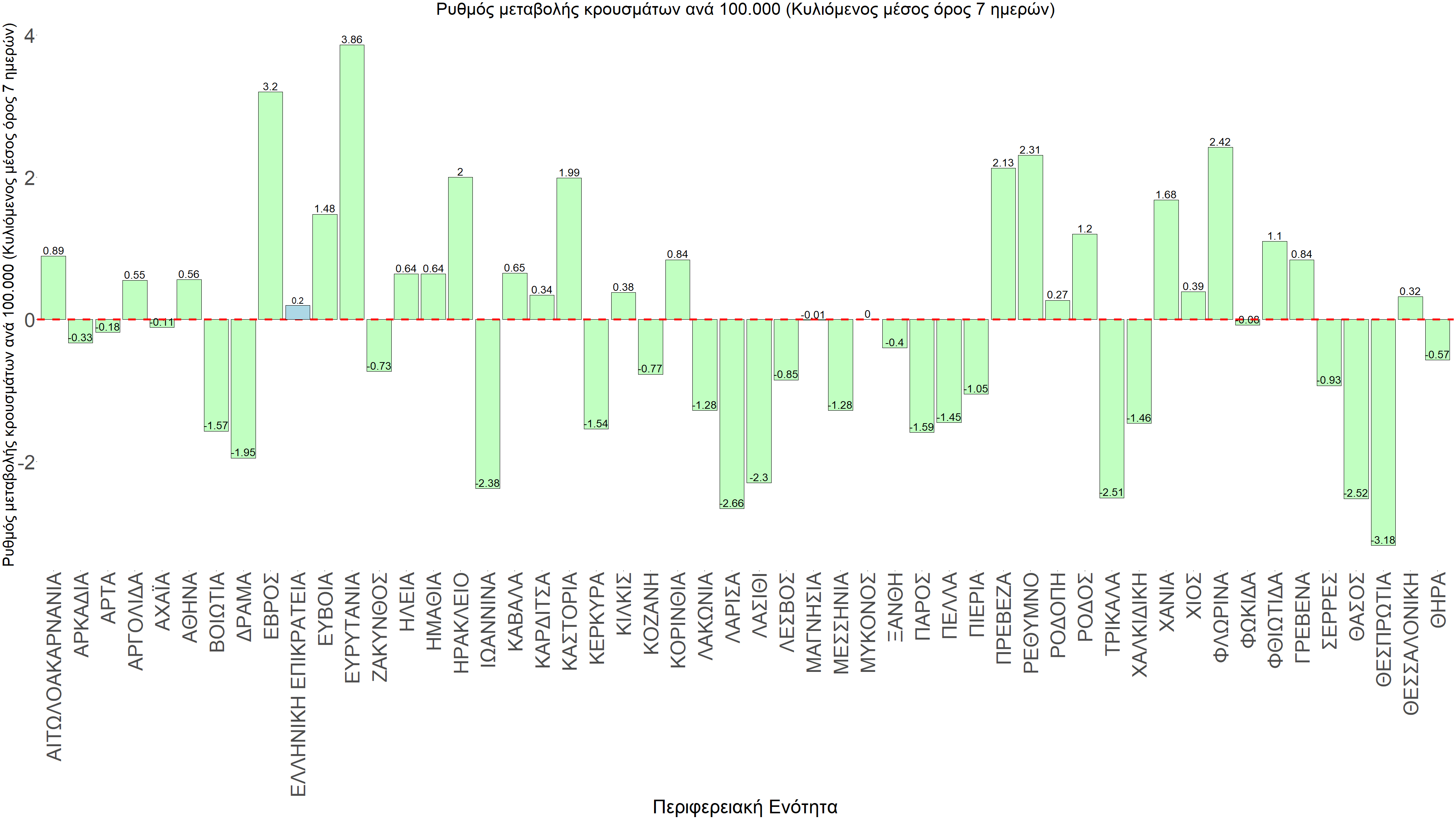 Η αποτύπωση των τάσεων στις επιμέρους περιοχές, παρουσιάζεται στο Σχήμα 61, όπου παρουσιάζεται ο ρυθμός μεταβολής των νέων κρουσμάτων ανά 100.000 κατοίκους (κυλιόμενος μέσος όρος 7 ημερών) των επιμέρους περιοχών. Θετικές τιμές του ρυθμού μεταβολής υποδηλώνουν άνοδο, ενώ αρνητικές τιμές υποδηλώνουν πτωτική πορεία. Το σχήμα αυτό είναι ιδιαίτερα κατατοπιστικό, γιατί οι τιμές που παρουσιάζονται είναι κανονικοποιημένες ως προς τον πληθυσμό, και η σύγκριση των τάσεων ανάμεσα στις επιμέρους περιοχές είναι άμεση.