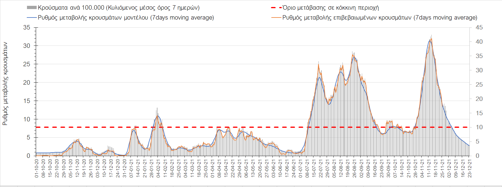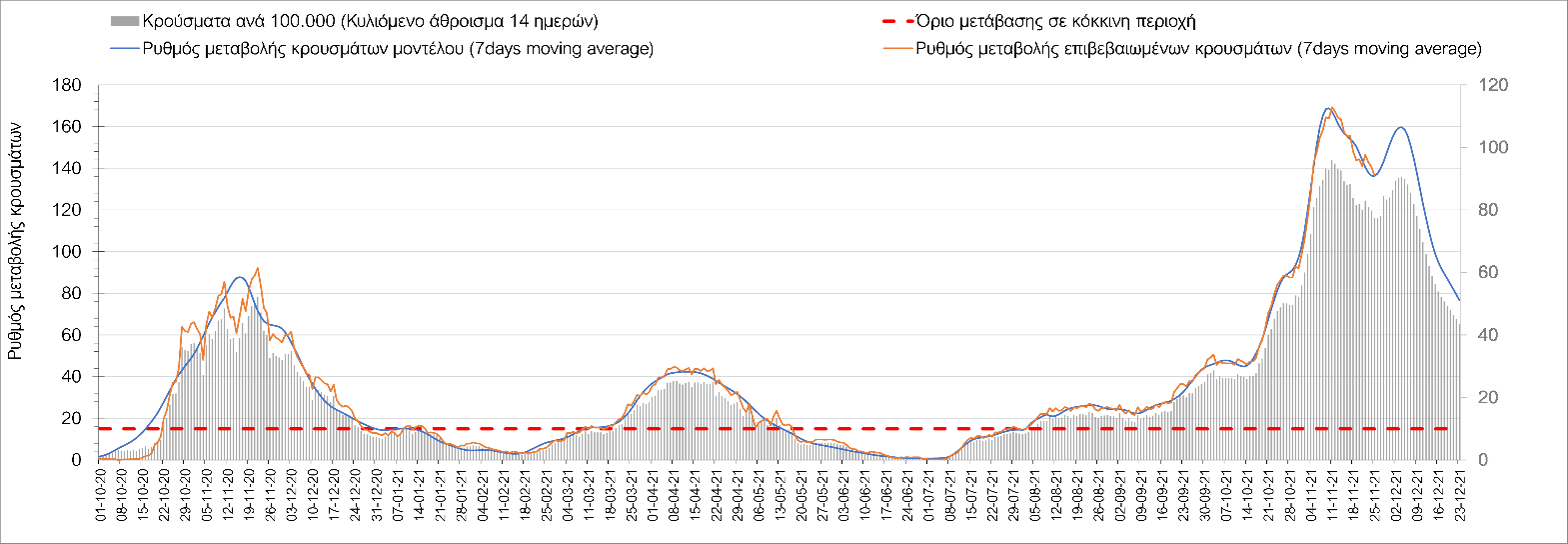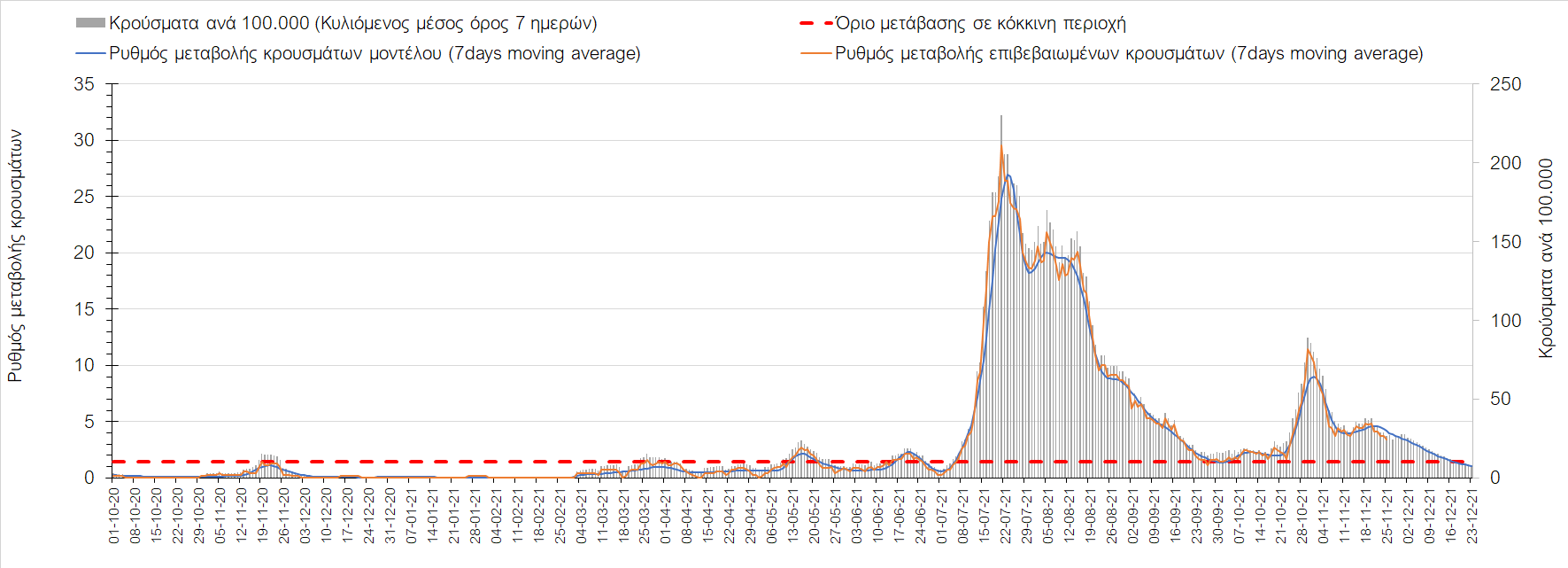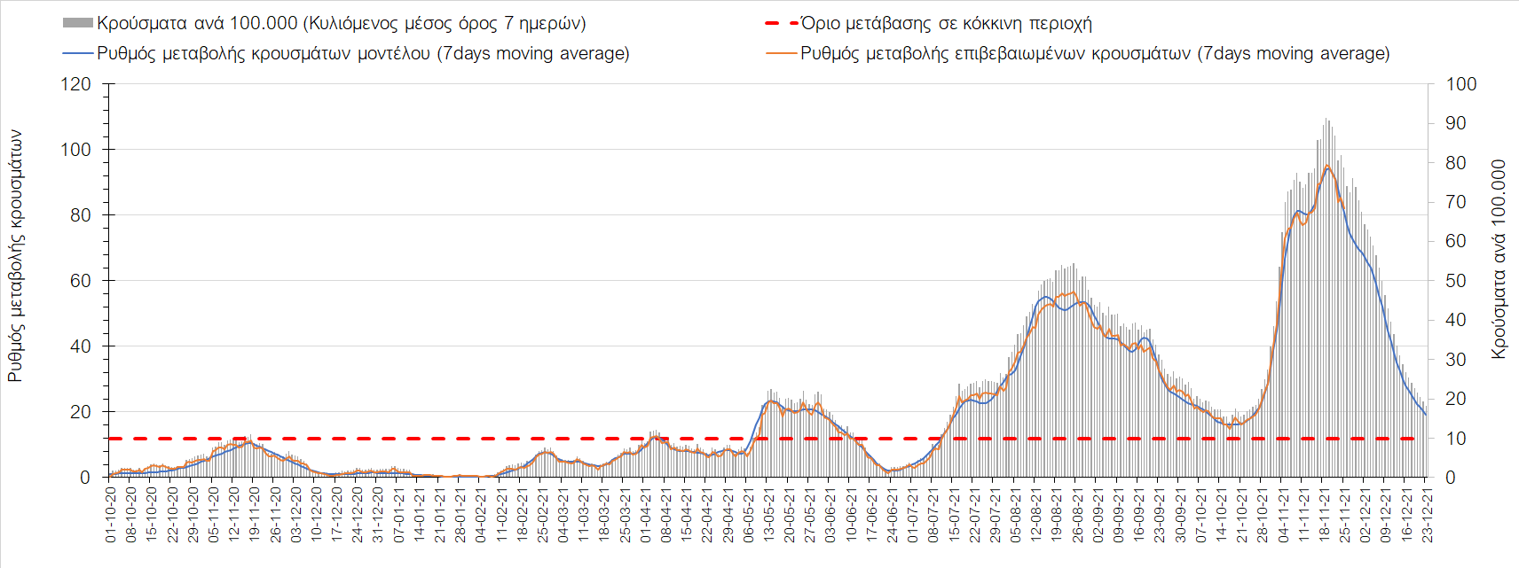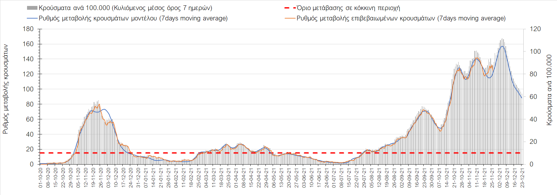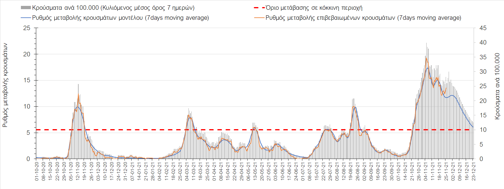 Η αποτύπωση των τάσεων στις επιμέρους περιοχές, παρουσιάζεται στο Σχήμα 61, όπου παρουσιάζεται ο ρυθμός μεταβολής των νέων κρουσμάτων ανά 100.000 κατοίκους (κυλιόμενος μέσος όρος 7 ημερών) των επιμέρους περιοχών. Θετικές τιμές του ρυθμού μεταβολής υποδηλώνουν άνοδο, ενώ αρνητικές τιμές υποδηλώνουν πτωτική πορεία. Το σχήμα αυτό είναι ιδιαίτερα κατατοπιστικό, γιατί οι τιμές που παρουσιάζονται είναι κανονικοποιημένες ως προς τον πληθυσμό, και η σύγκριση των τάσεων ανάμεσα στις επιμέρους περιοχές είναι άμεση.