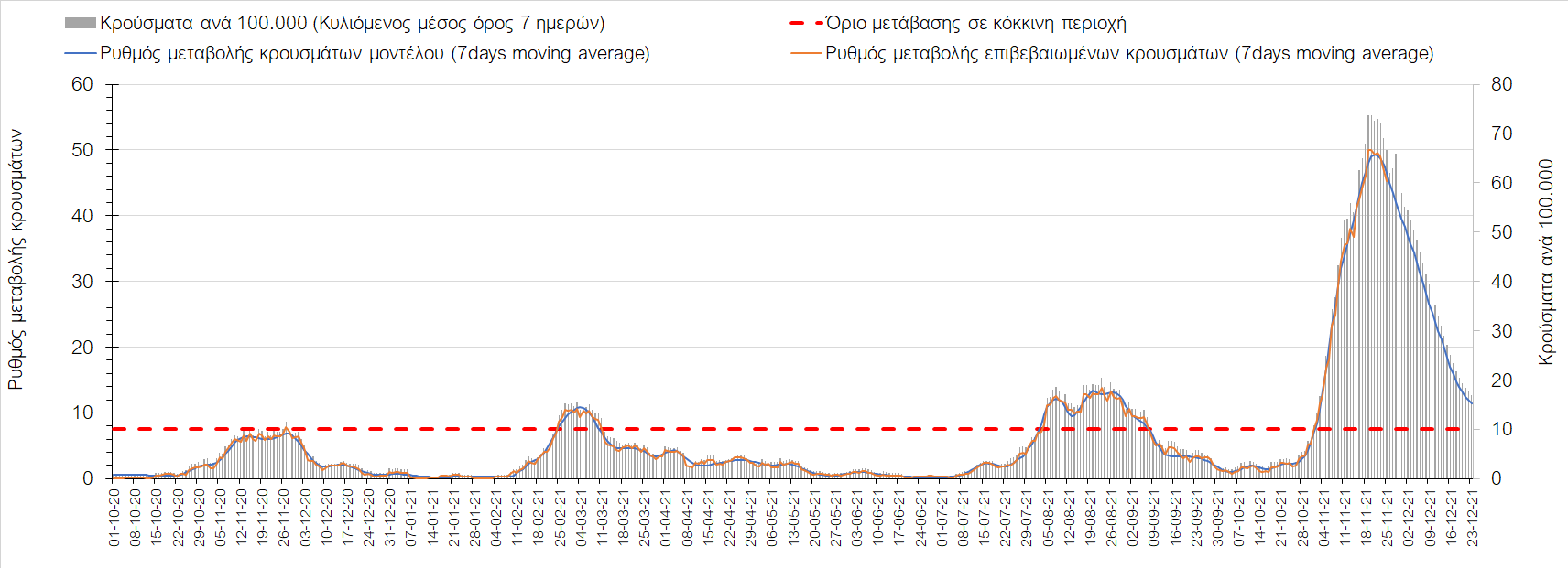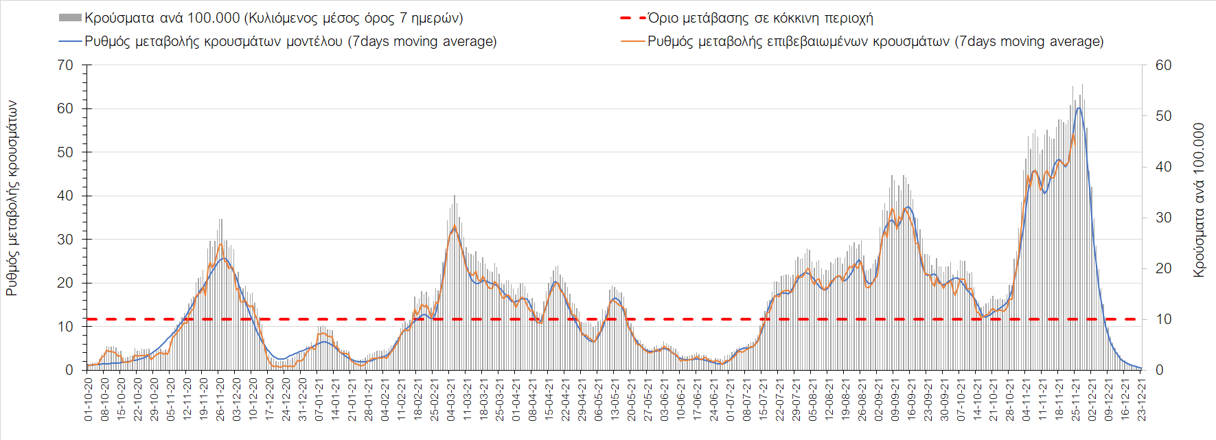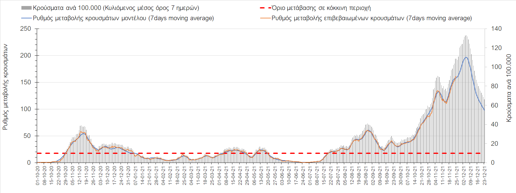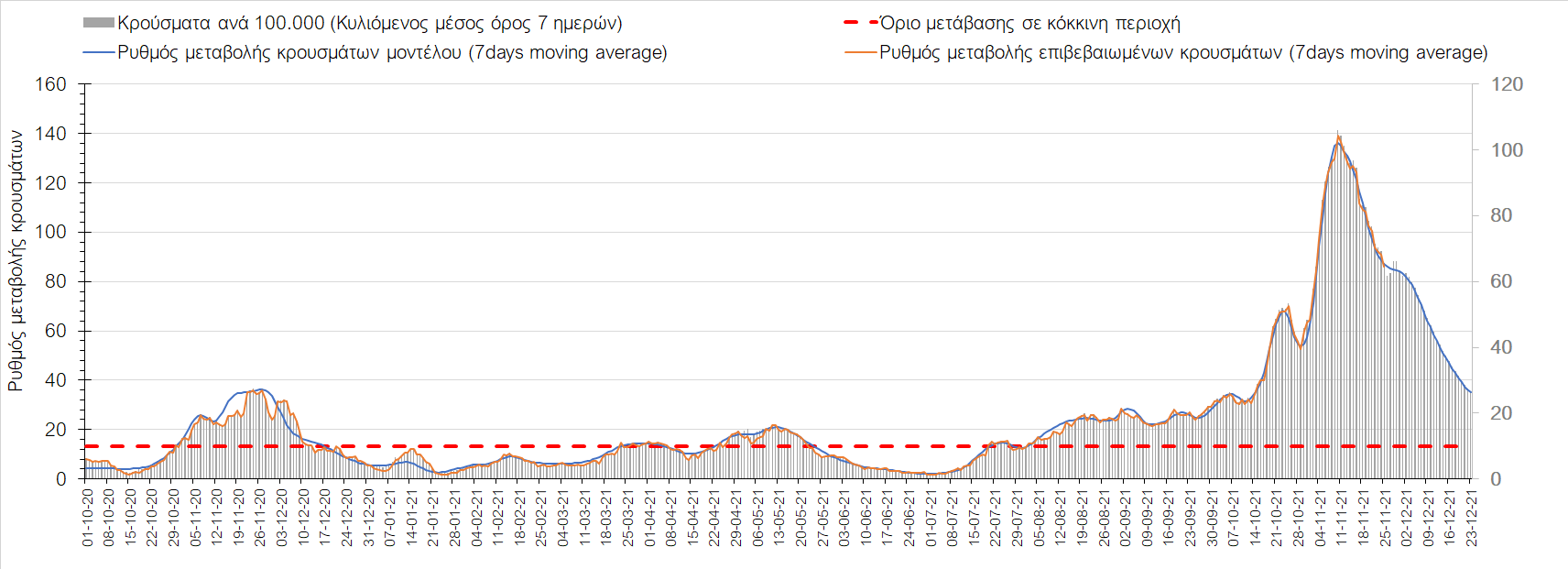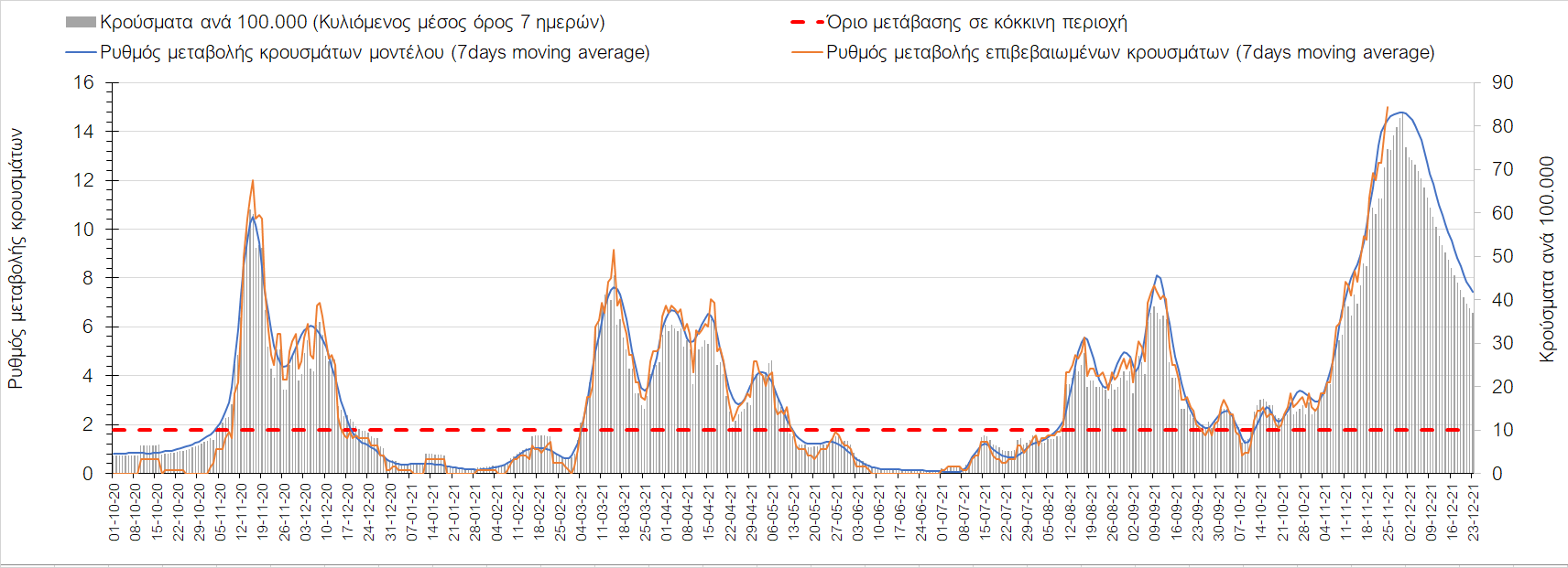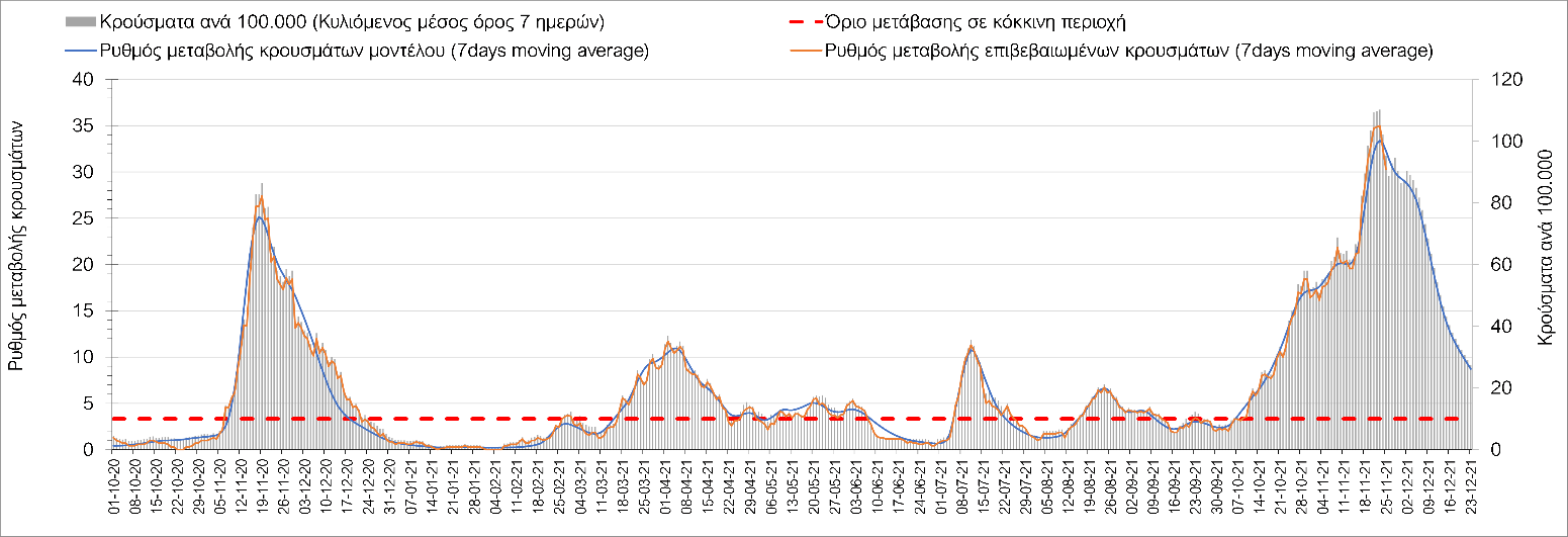 Η αποτύπωση των τάσεων στις επιμέρους περιοχές, παρουσιάζεται στο Σχήμα 61, όπου παρουσιάζεται ο ρυθμός μεταβολής των νέων κρουσμάτων ανά 100.000 κατοίκους (κυλιόμενος μέσος όρος 7 ημερών) των επιμέρους περιοχών. Θετικές τιμές του ρυθμού μεταβολής υποδηλώνουν άνοδο, ενώ αρνητικές τιμές υποδηλώνουν πτωτική πορεία. Το σχήμα αυτό είναι ιδιαίτερα κατατοπιστικό, γιατί οι τιμές που παρουσιάζονται είναι κανονικοποιημένες ως προς τον πληθυσμό, και η σύγκριση των τάσεων ανάμεσα στις επιμέρους περιοχές είναι άμεση.