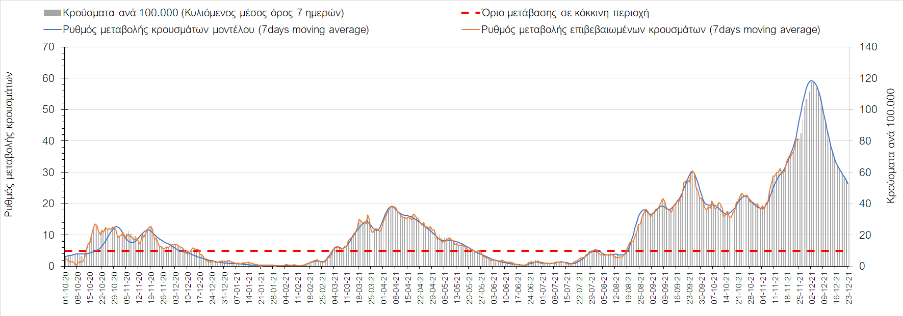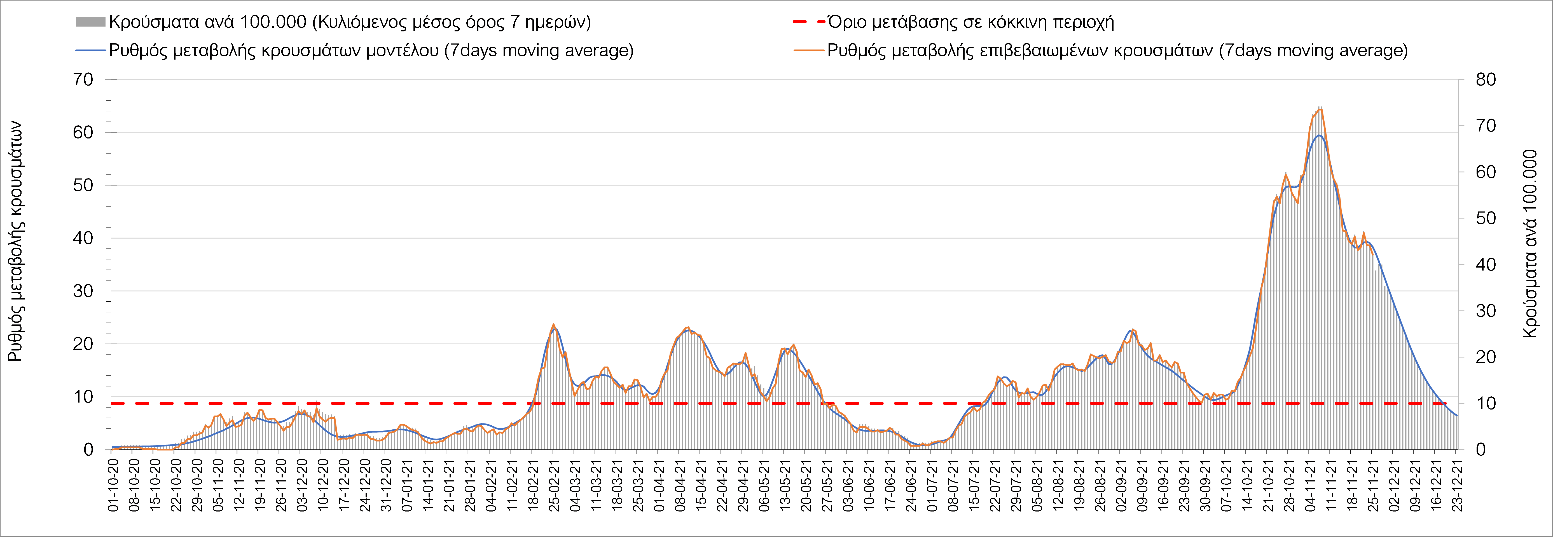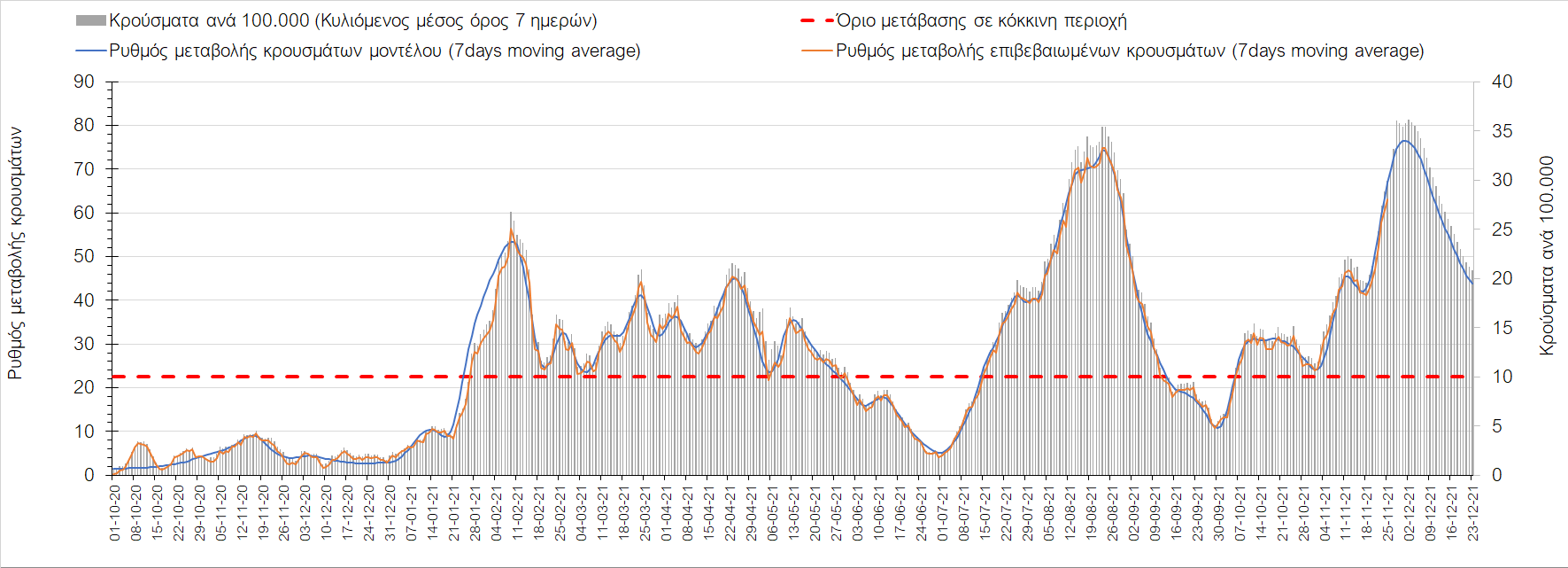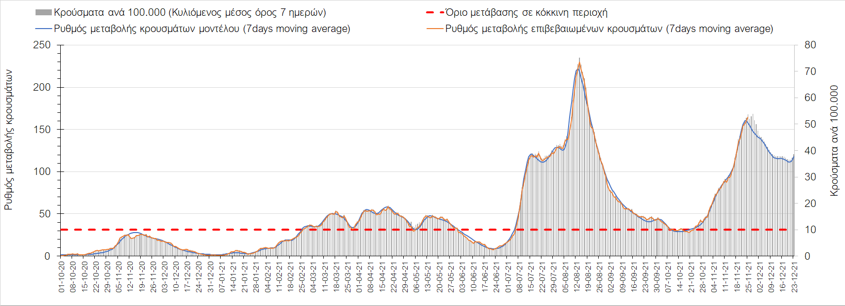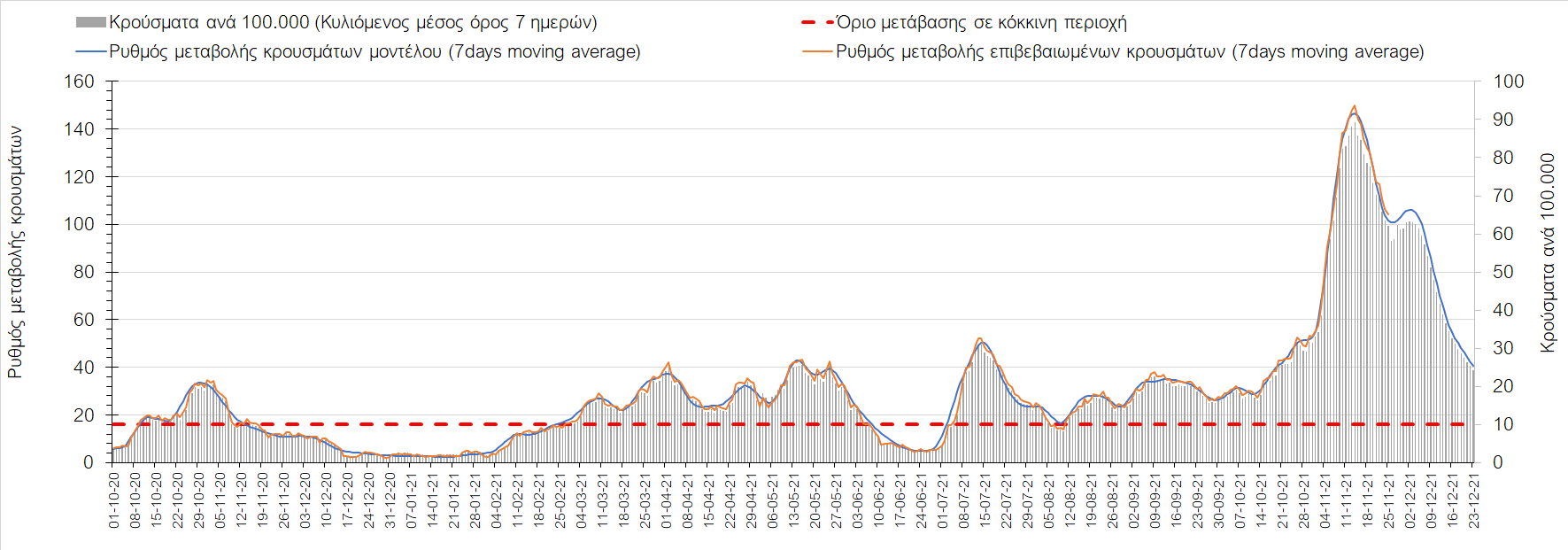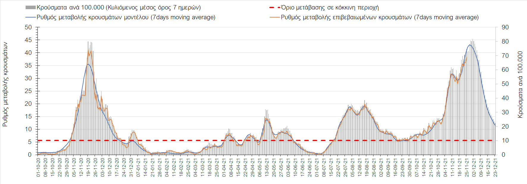 Η αποτύπωση των τάσεων στις επιμέρους περιοχές, παρουσιάζεται στο Σχήμα 61, όπου παρουσιάζεται ο ρυθμός μεταβολής των νέων κρουσμάτων ανά 100.000 κατοίκους (κυλιόμενος μέσος όρος 7 ημερών) των επιμέρους περιοχών. Θετικές τιμές του ρυθμού μεταβολής υποδηλώνουν άνοδο, ενώ αρνητικές τιμές υποδηλώνουν πτωτική πορεία. Το σχήμα αυτό είναι ιδιαίτερα κατατοπιστικό, γιατί οι τιμές που παρουσιάζονται είναι κανονικοποιημένες ως προς τον πληθυσμό, και η σύγκριση των τάσεων ανάμεσα στις επιμέρους περιοχές είναι άμεση.